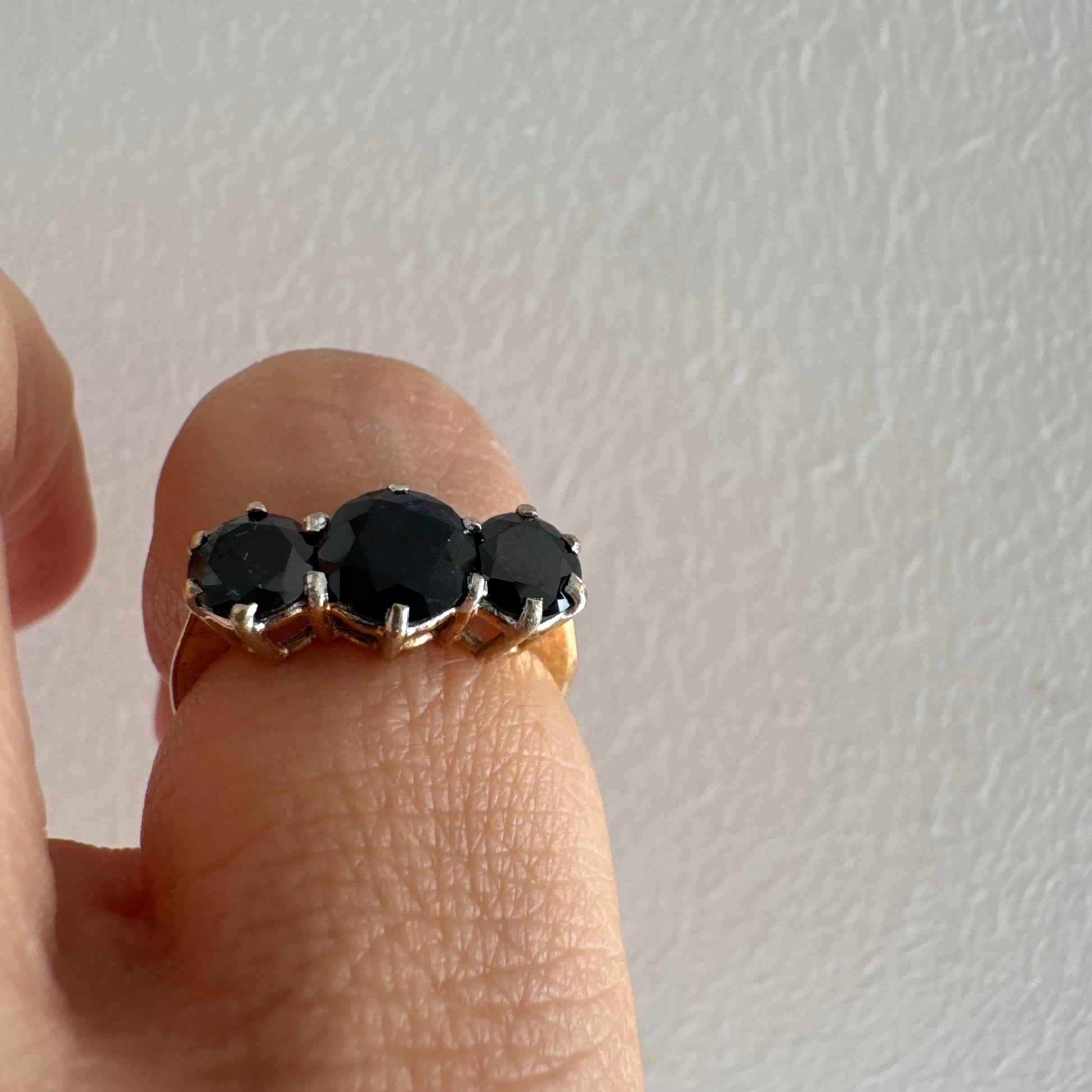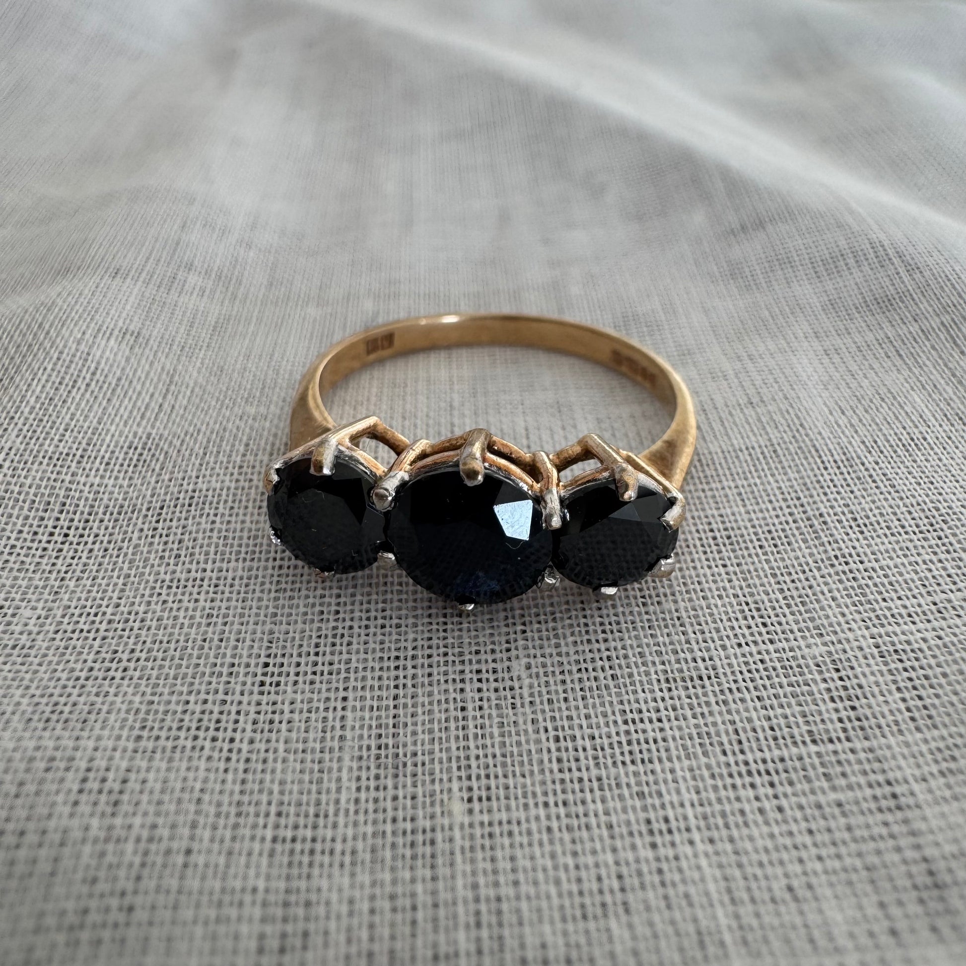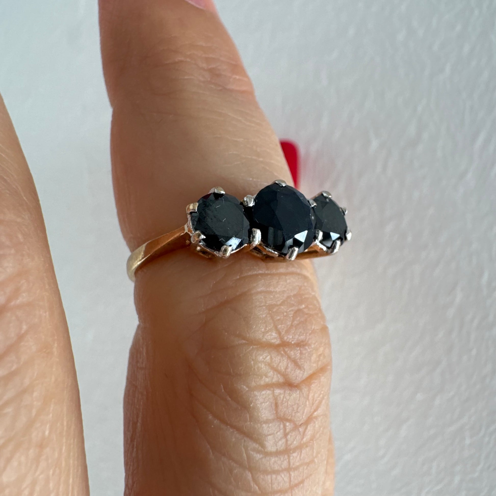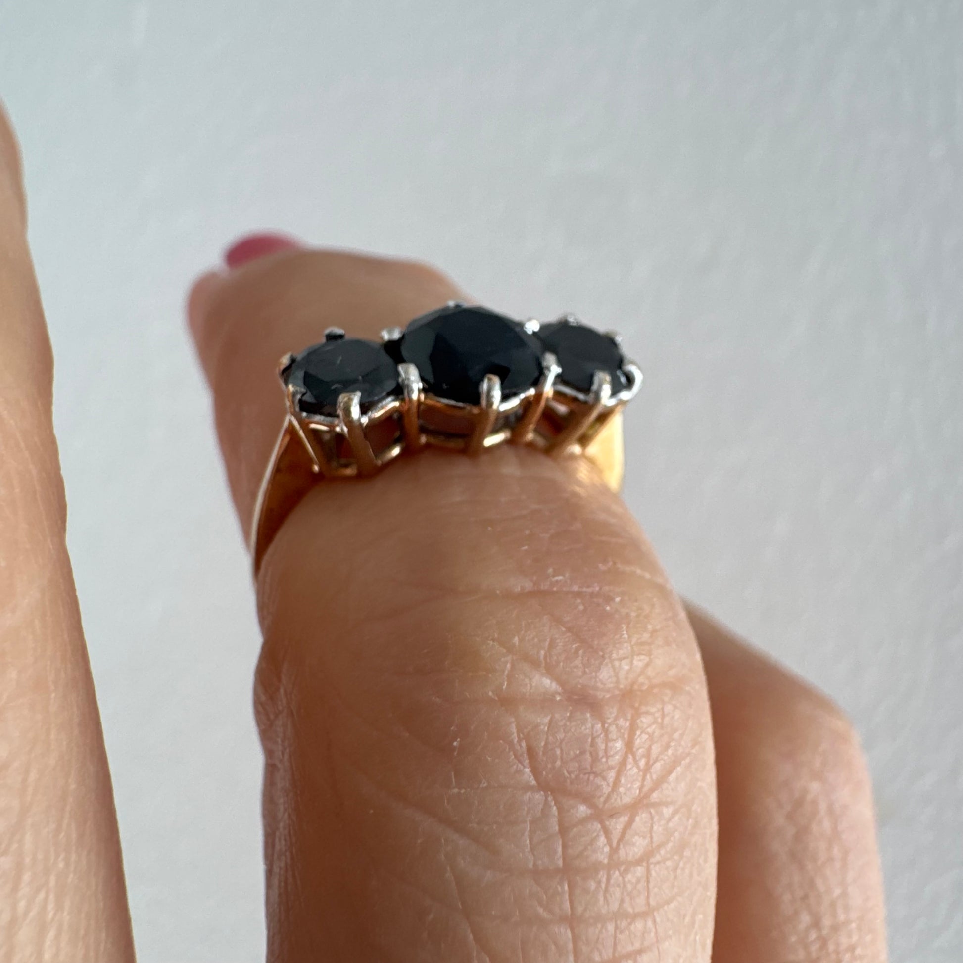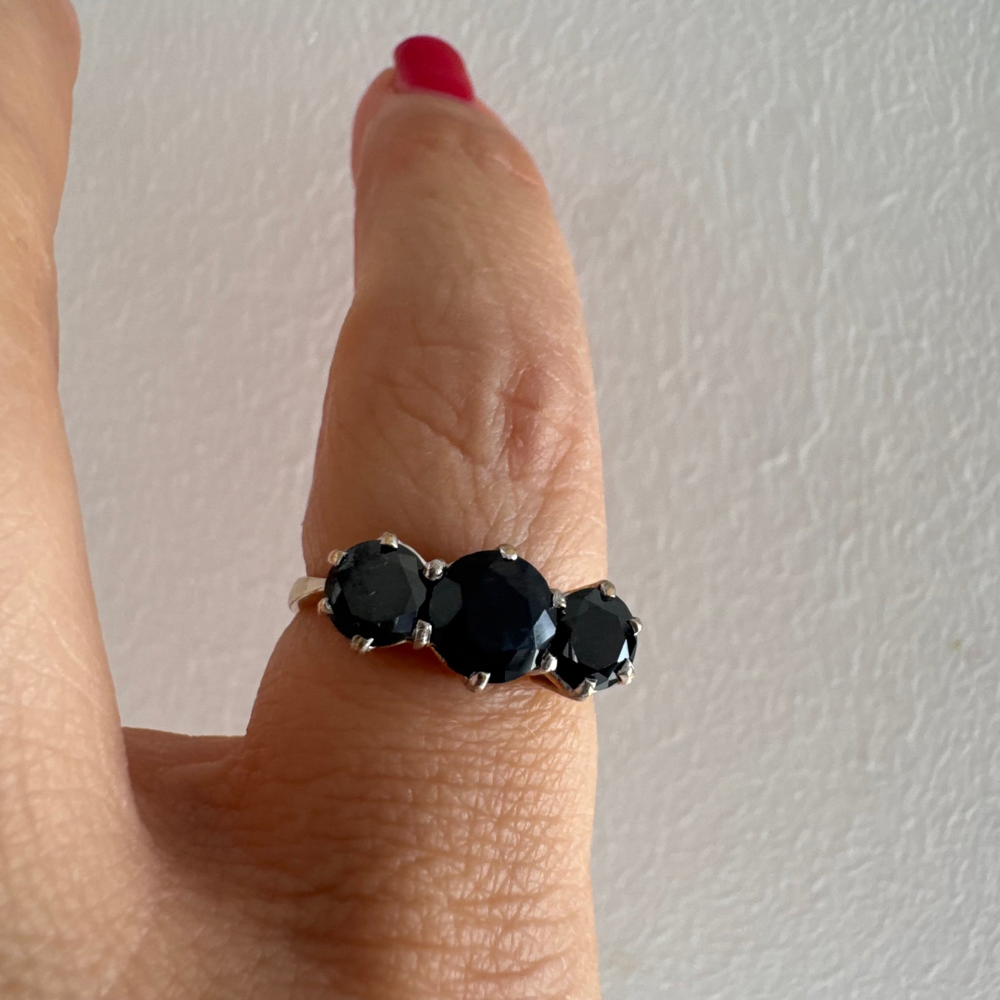 טבעת זהב 10 קראט משובצת שלוש אבני ספיר בצבע כחול כהה בחיתוך עגול, בעיצוב קלאסי עם נוכחות עמוקה ואלגנטית.
