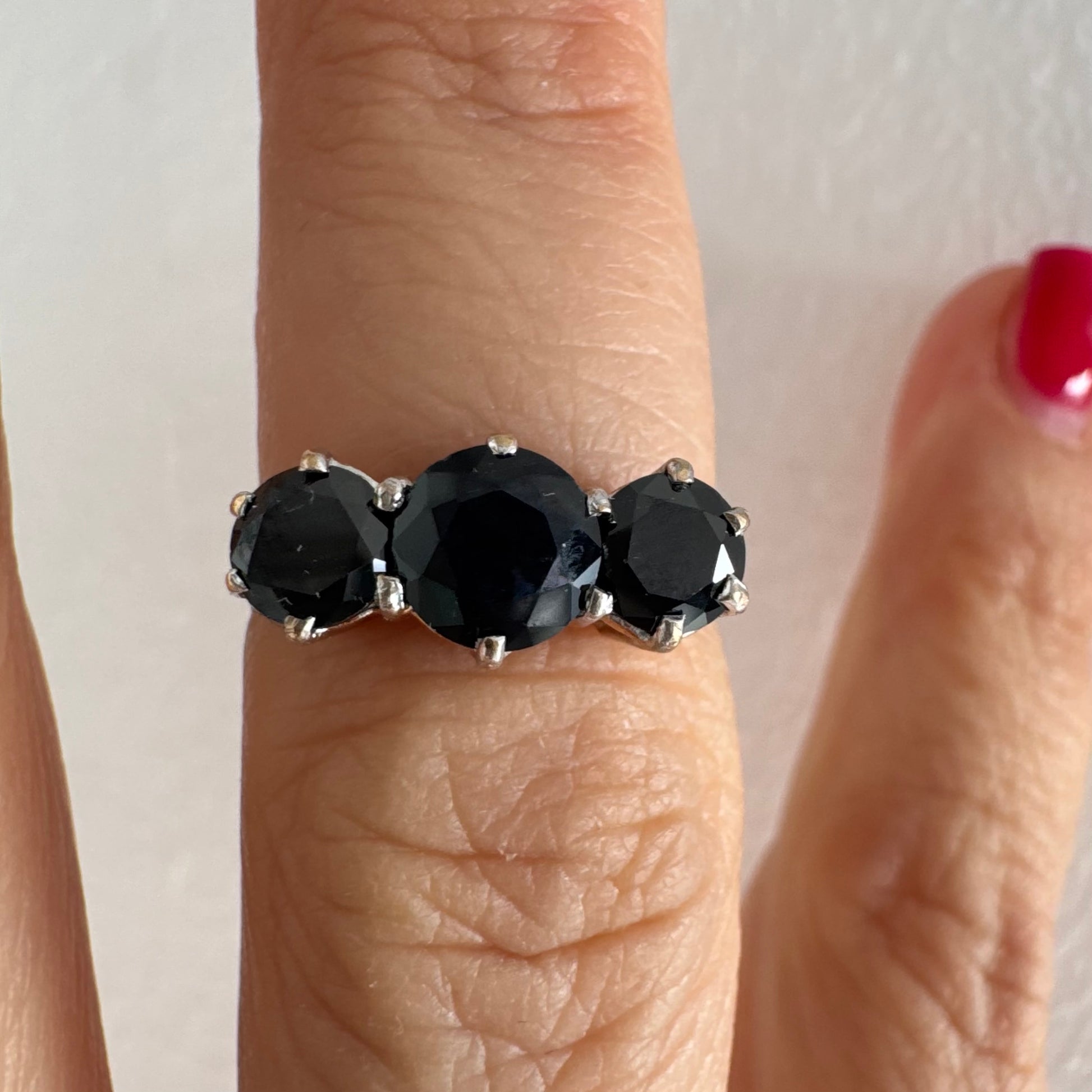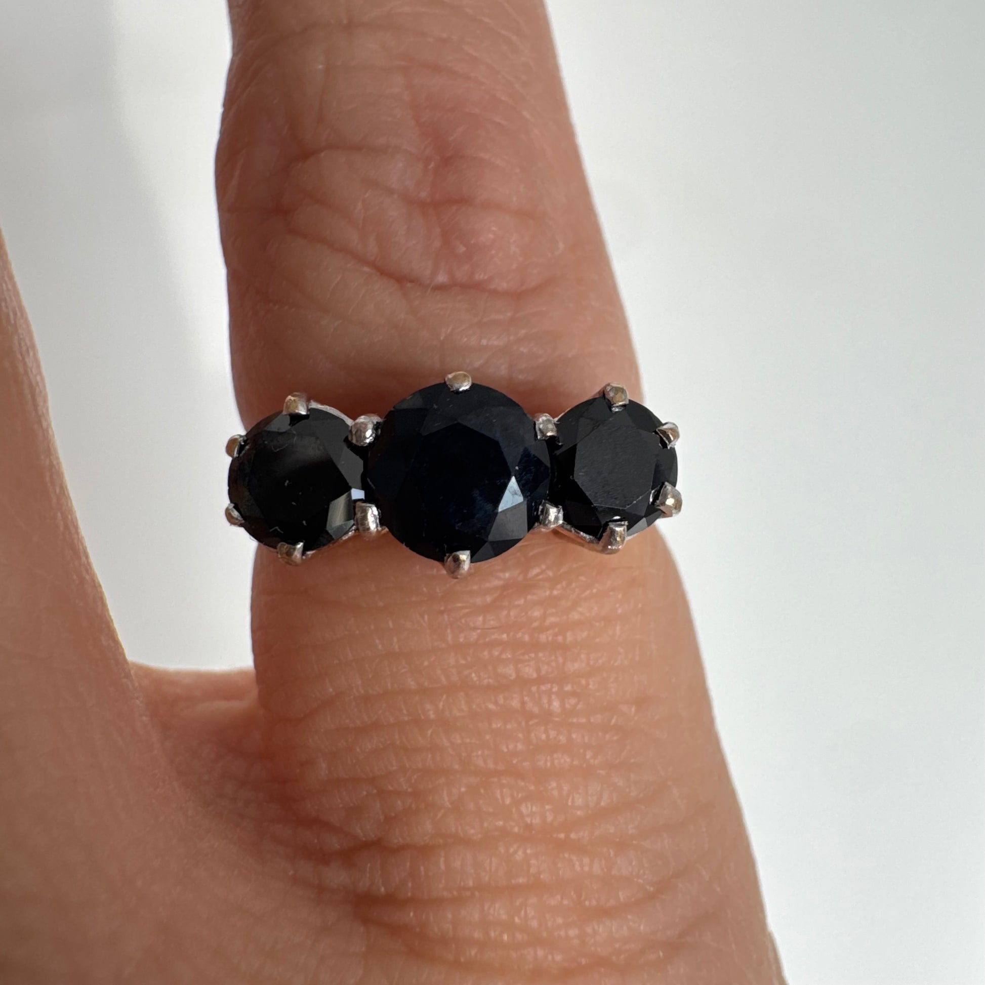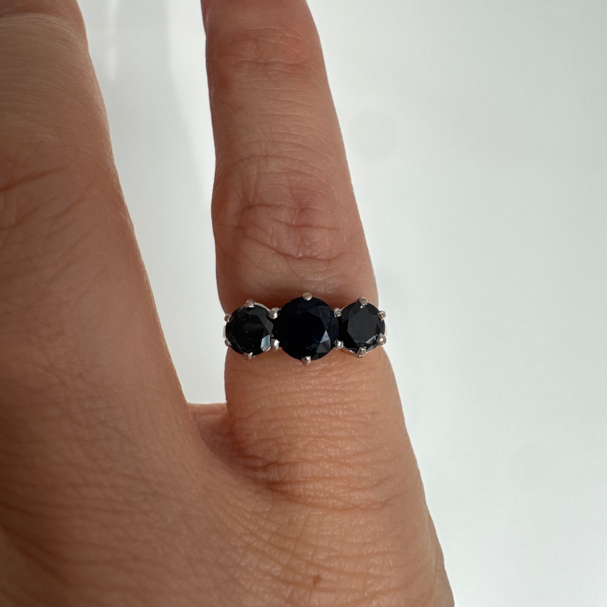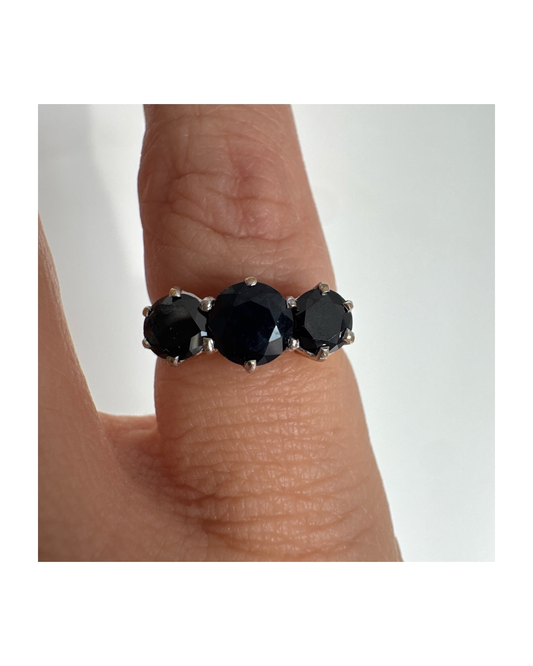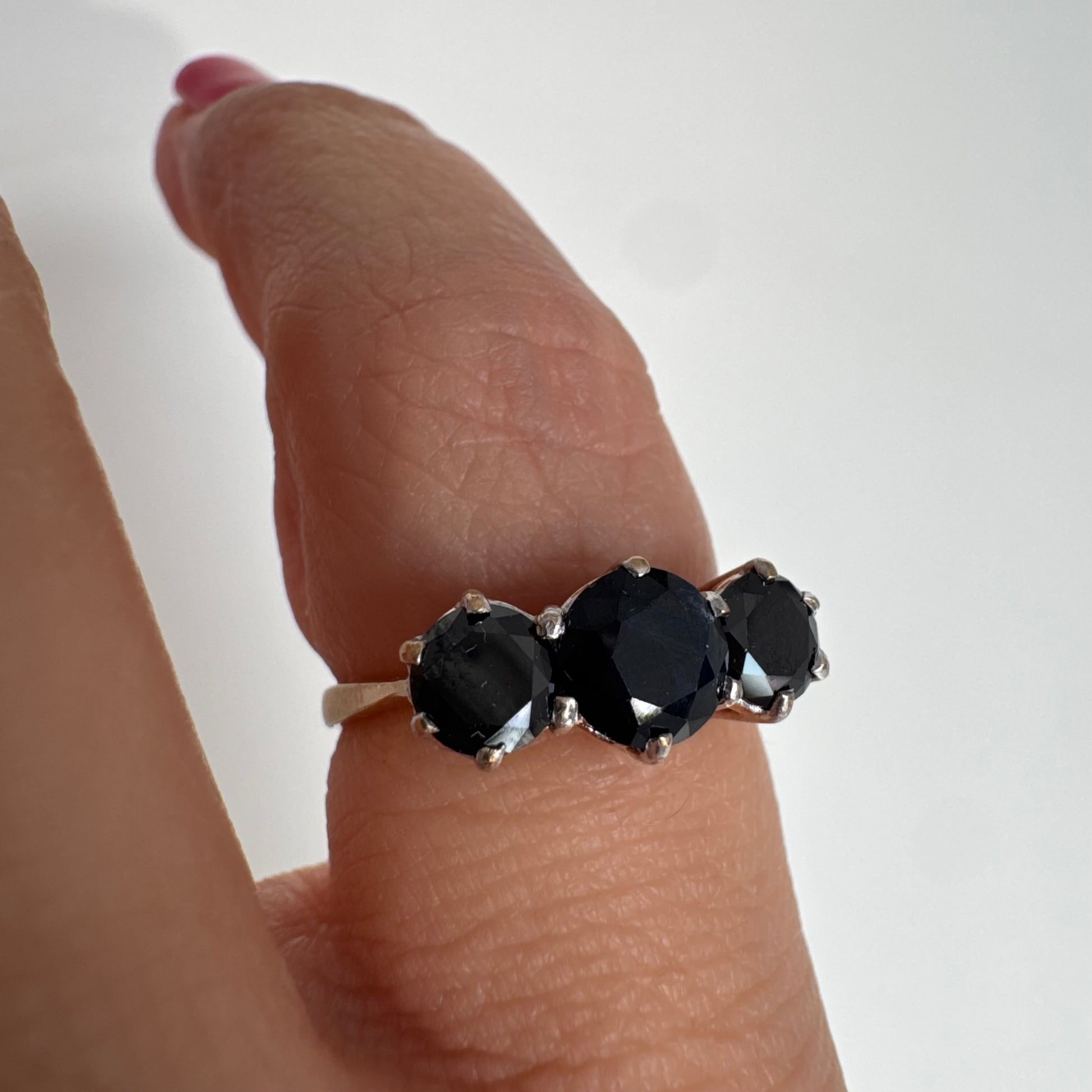 טבעת זהב 10 קראט משובצת שלוש אבני ספיר בצבע כחול כהה בחיתוך עגול, בעיצוב קלאסי עם נוכחות עמוקה ואלגנטית.