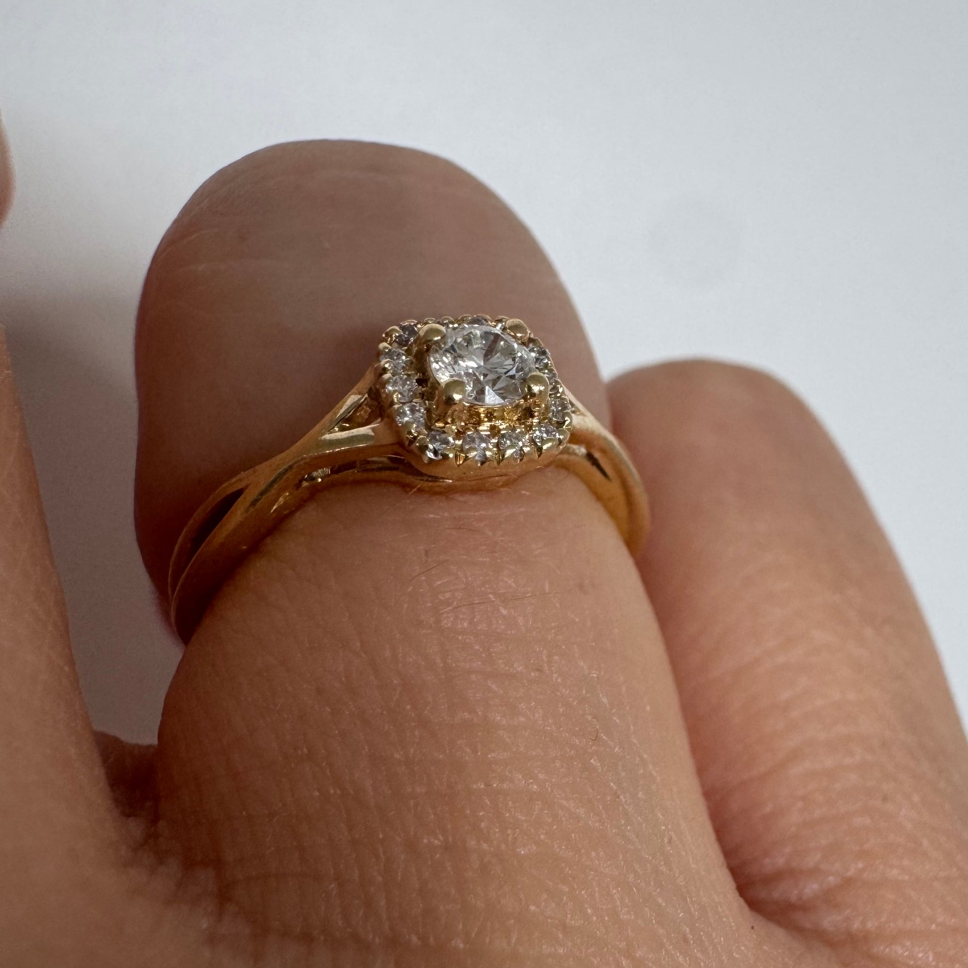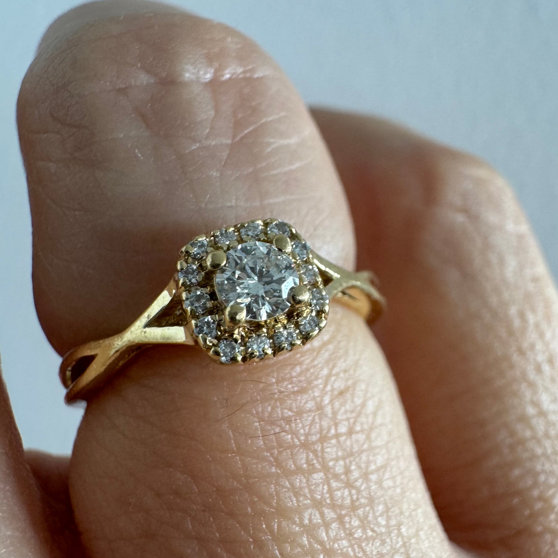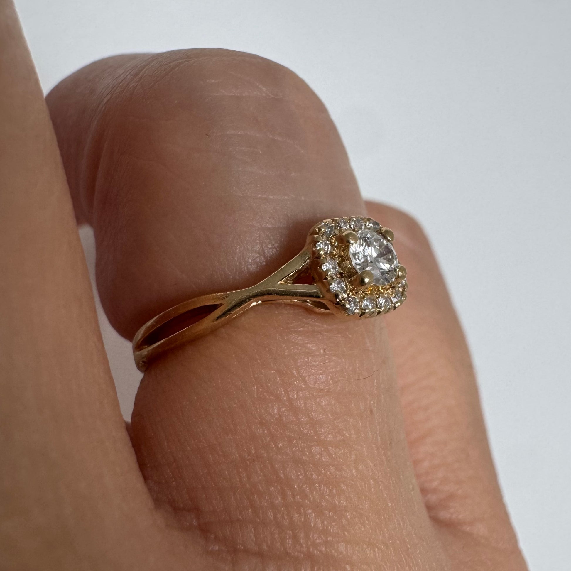 טבעת זהב 14 קראט משובצת יהלום מרכזי עגול ומבריק, מוקף הילה עדינה של יהלומים המעצימים את הברק
