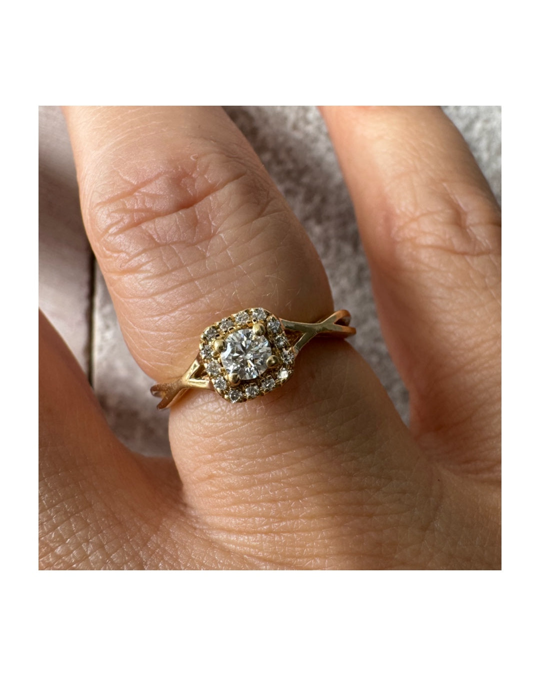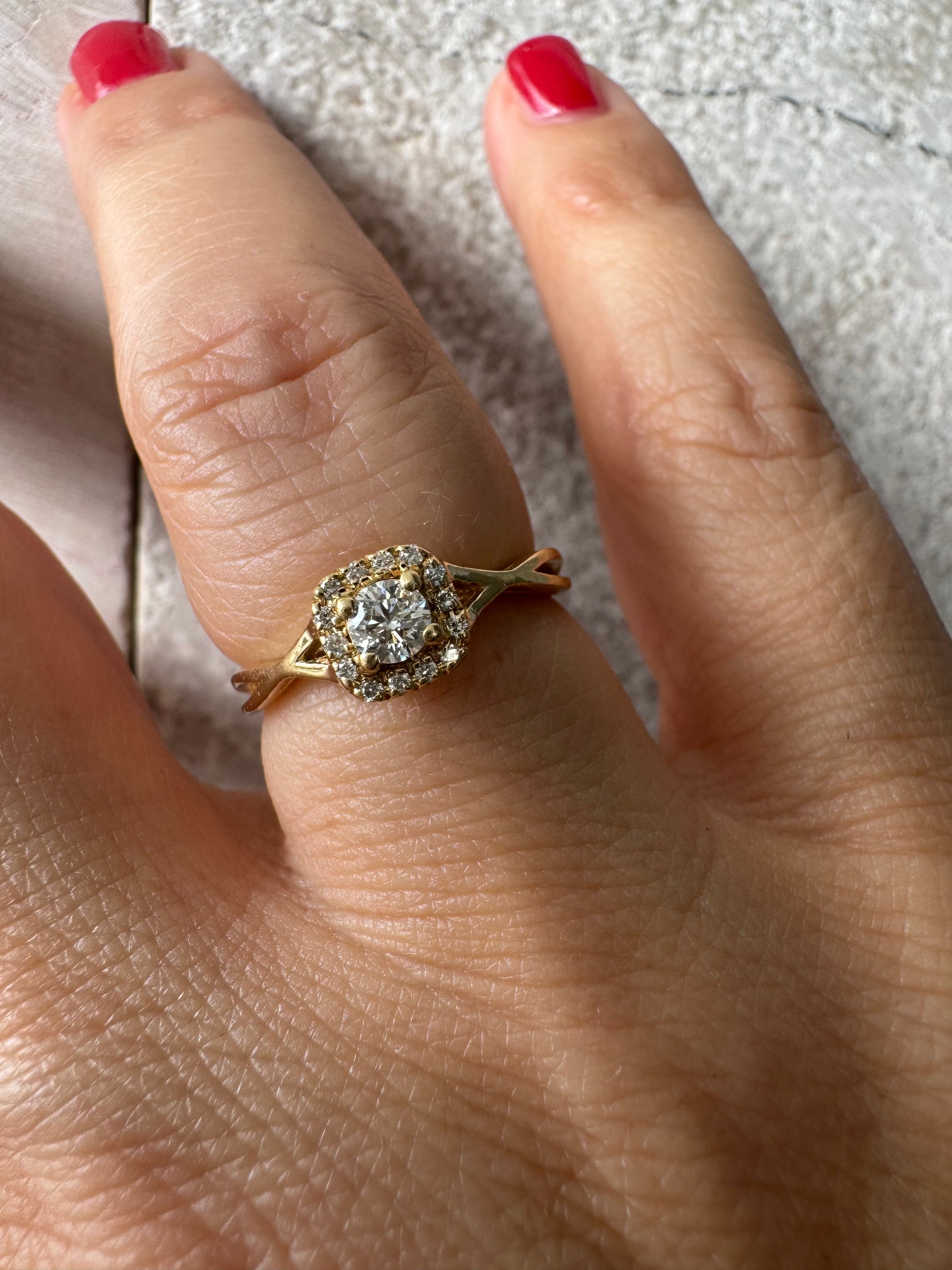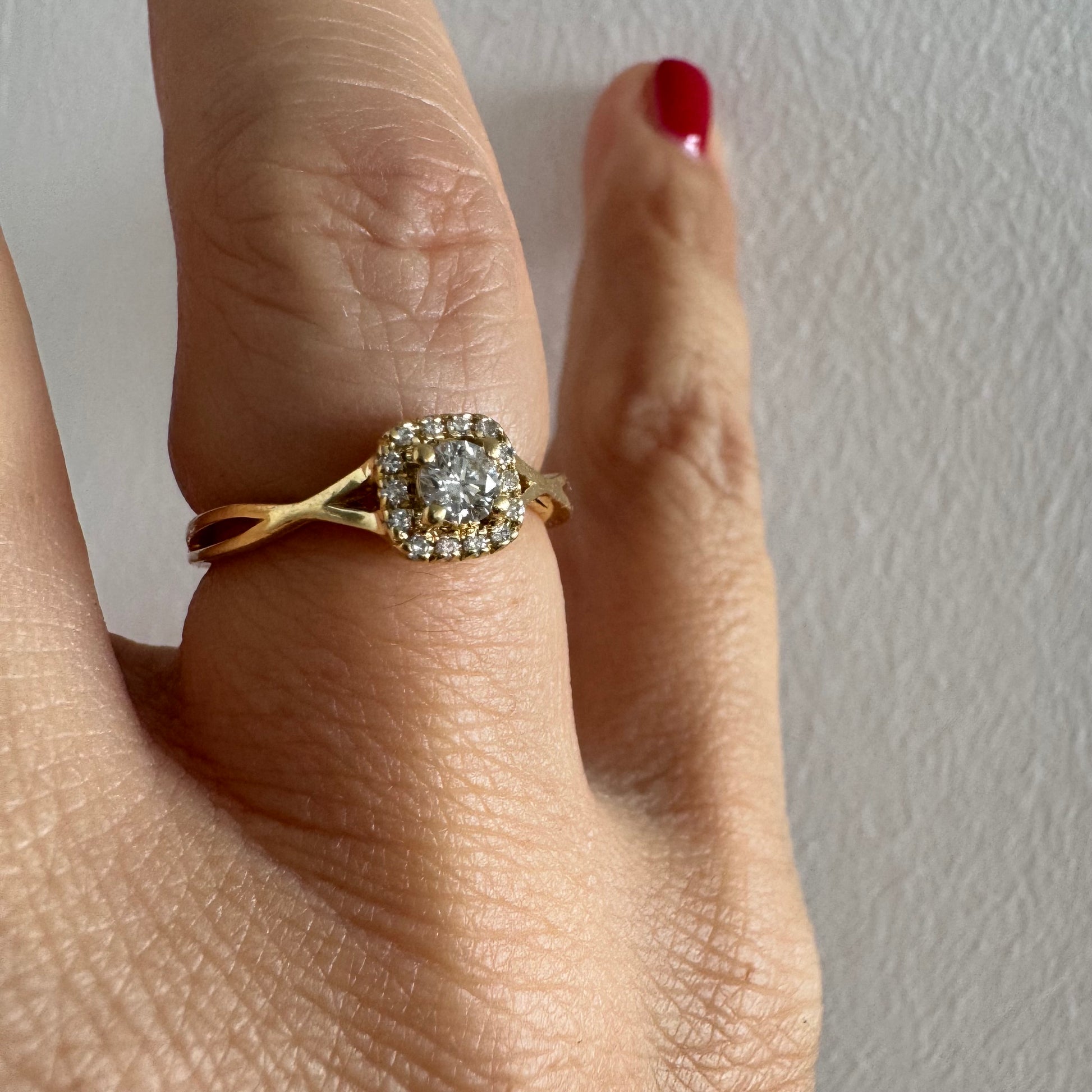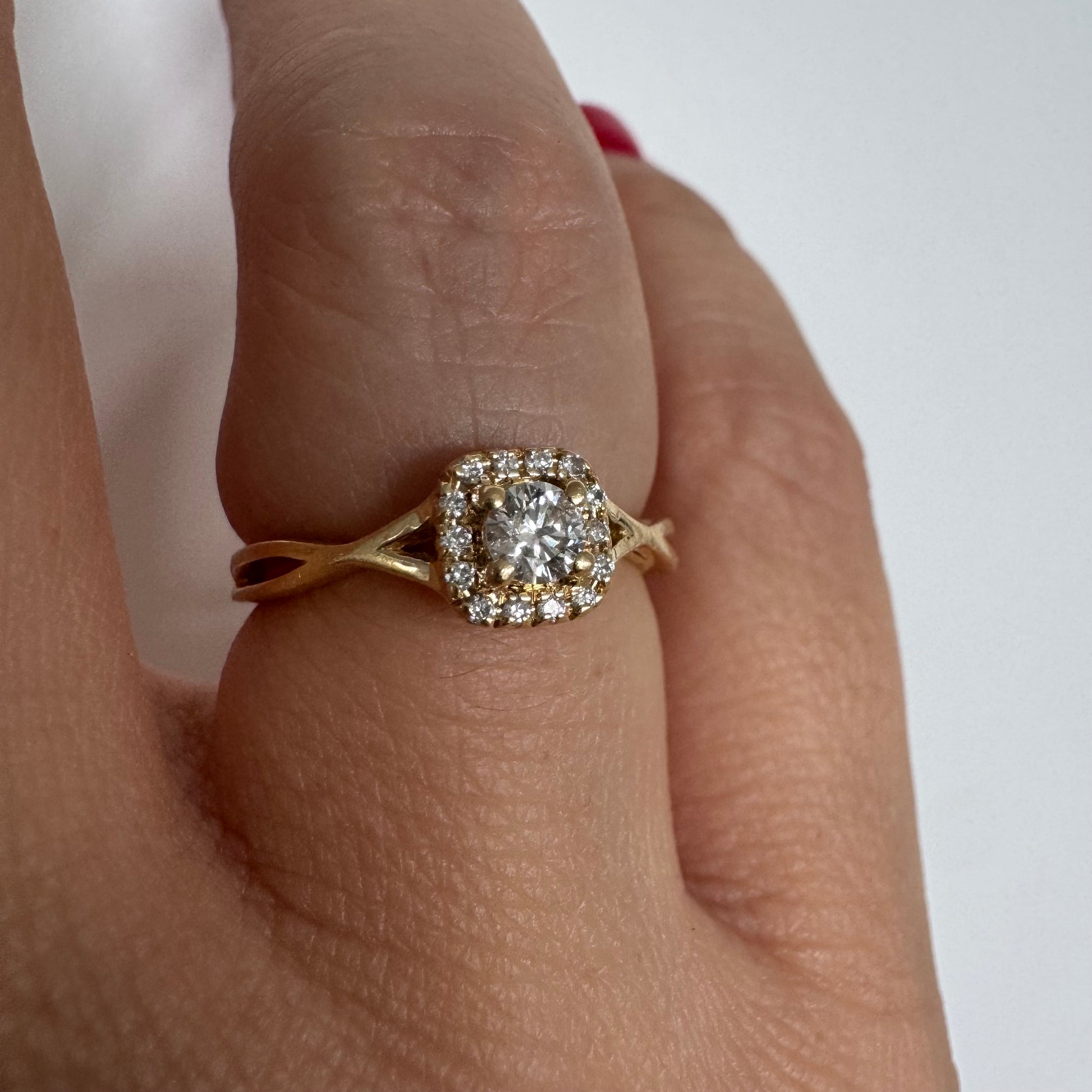 טבעת זהב 14 קראט משובצת יהלום מרכזי עגול ומבריק, מוקף הילה עדינה של יהלומים המעצימים את הברק