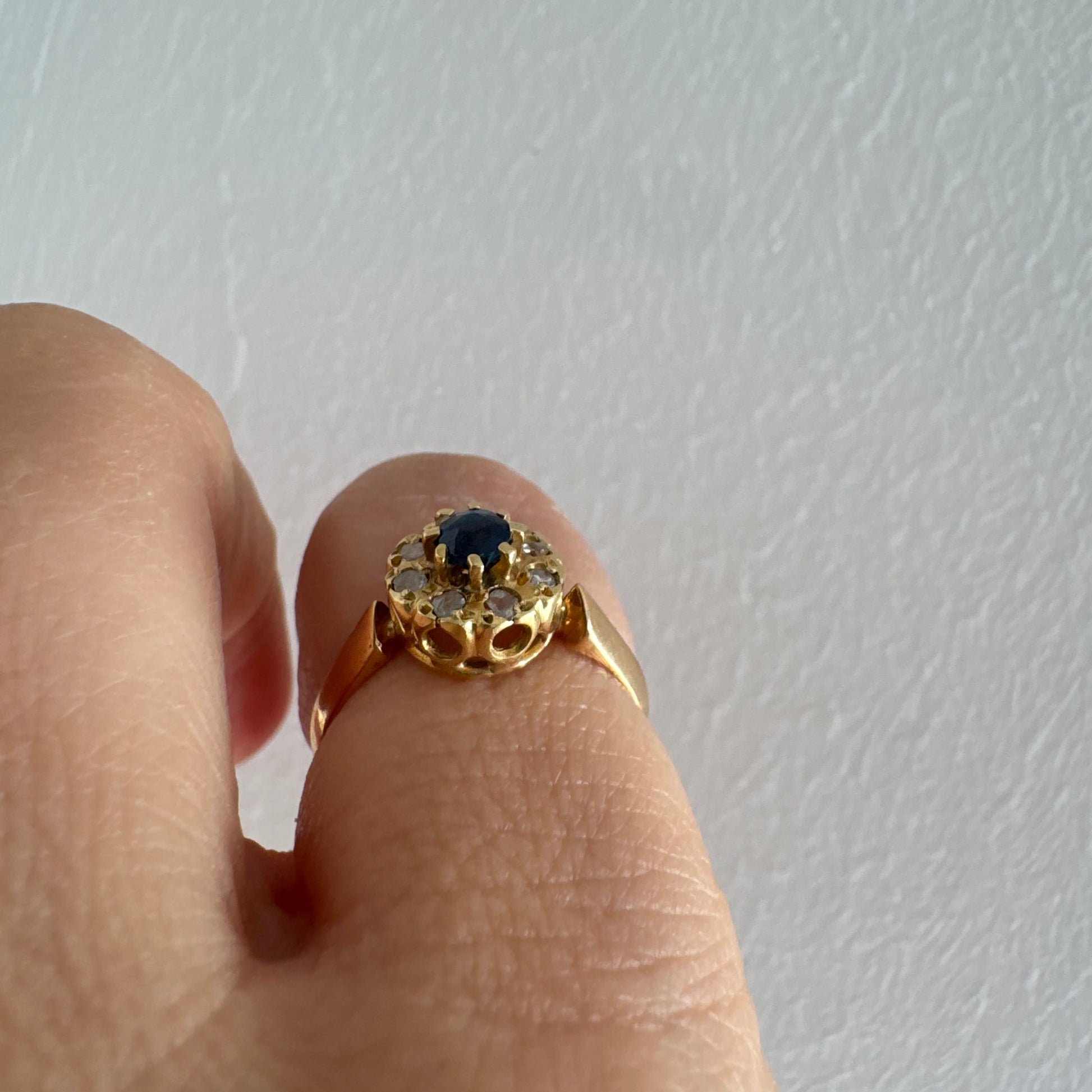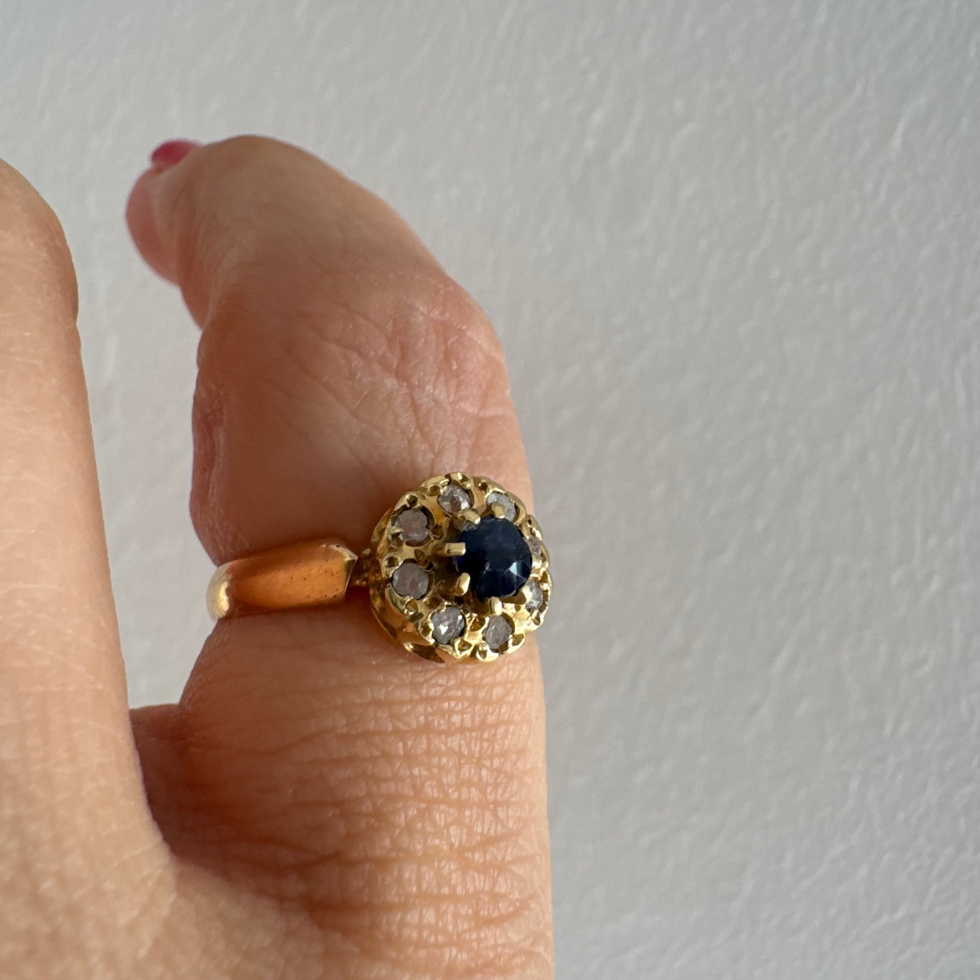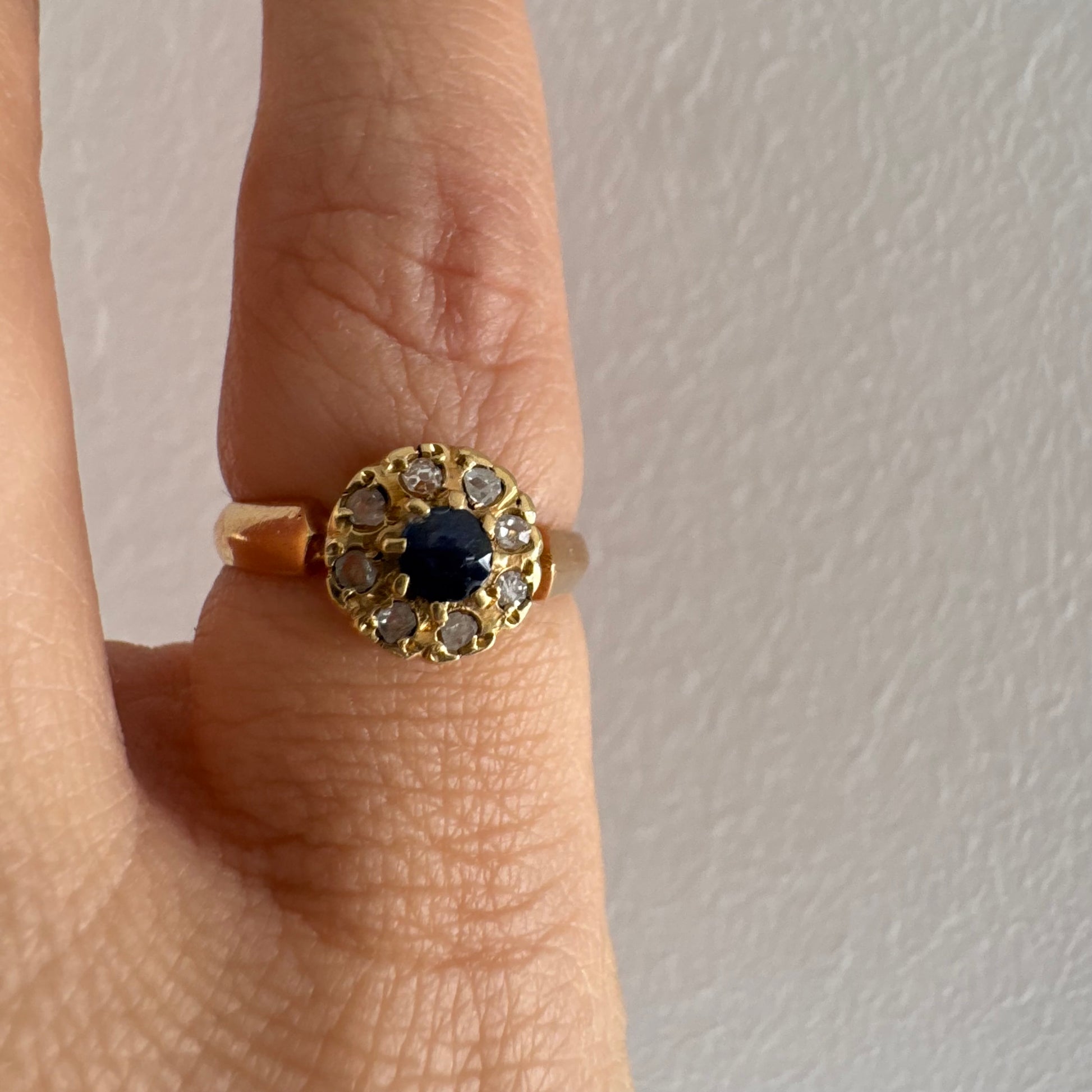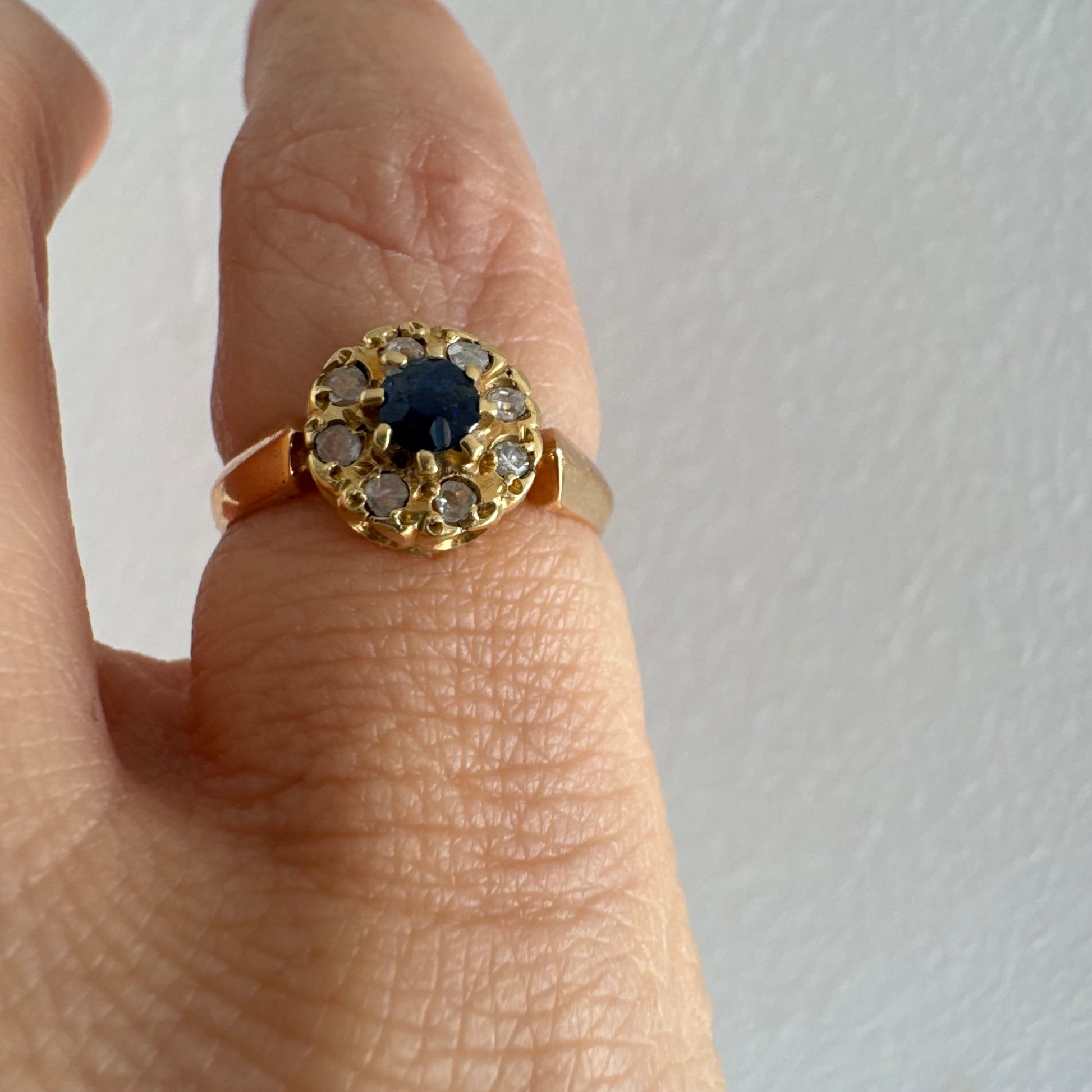 טבעת זהב 14 קראט משובצת ספיר מרכזי מוקף הילה של יהלומים בחיתוך עגול.