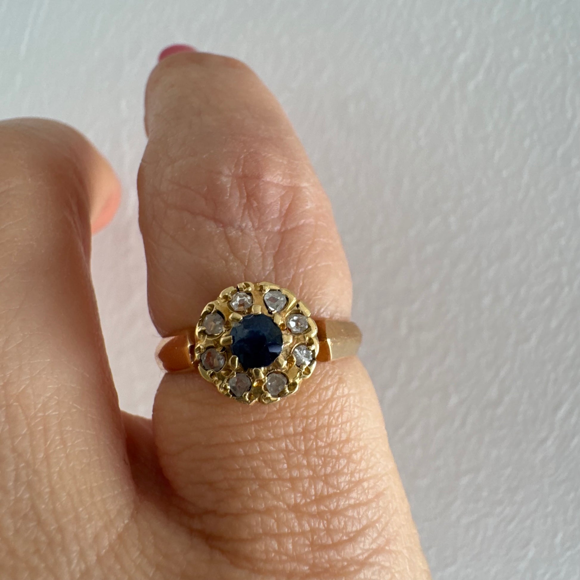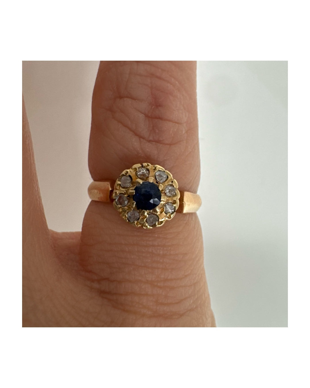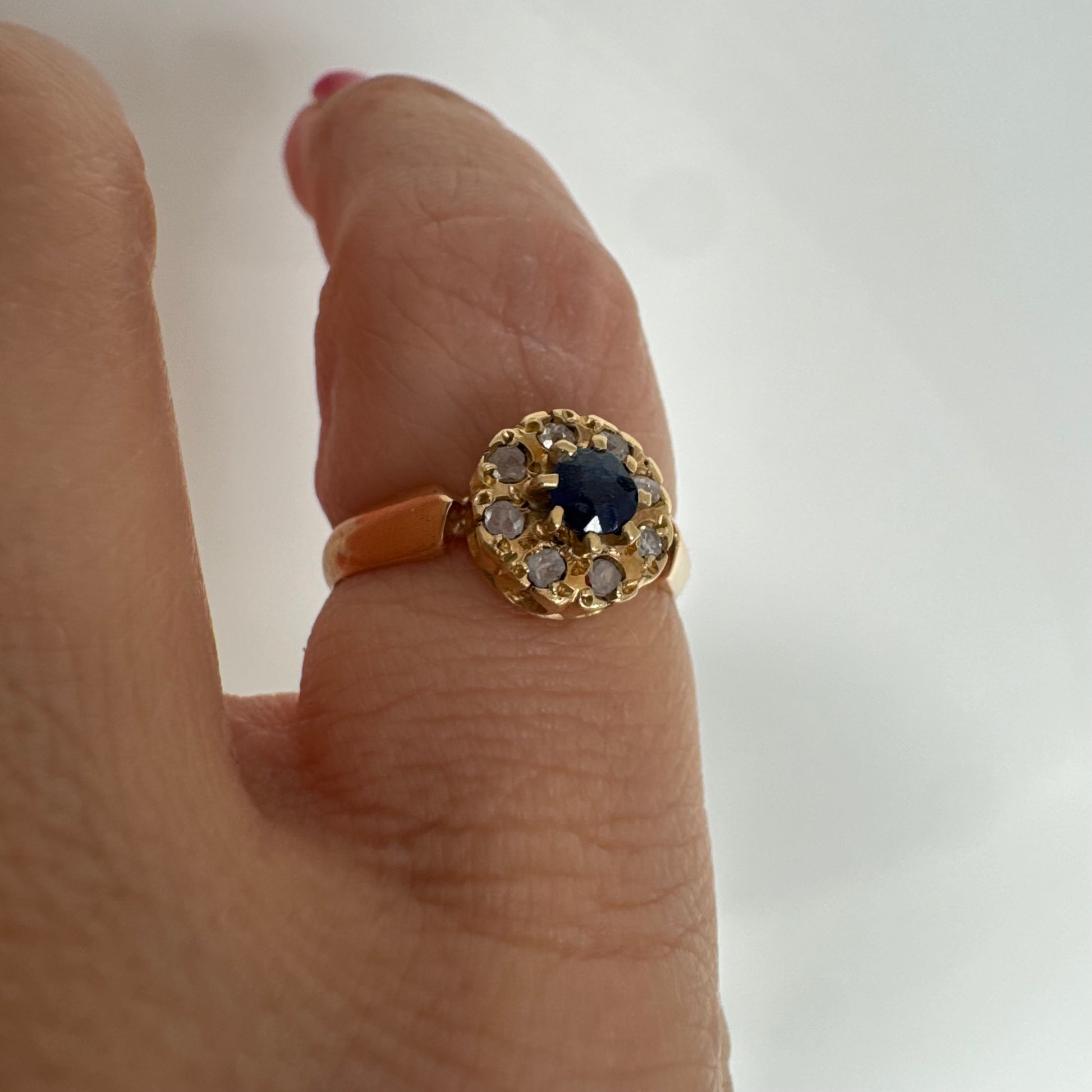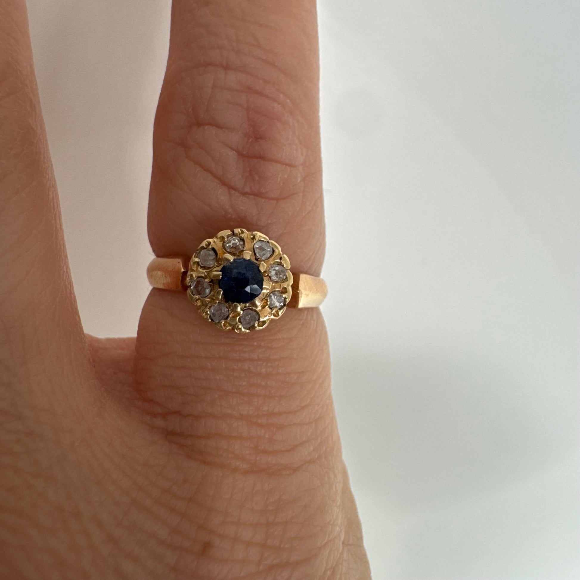 טבעת זהב 14 קראט משובצת ספיר מרכזי מוקף הילה של יהלומים בחיתוך עגול.