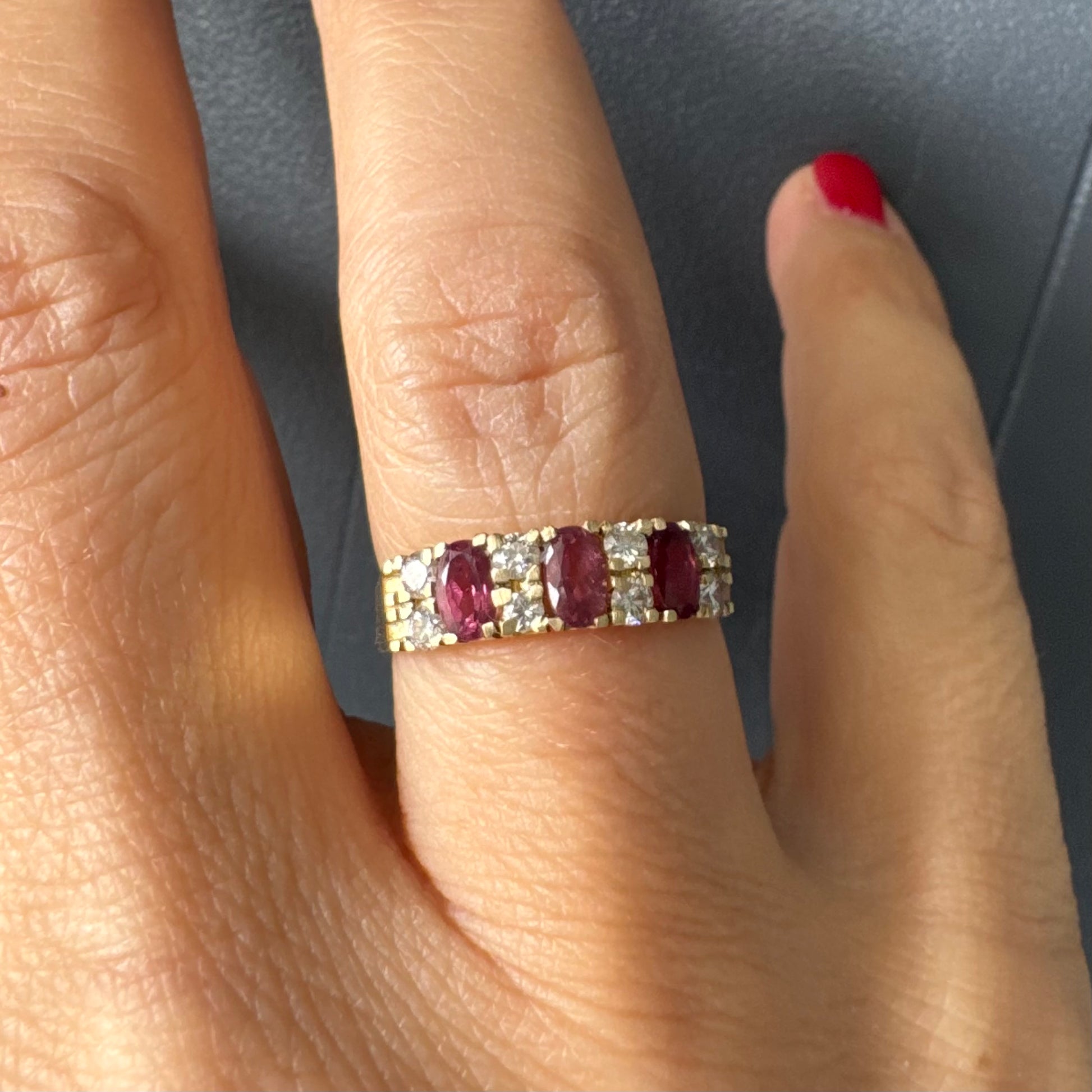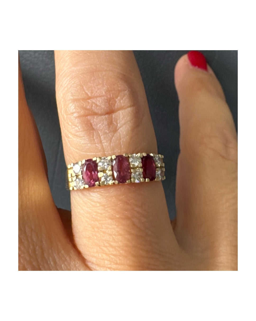 טבעת זהב צהוב 14 קראט משובצת בשורות של אבני טורמלין בצבע ורוד אובליות ונוצצות, כשביניהן שיבוצים של יהלומים עגולים שמוסיפים לה ברק וזוהר.