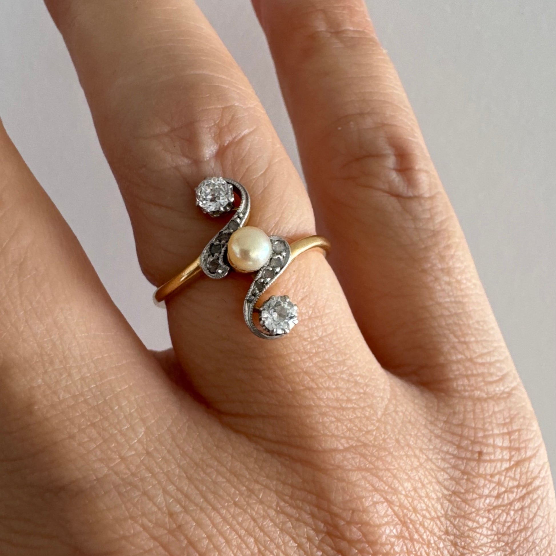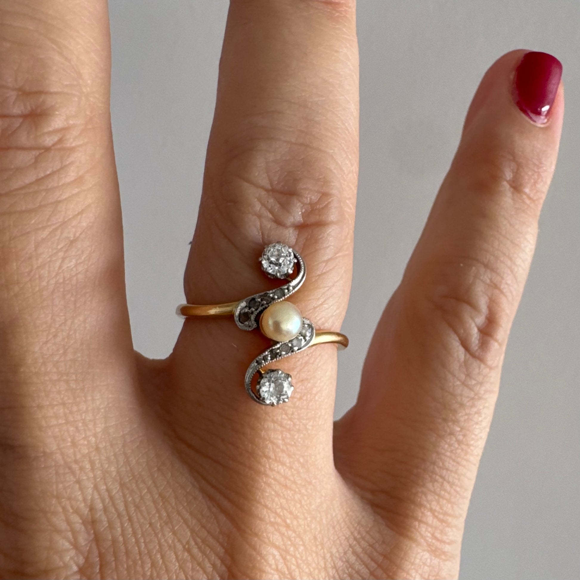 טבעת זהב 18 קראט בעיצוב וינטג׳ קלאסי, משובצת בשני יהלומים בחיתוך עתיק ובפנינה טבעית במרכז.