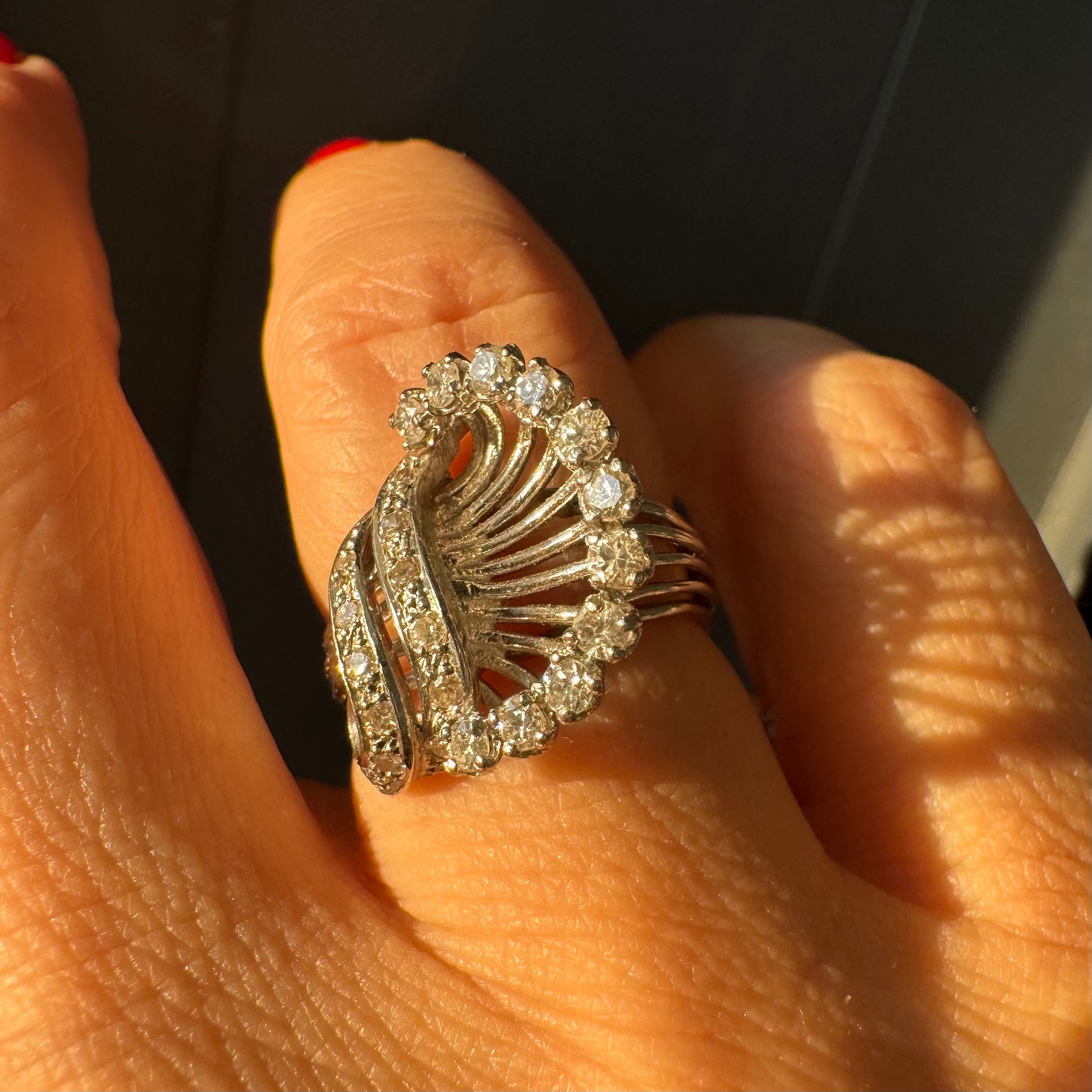 טבעת זהב 18 קראט משובצת יהלומים בעיצוב ייחודי ודינמי, עם קווים פתוחים ומניפת יהלומים היקפית היוצרת מראה עשיר ומלא ברק