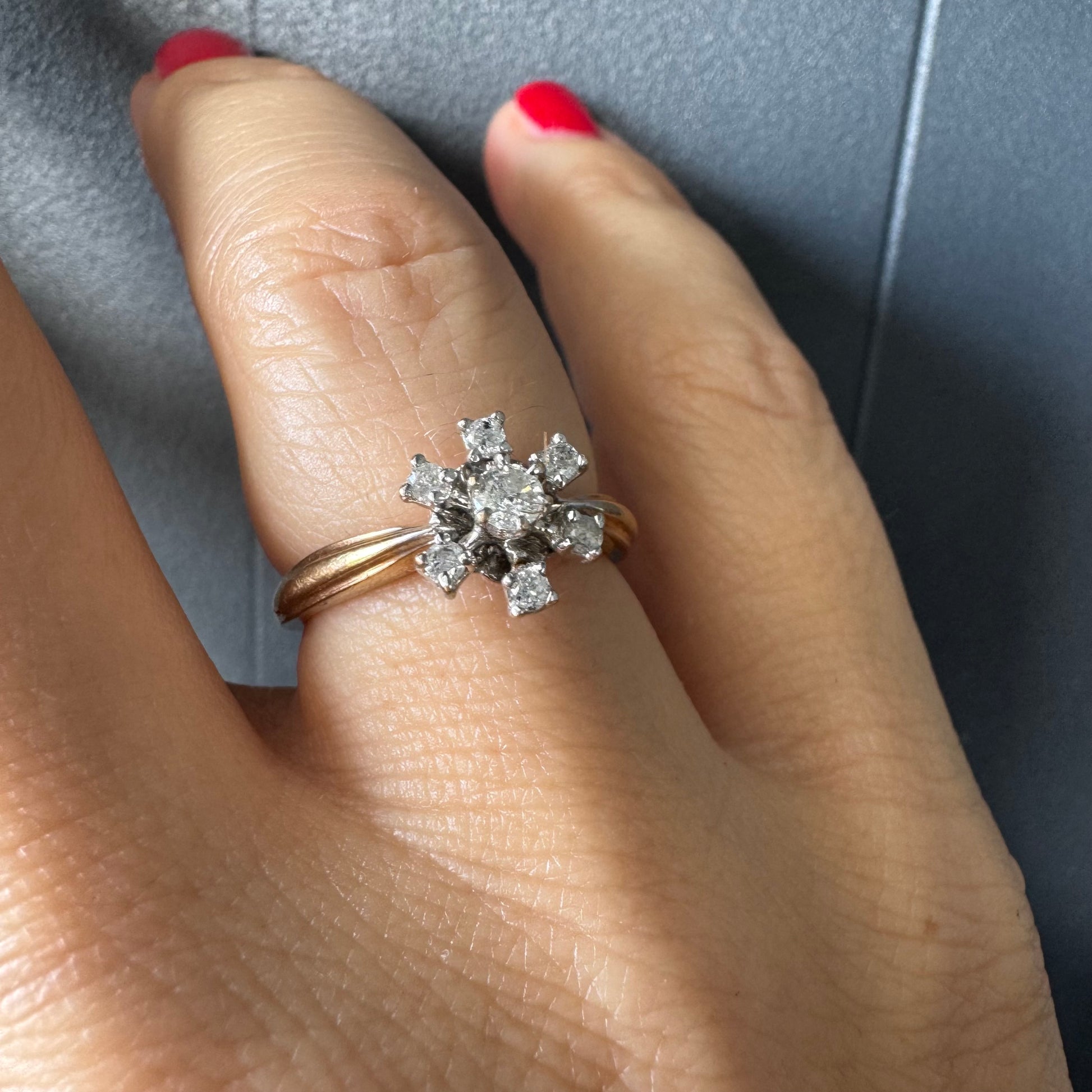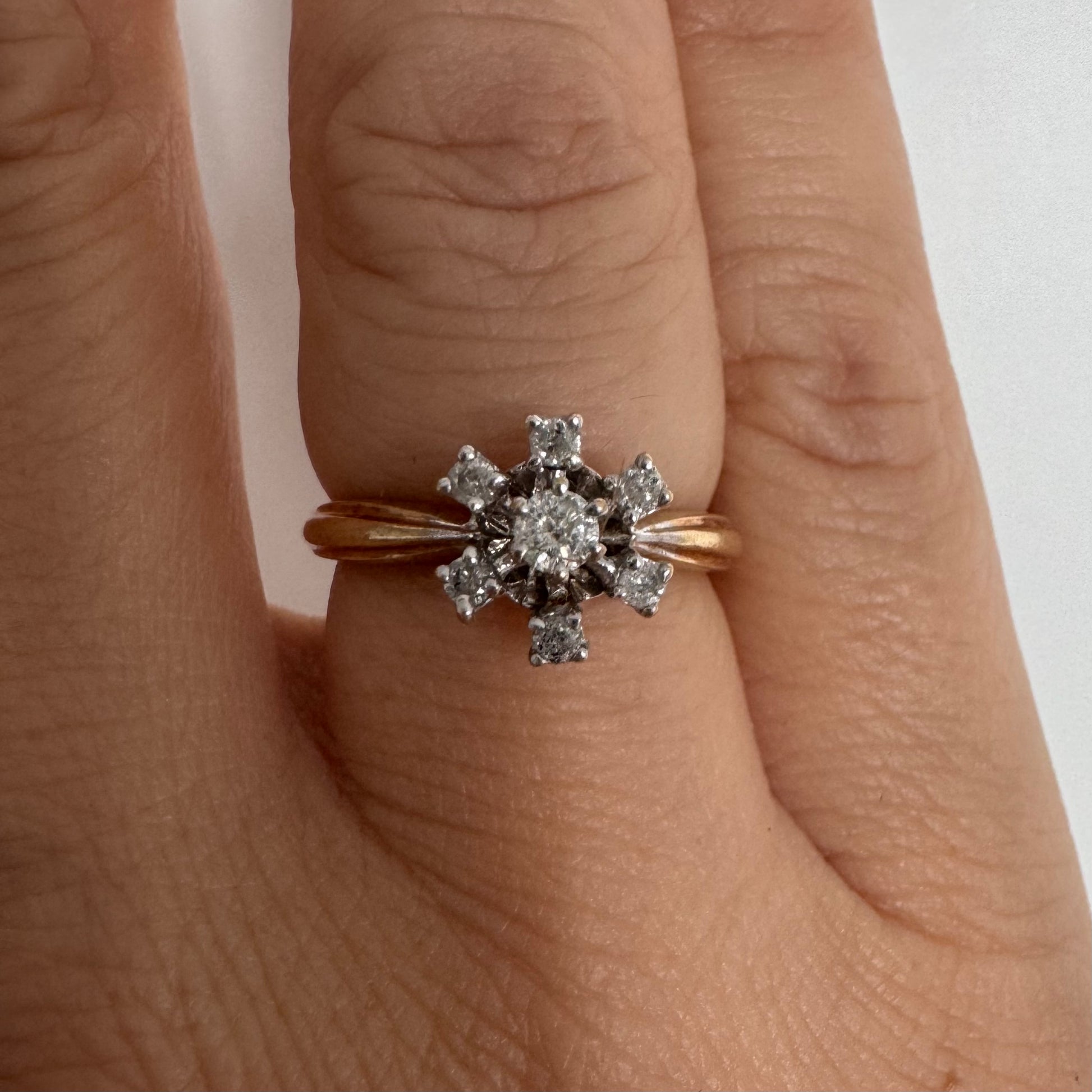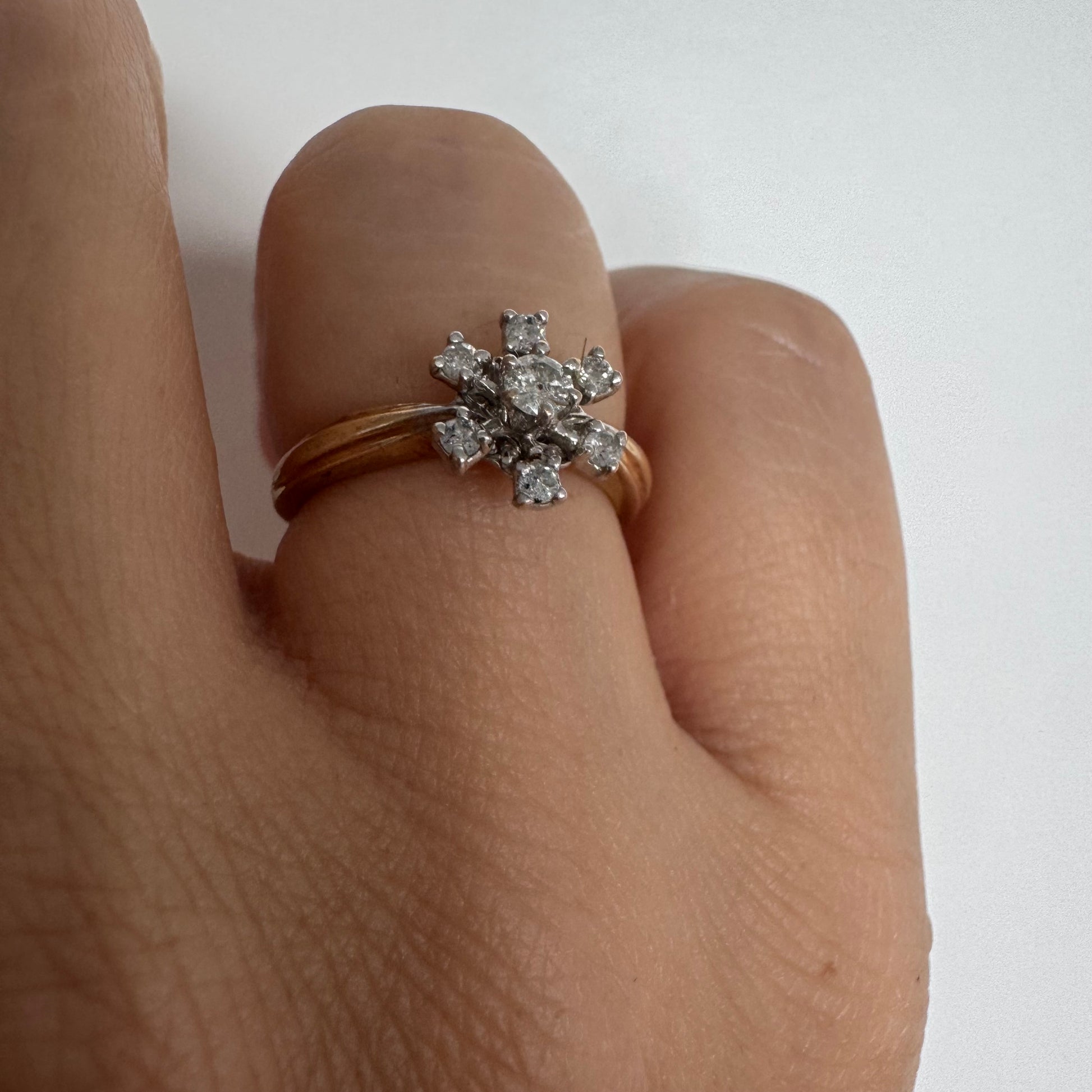 טבעת זהב 9 קראט משובצת יהלום מרכזי ויהלומים מסביב בעיצוב פרח קלאסי.