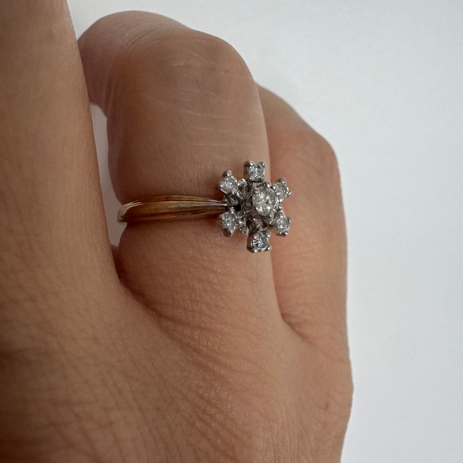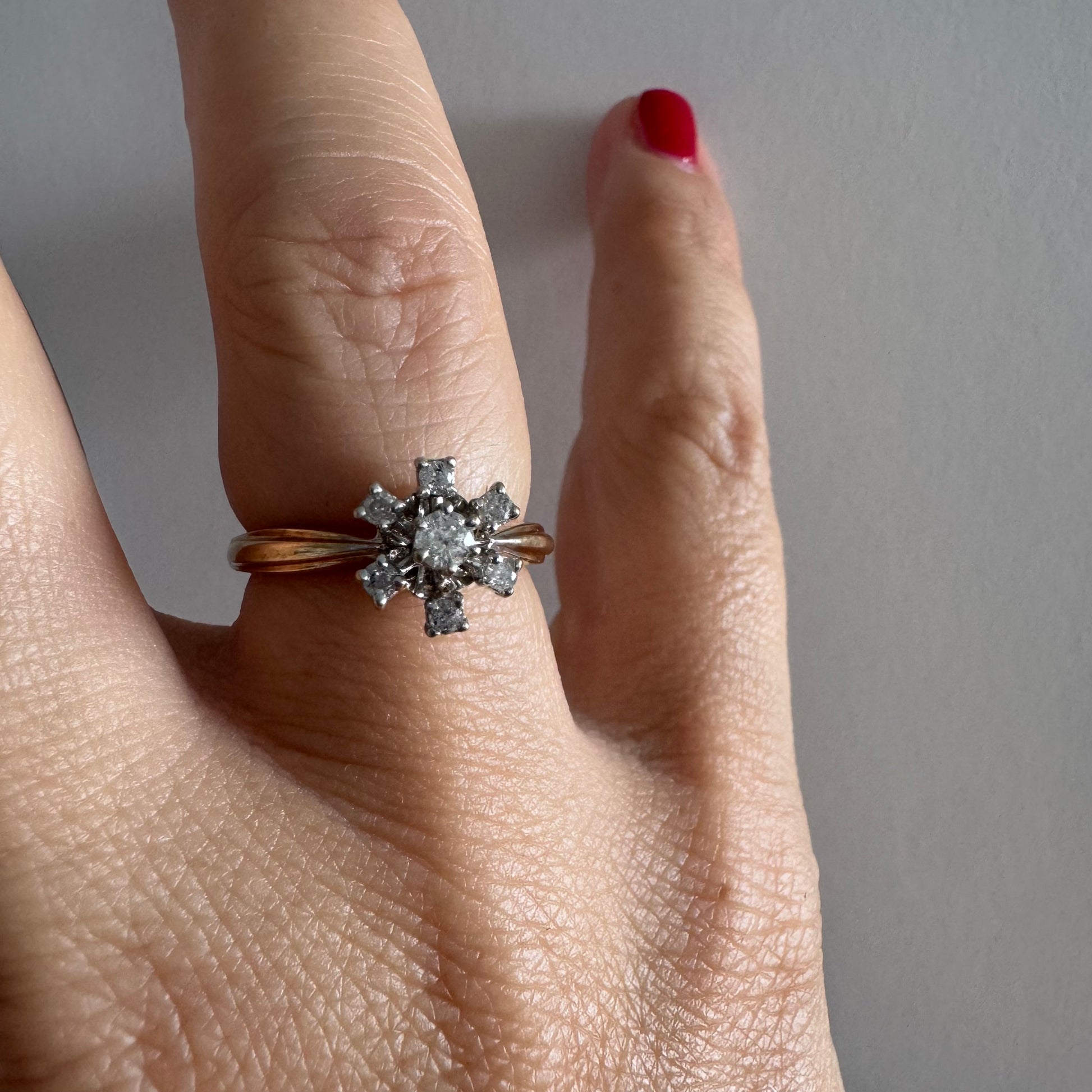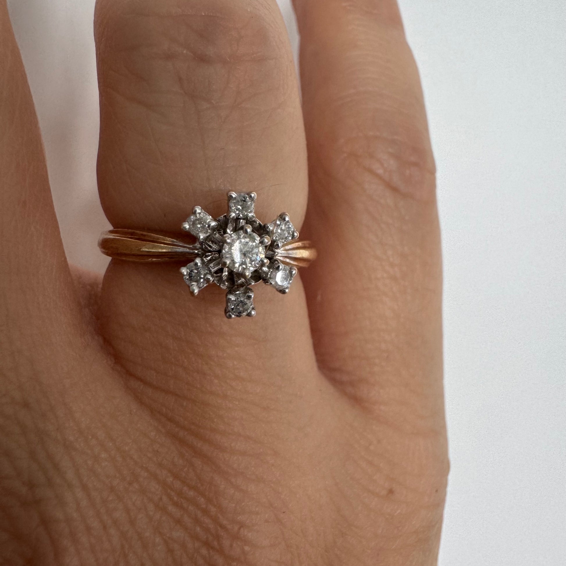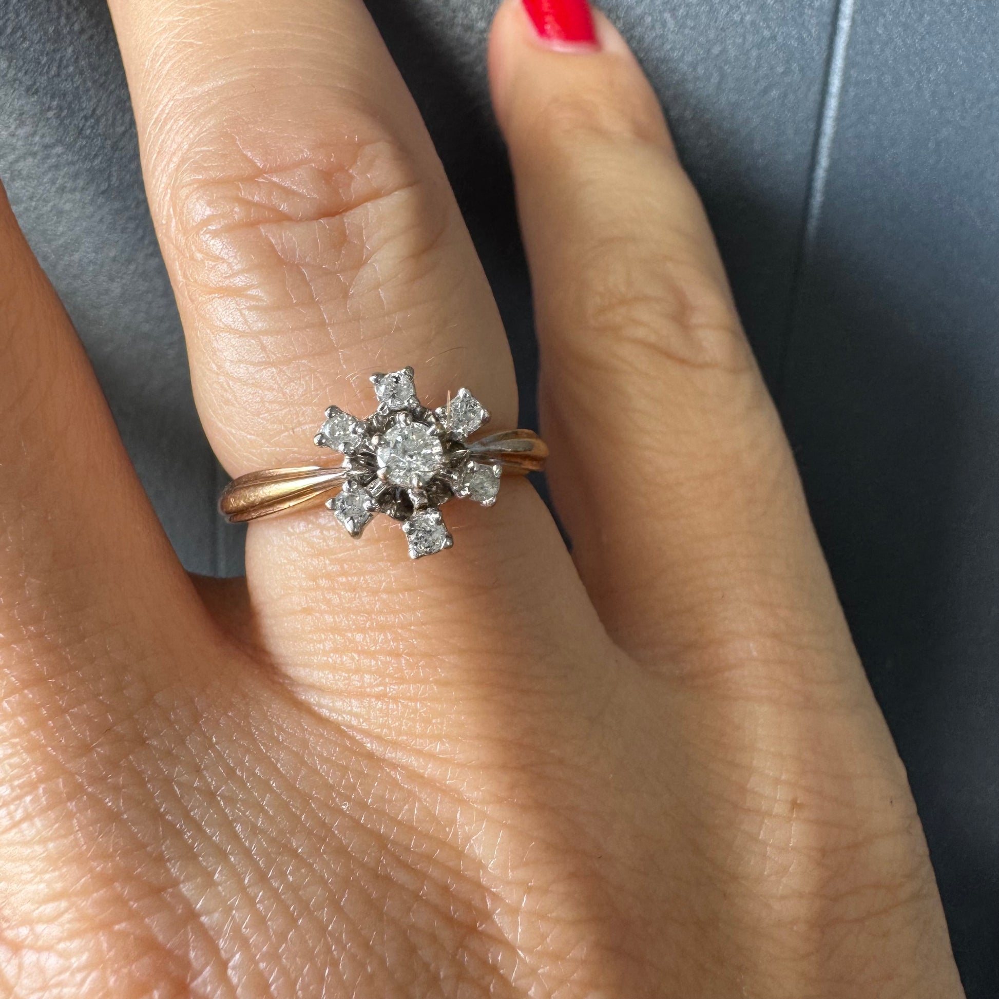 טבעת זהב 9 קראט משובצת יהלום מרכזי ויהלומים מסביב בעיצוב פרח קלאסי.
