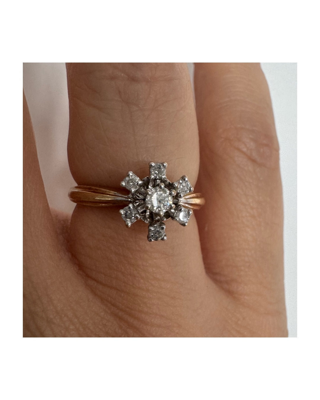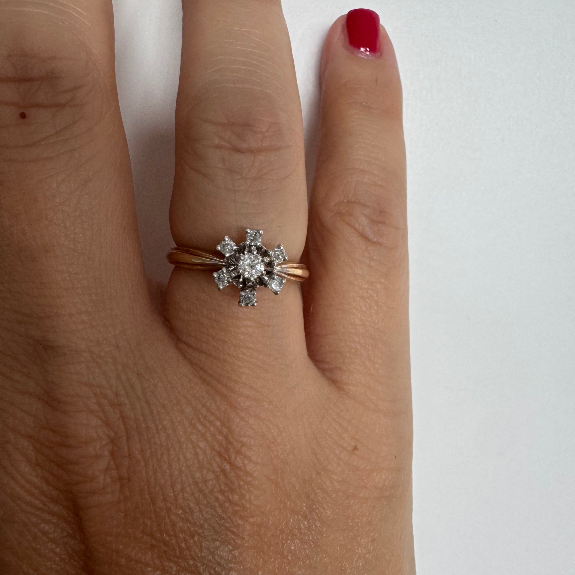 טבעת זהב 9 קראט משובצת יהלום מרכזי ויהלומים מסביב בעיצוב פרח קלאסי.