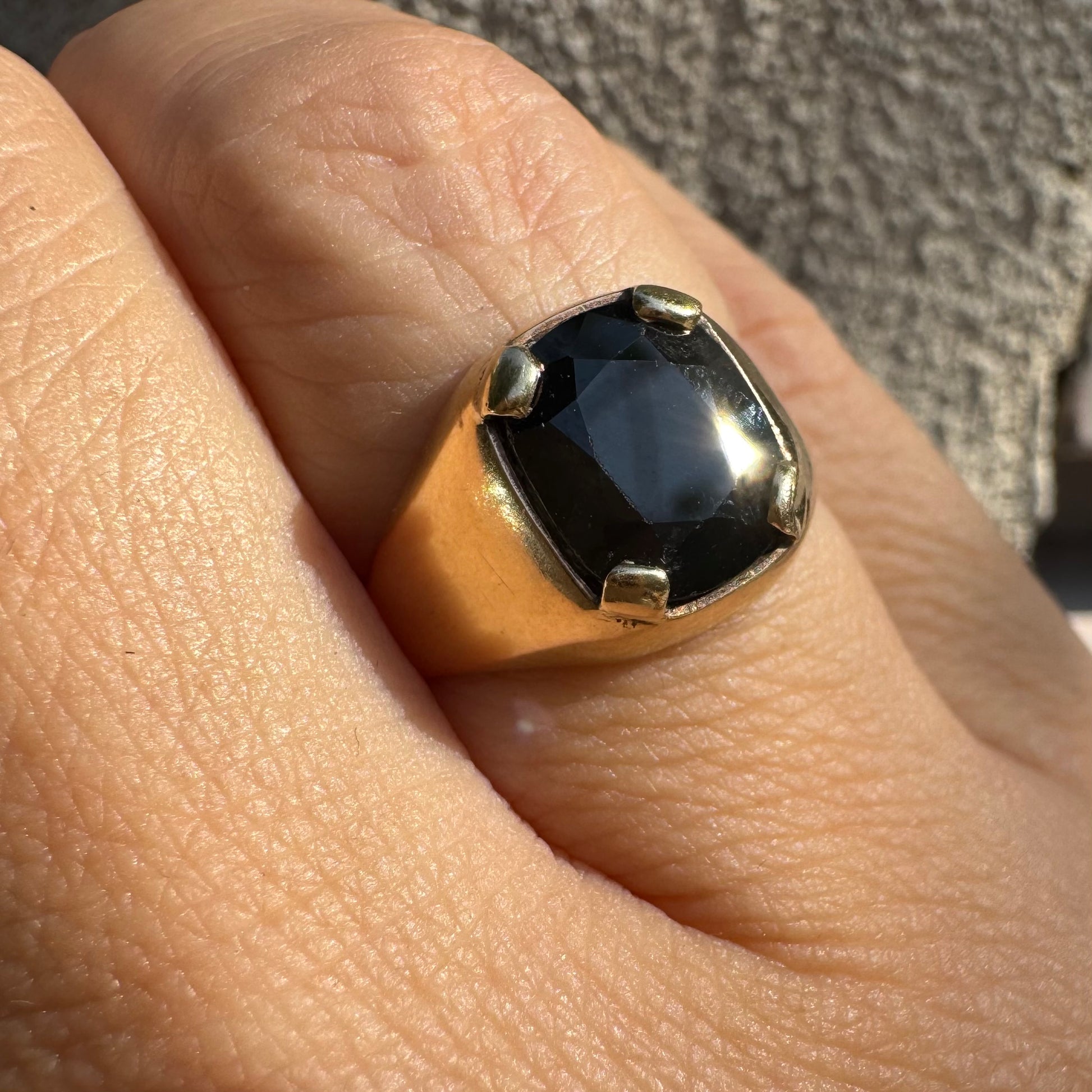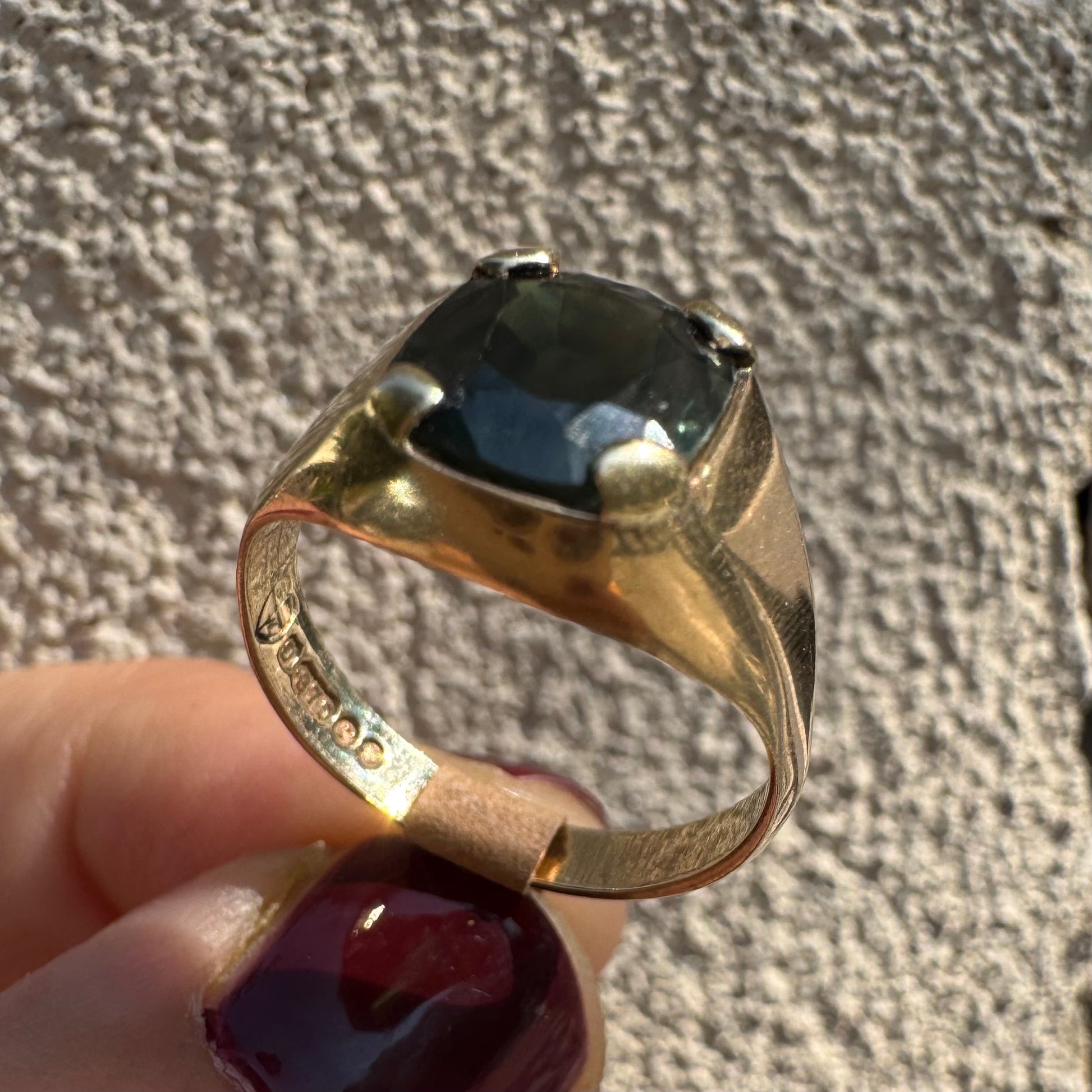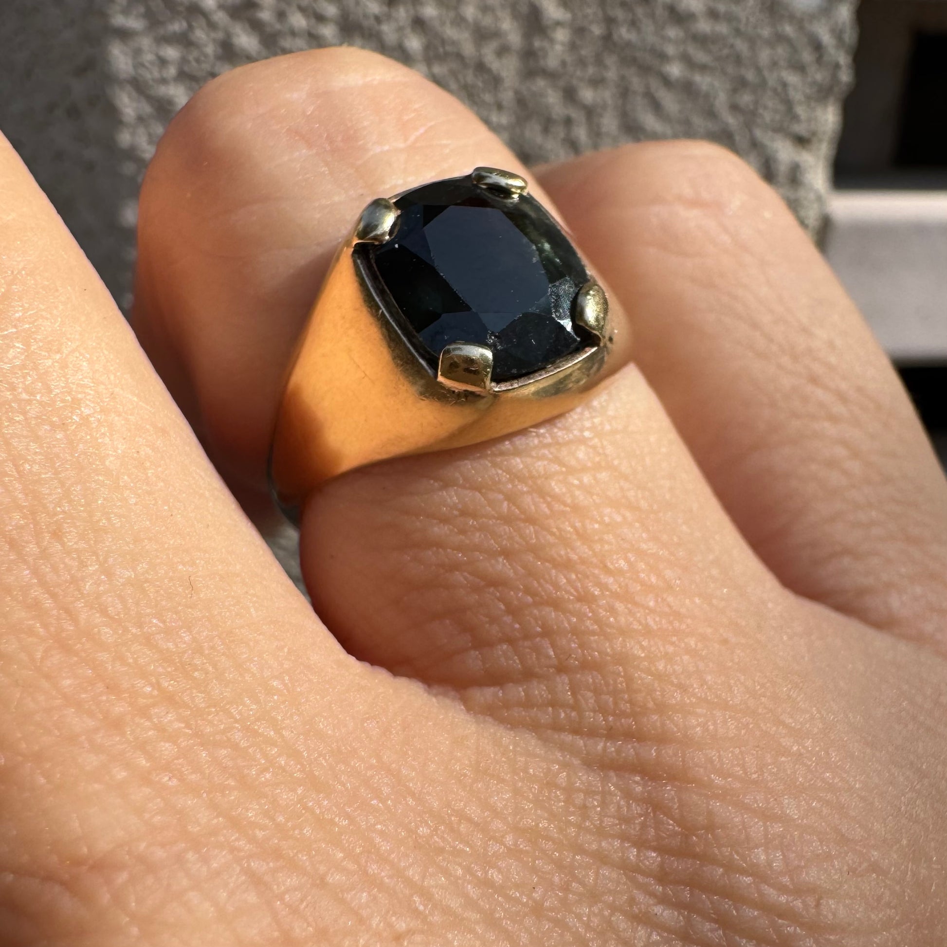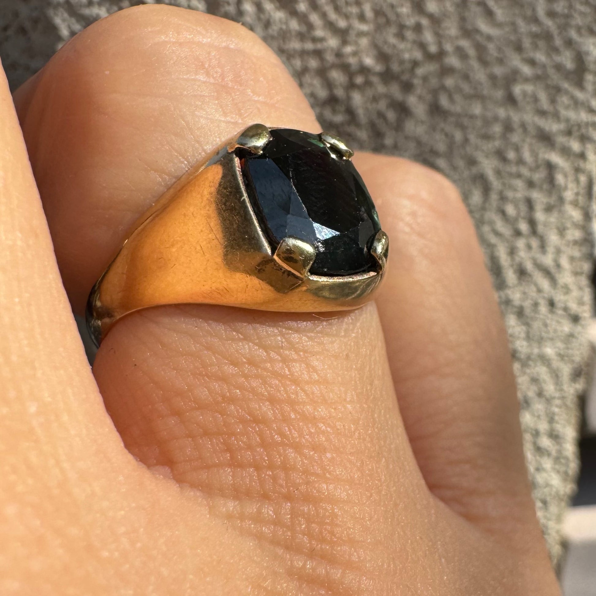 טבעת זהב 9 קראט משובצת ספיר ירוק כהה בחיתוך כרית ובתפסים עבים, בעיצוב נקי ובעל נוכחות.