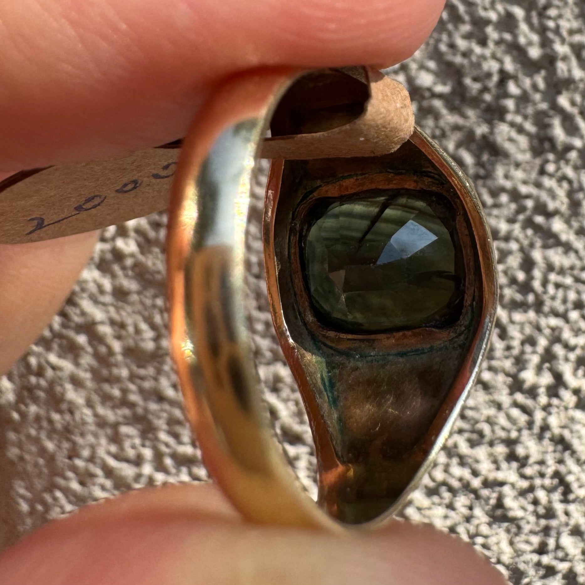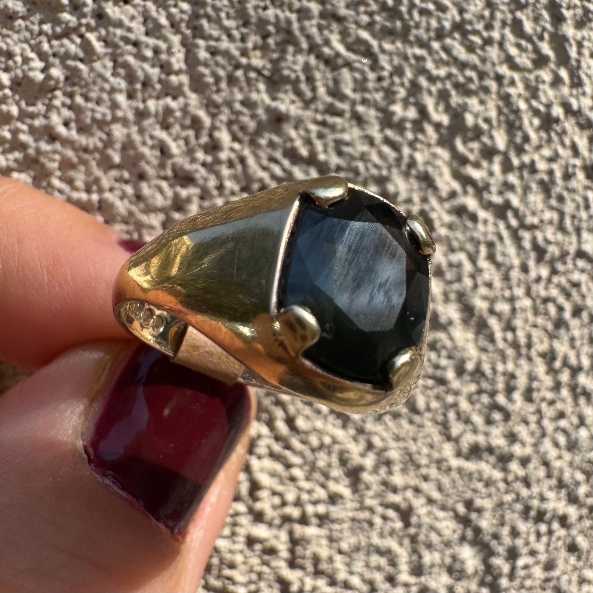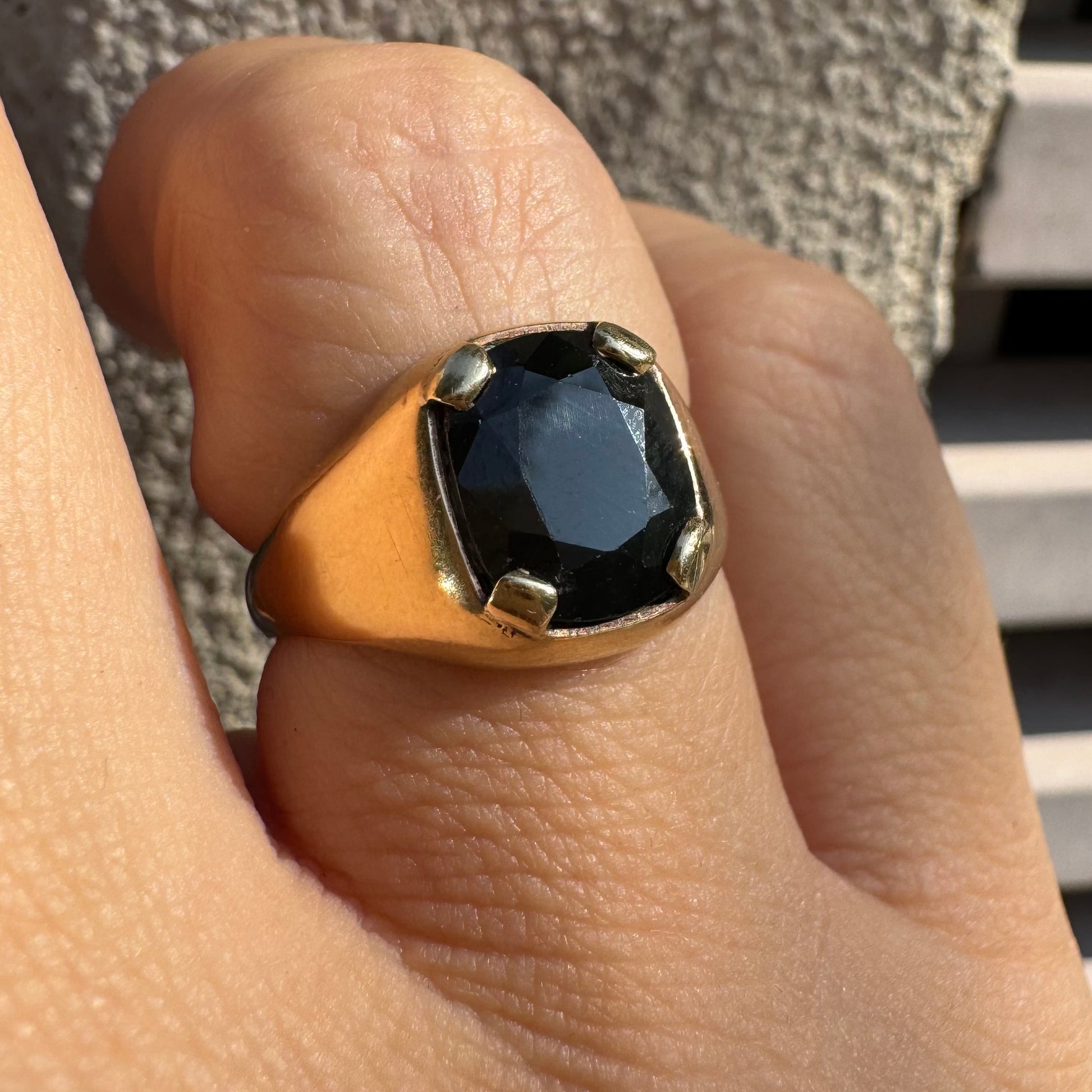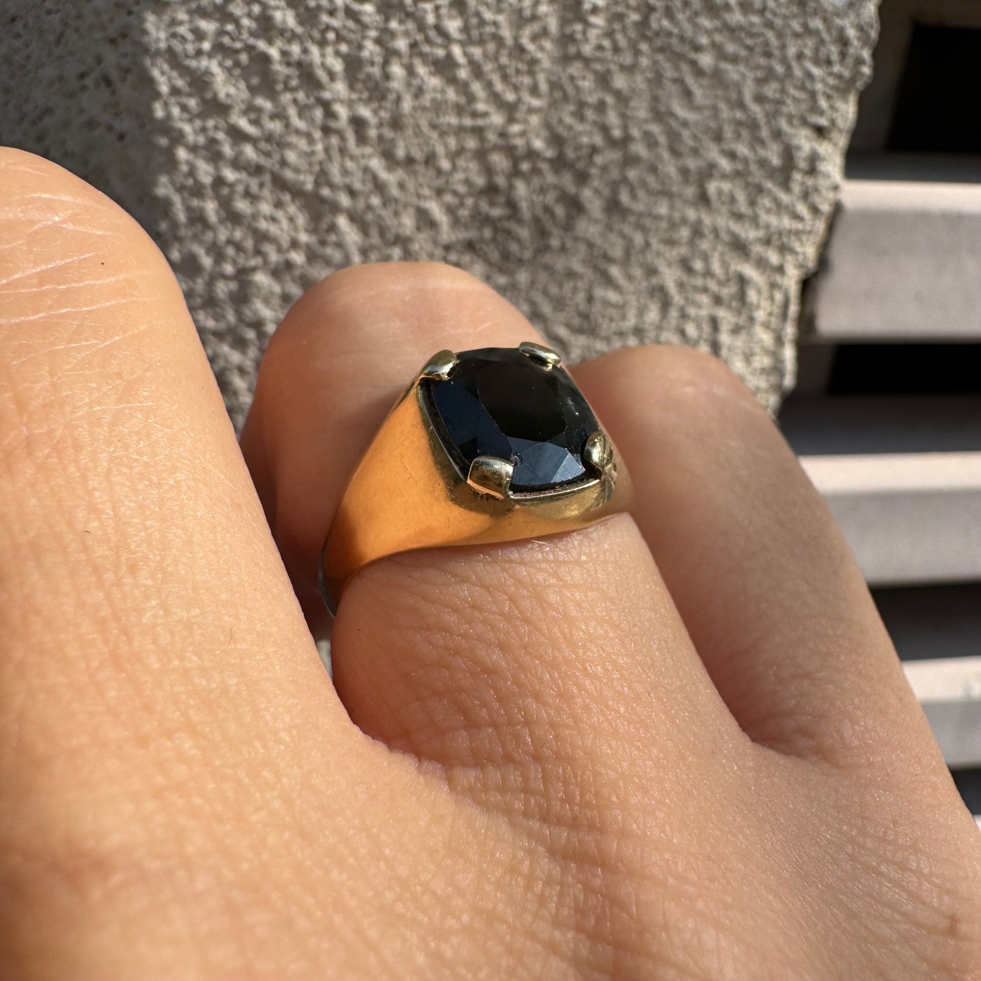טבעת זהב 9 קראט משובצת ספיר ירוק כהה בחיתוך כרית ובתפסים עבים, בעיצוב נקי ובעל נוכחות.