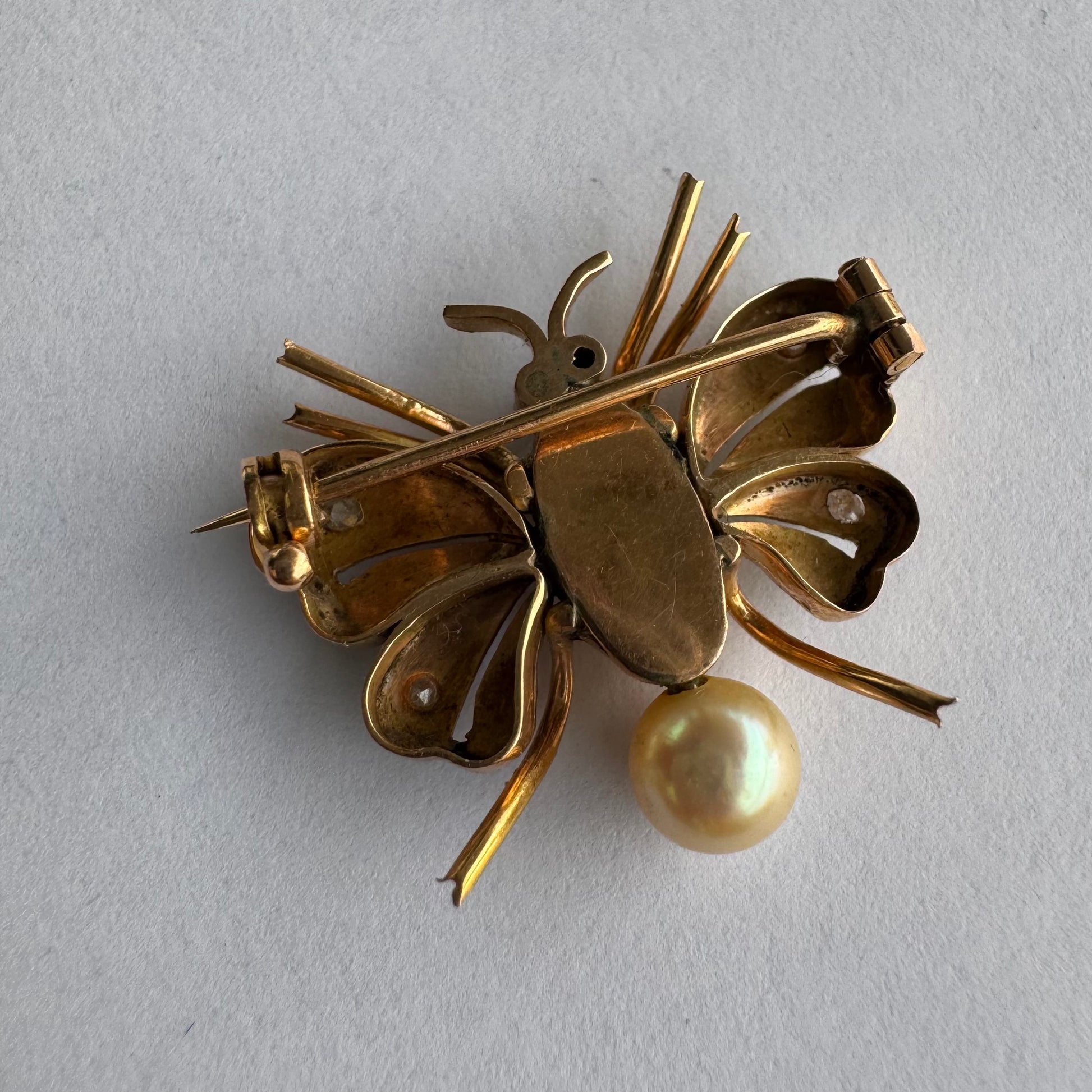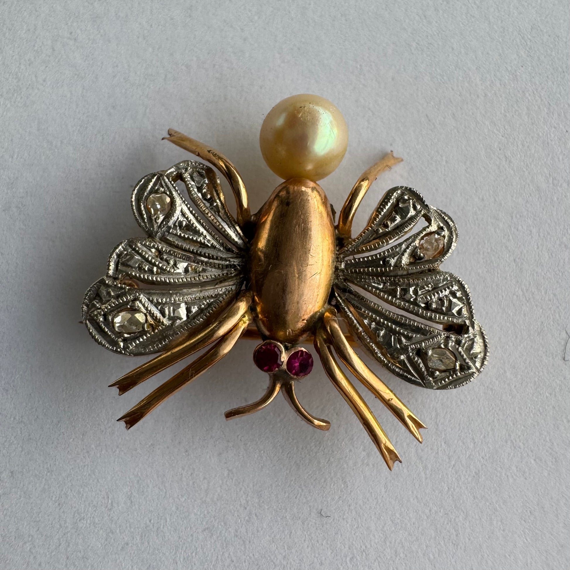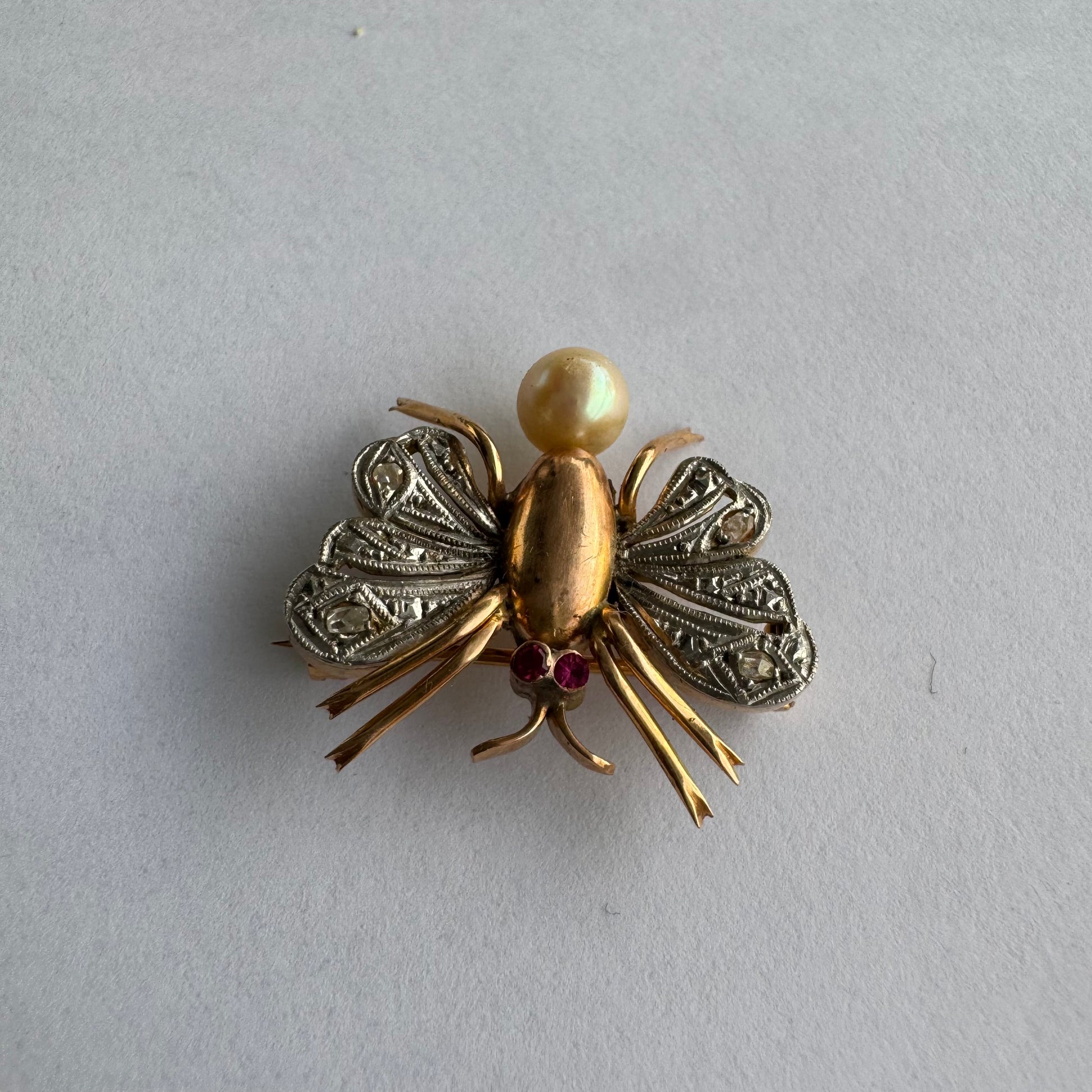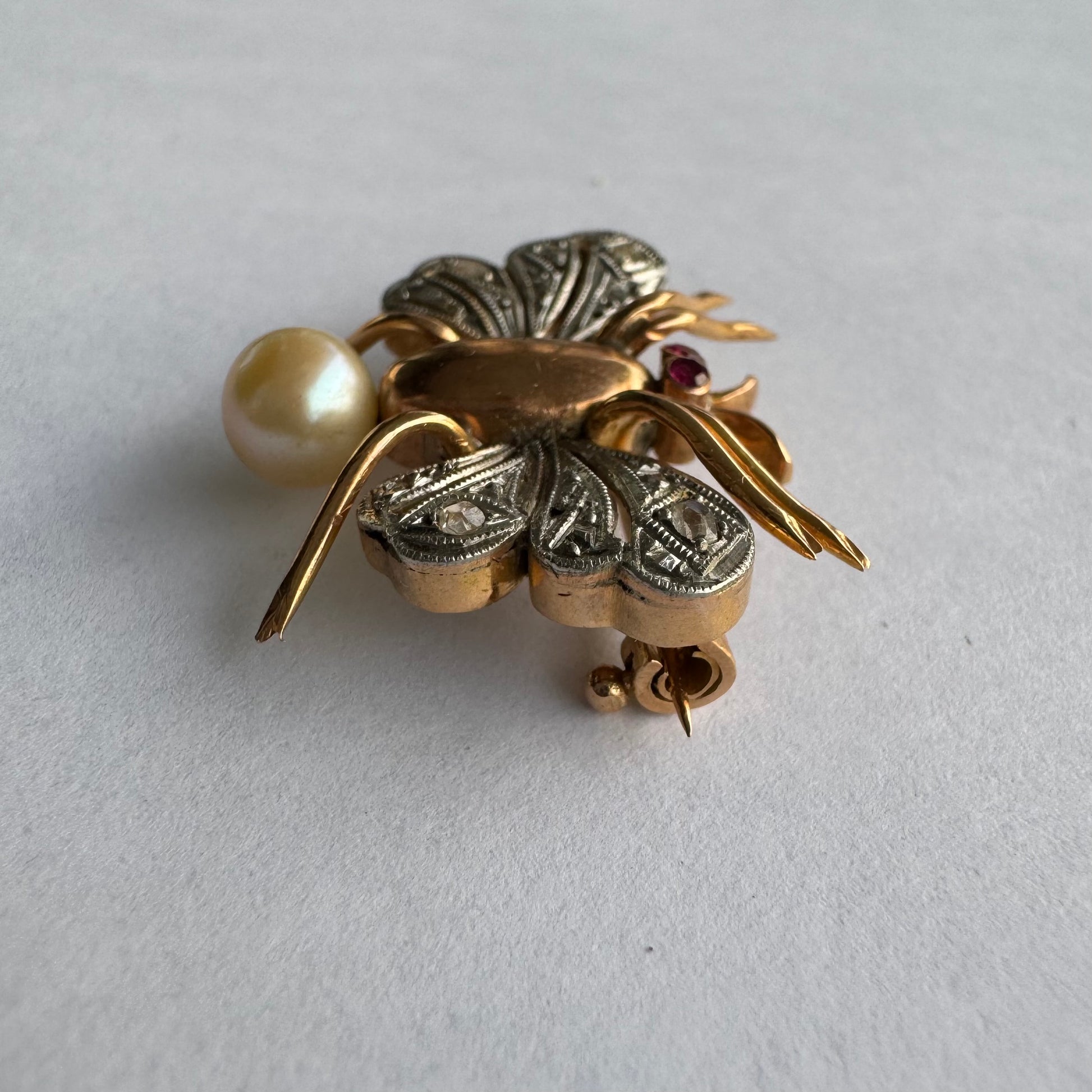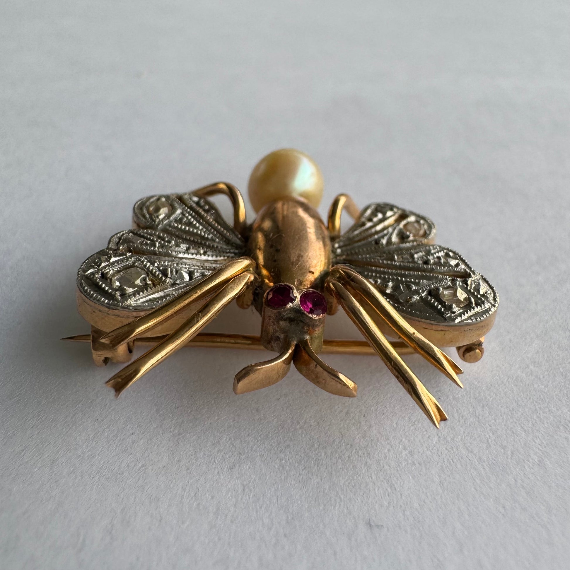 סיכת חרק ייחודית עשויה זהב 14 קראט משובצת יהלומים בעבודת פיליגרן עדינה בכנפיים, אבני רובי אדומות בעיניים ופנינה טבעית בגוון שמפניה.