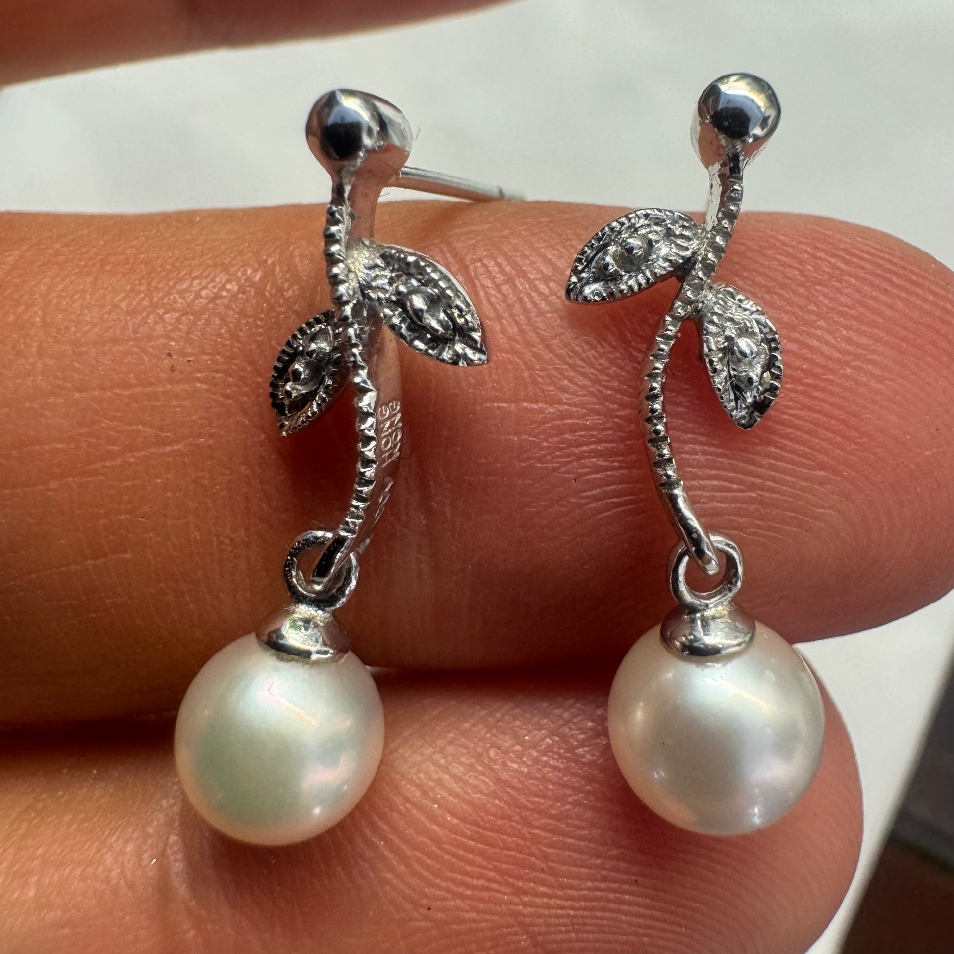 עגילים נופלים עדינים, זהב לבן 14 קראט עם עיצוב עלים , כל אחד משובץ פנינה עגולה בקצה