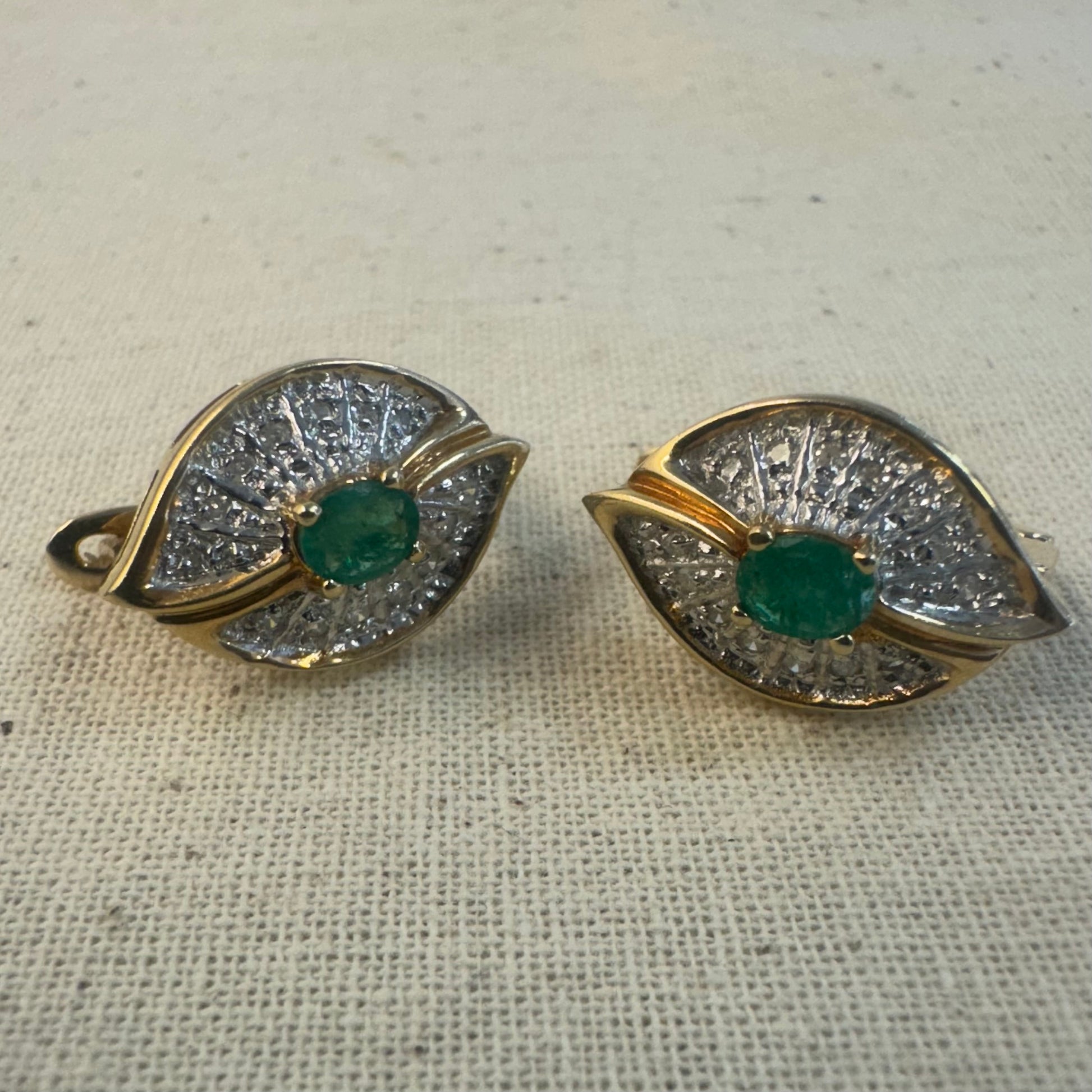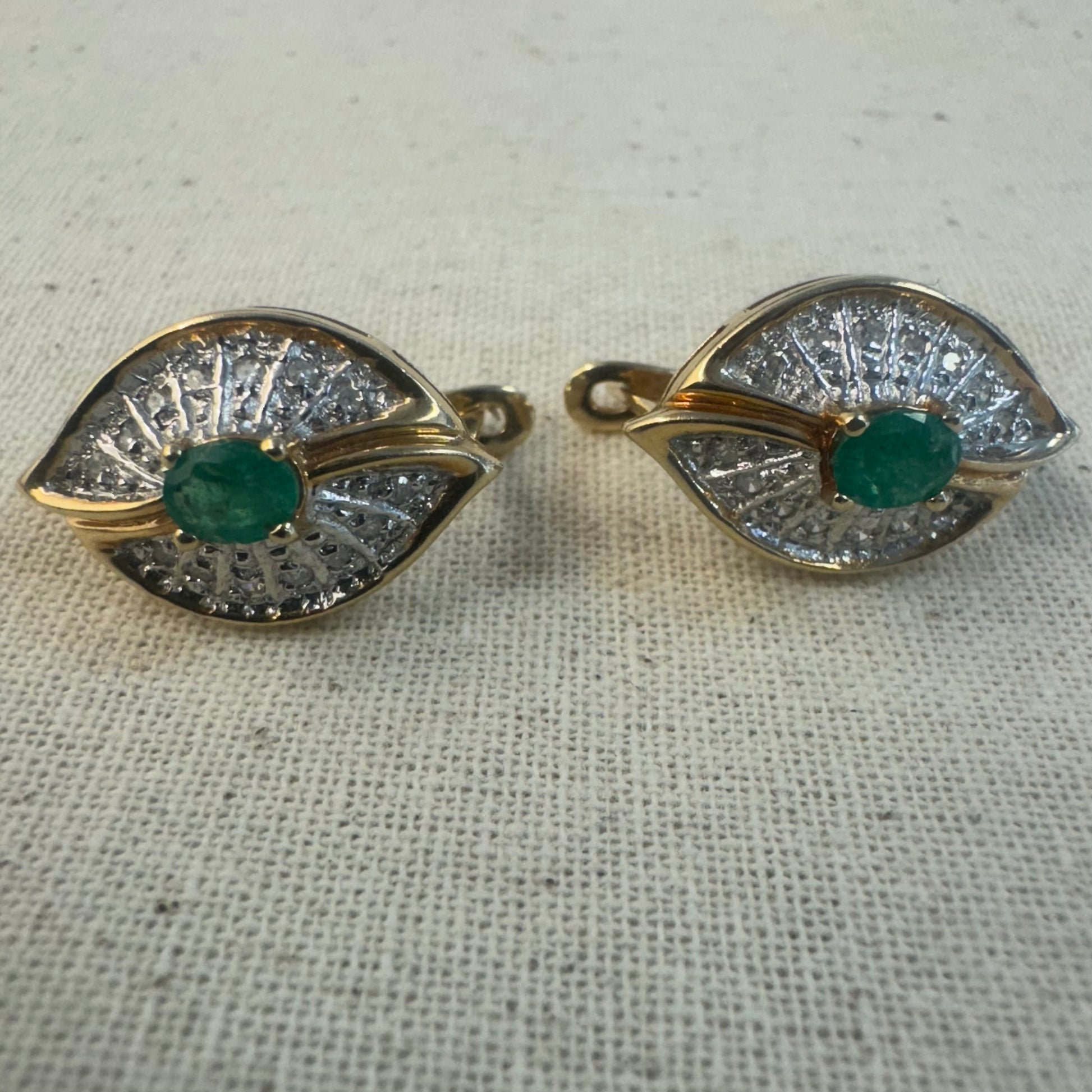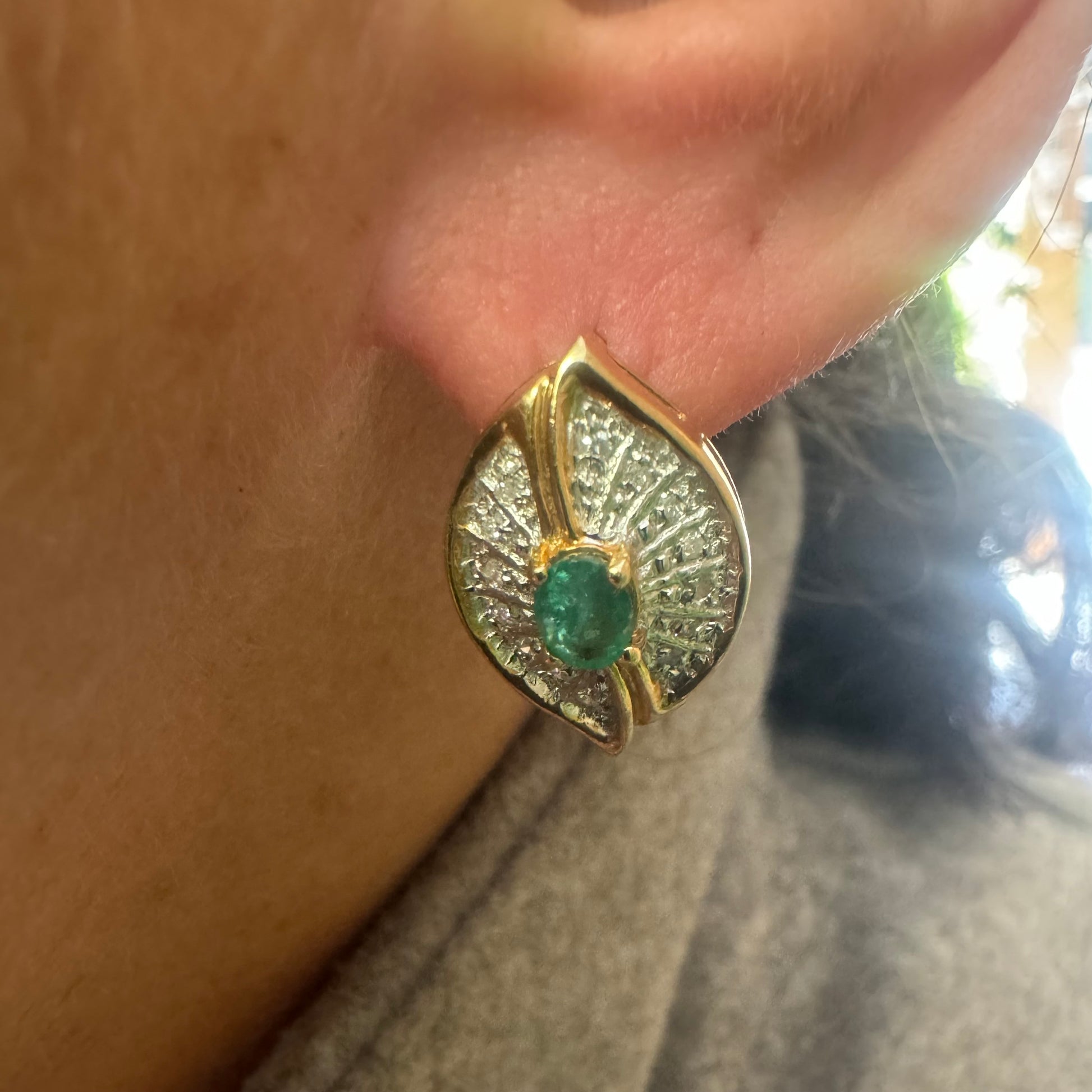 עגילים צמודים לאוזן, זהב צהוב 14 קראט, משובצים אמרלד במרכז, וסביבן פיתוחים משובצים יהלומים, שמעניקים מראה של ניצוץ רך ואלגנטי
