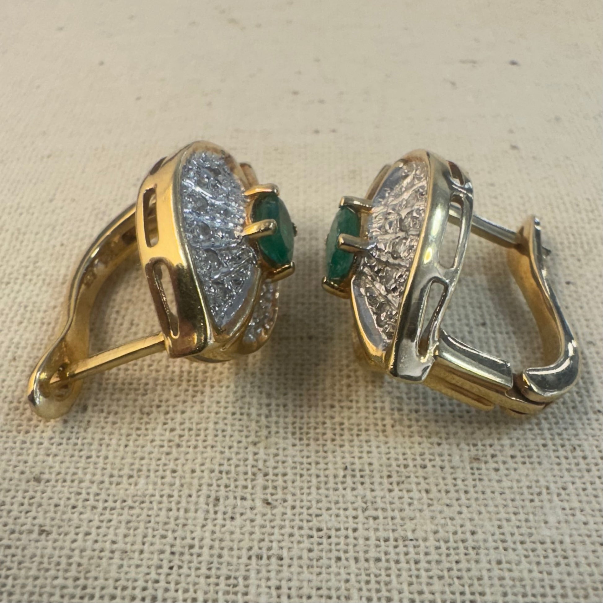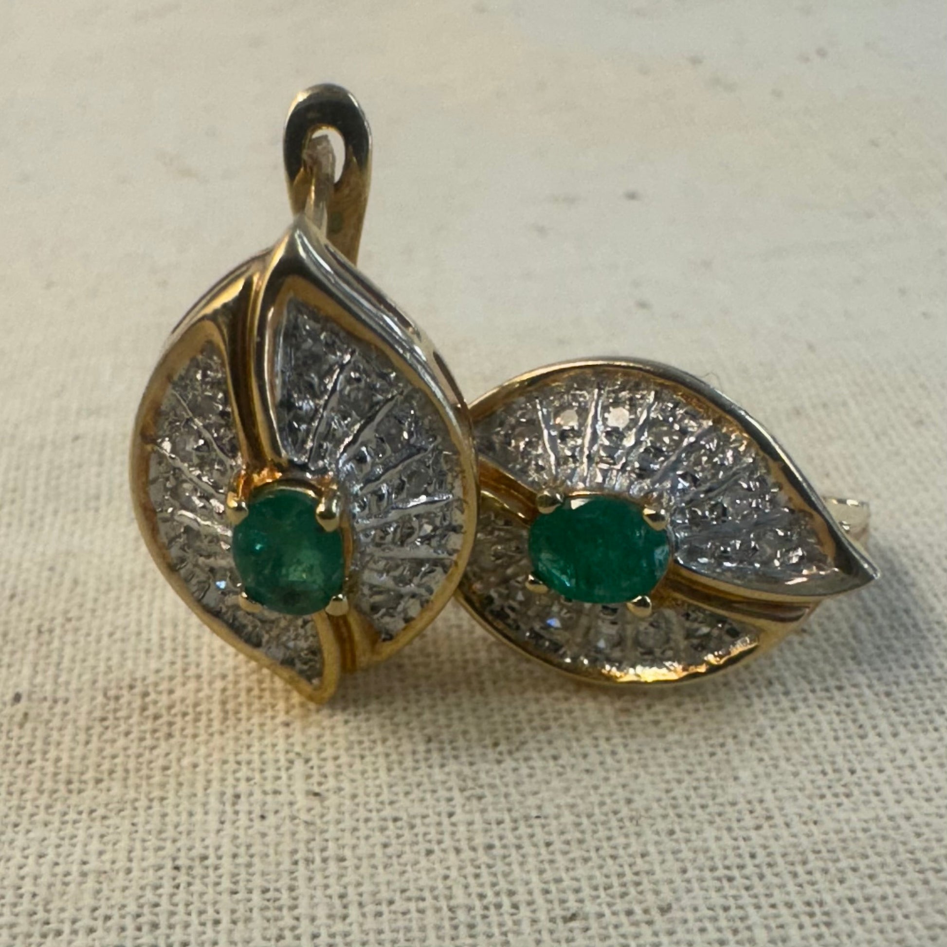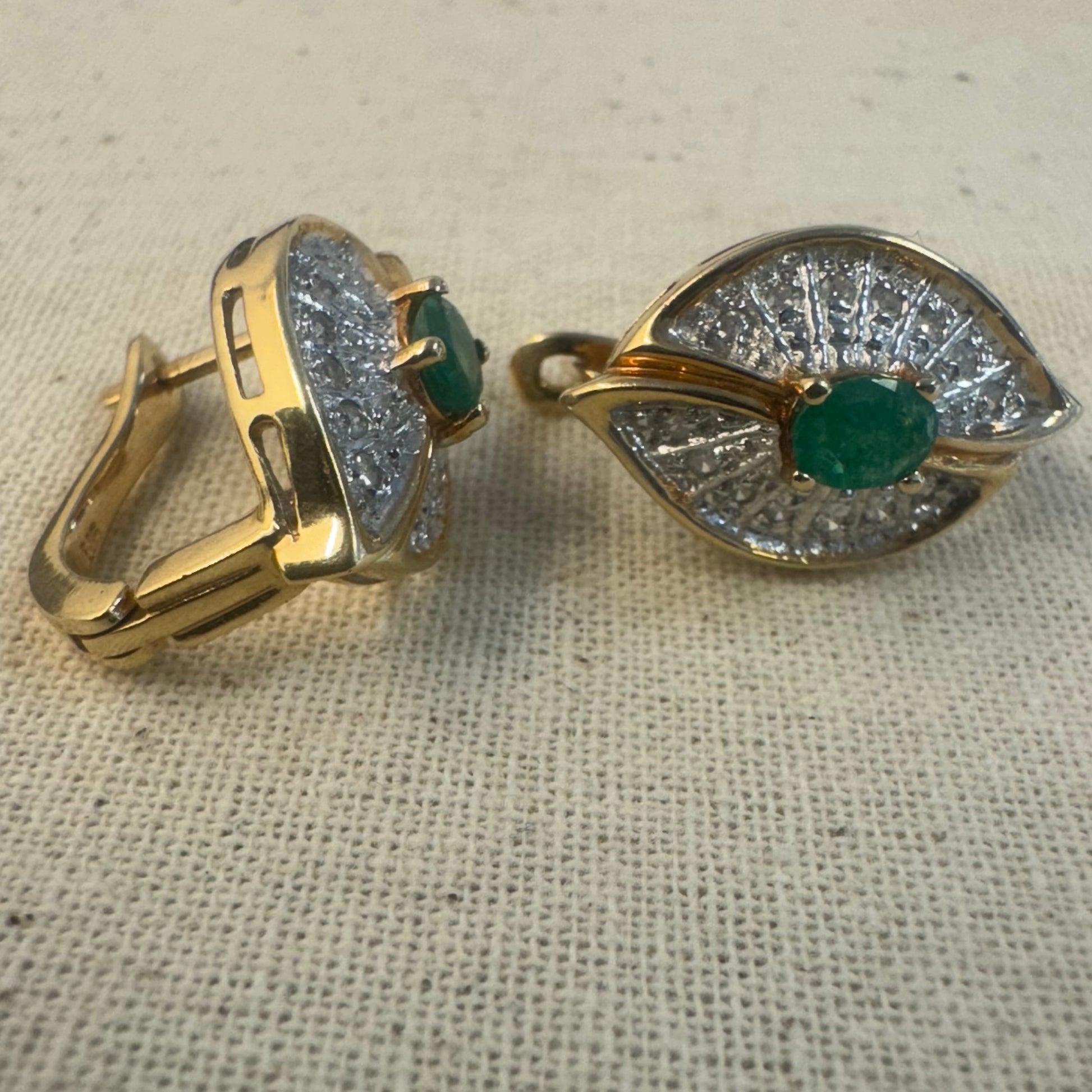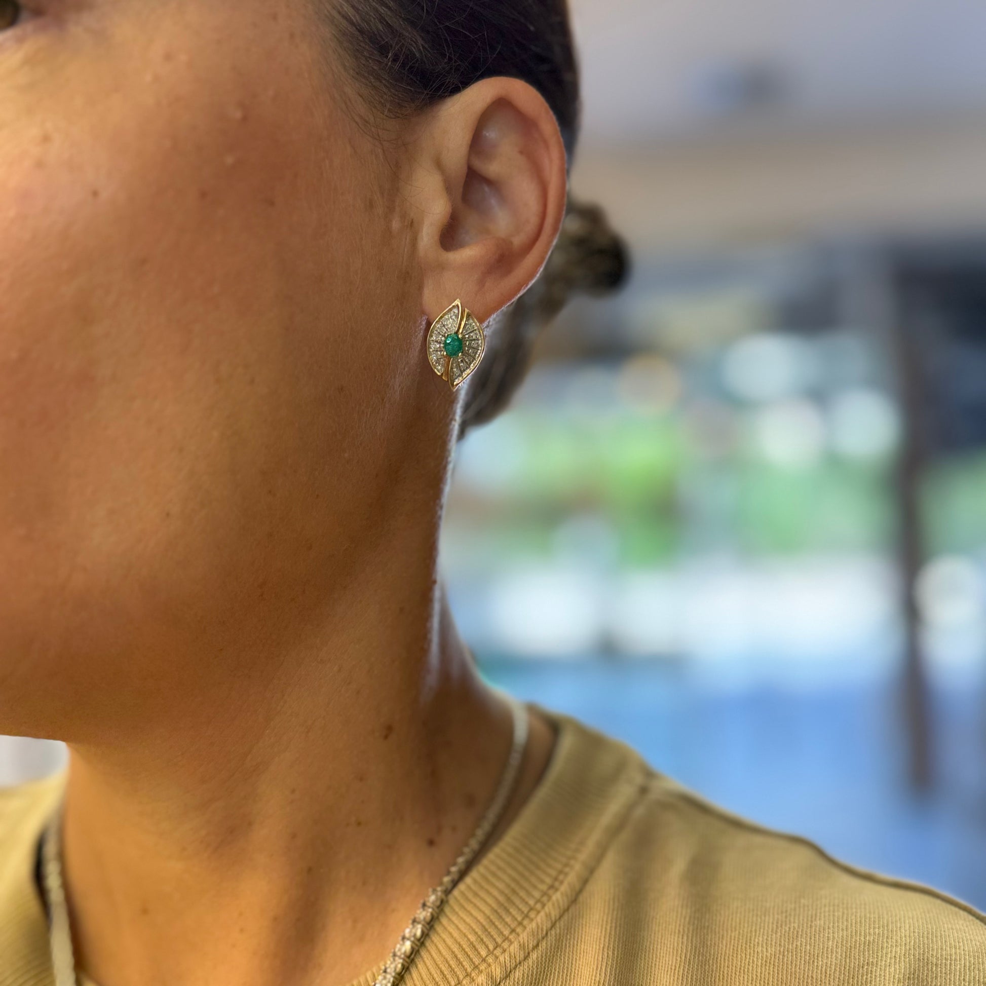 עגילים צמודים לאוזן, זהב צהוב 14 קראט, משובצים אמרלד במרכז, וסביבן פיתוחים משובצים יהלומים, שמעניקים מראה של ניצוץ רך ואלגנטי