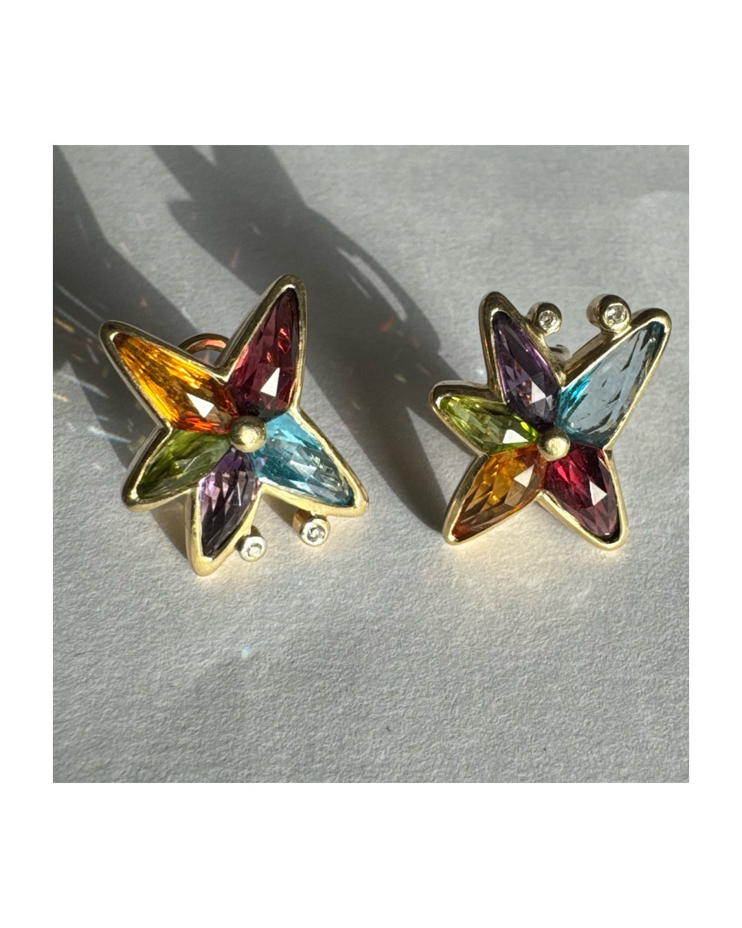 עגילי זהב צהוב 14 קראט בעיצוב כוכב משובצים אבני חן צבעוניות בחיתוך מרקיז, היוצרות מראה של כוכב זוהר מלא חיים.