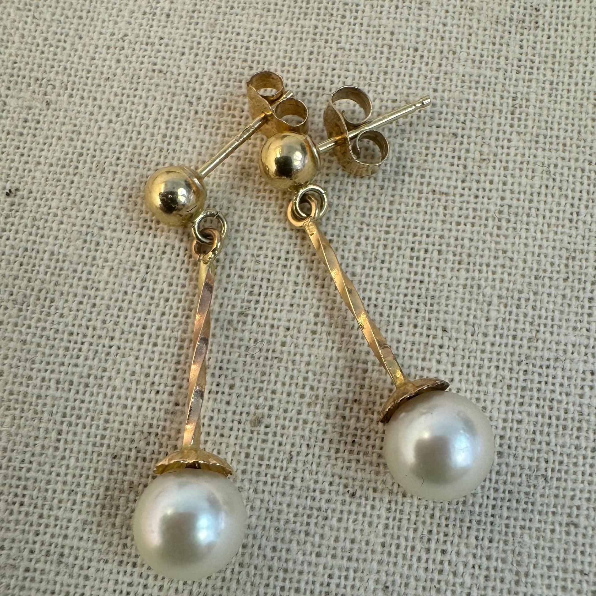 עגילי זהב צהוב 14 קראט נופלים משובצים פנינה עגולה