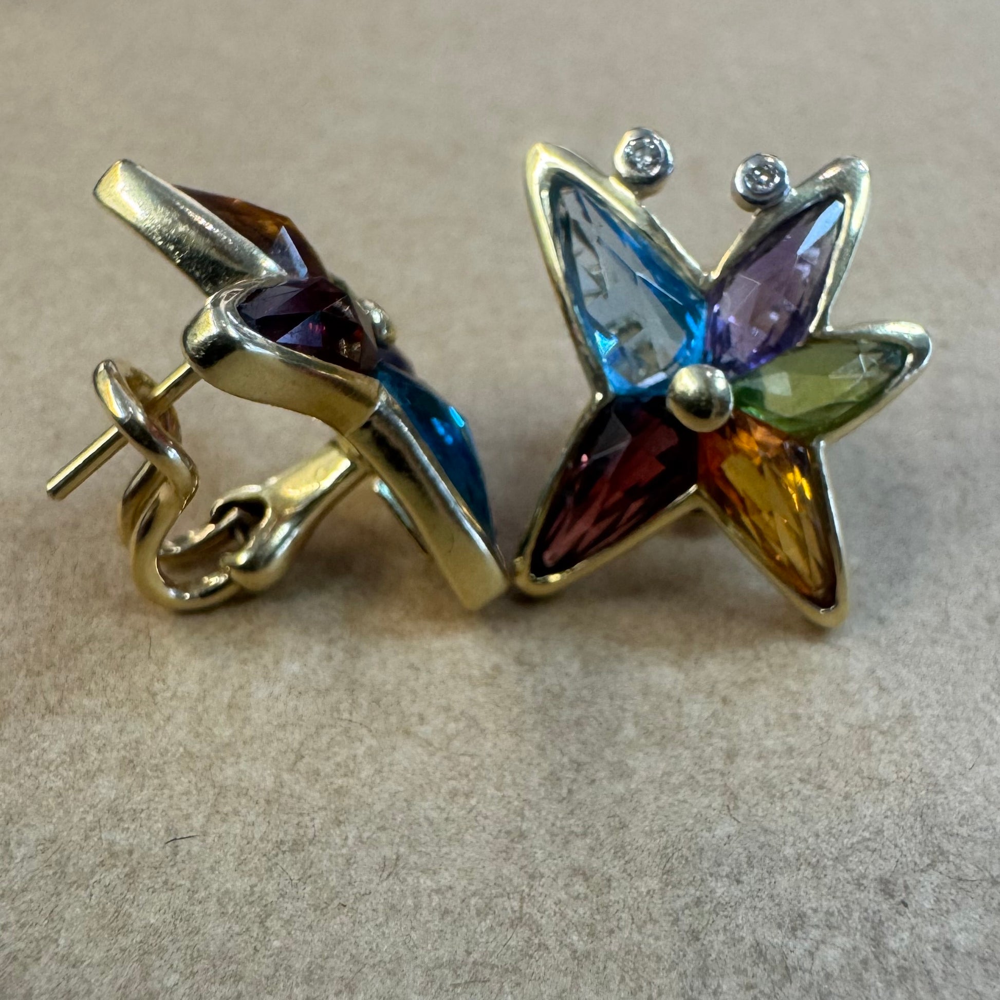 עגילי זהב צהוב 14 קראט צמודים לאוזן משובצים מבחר אבני חן ויהלומים.
