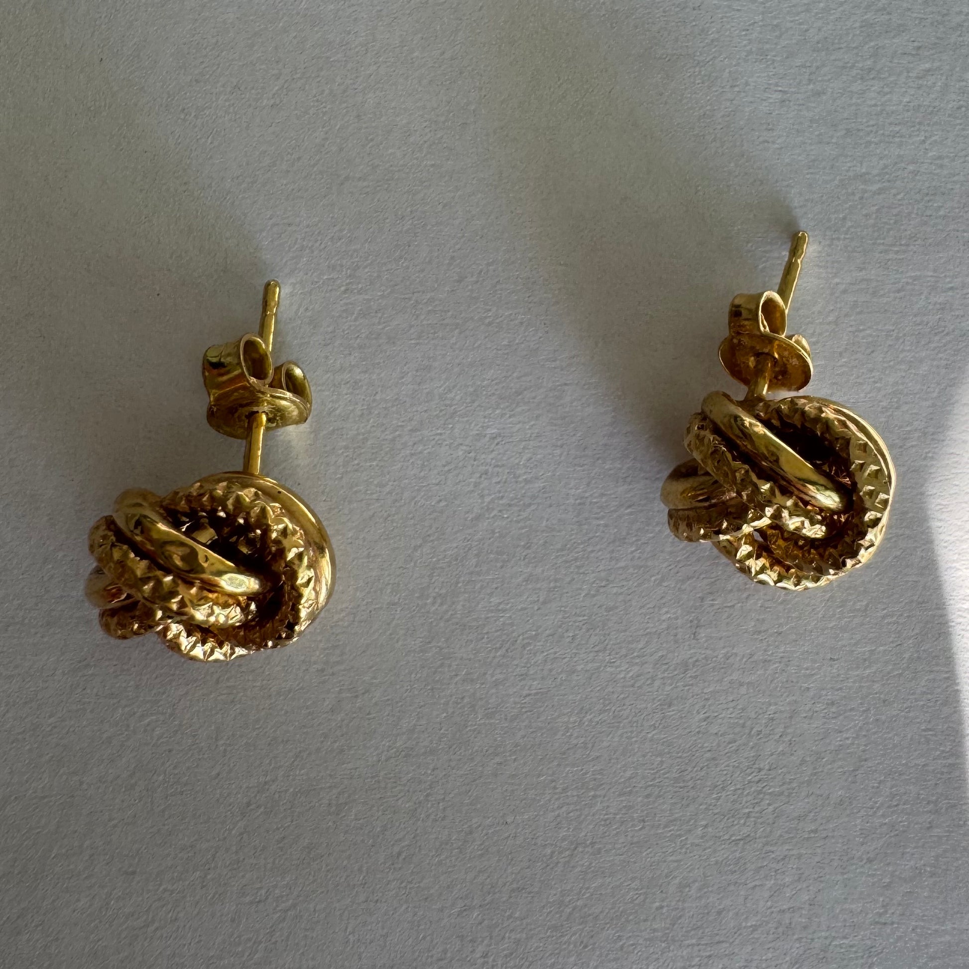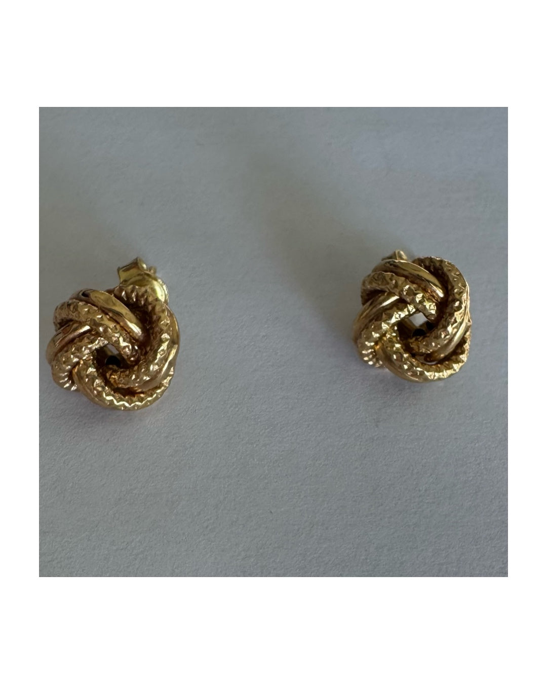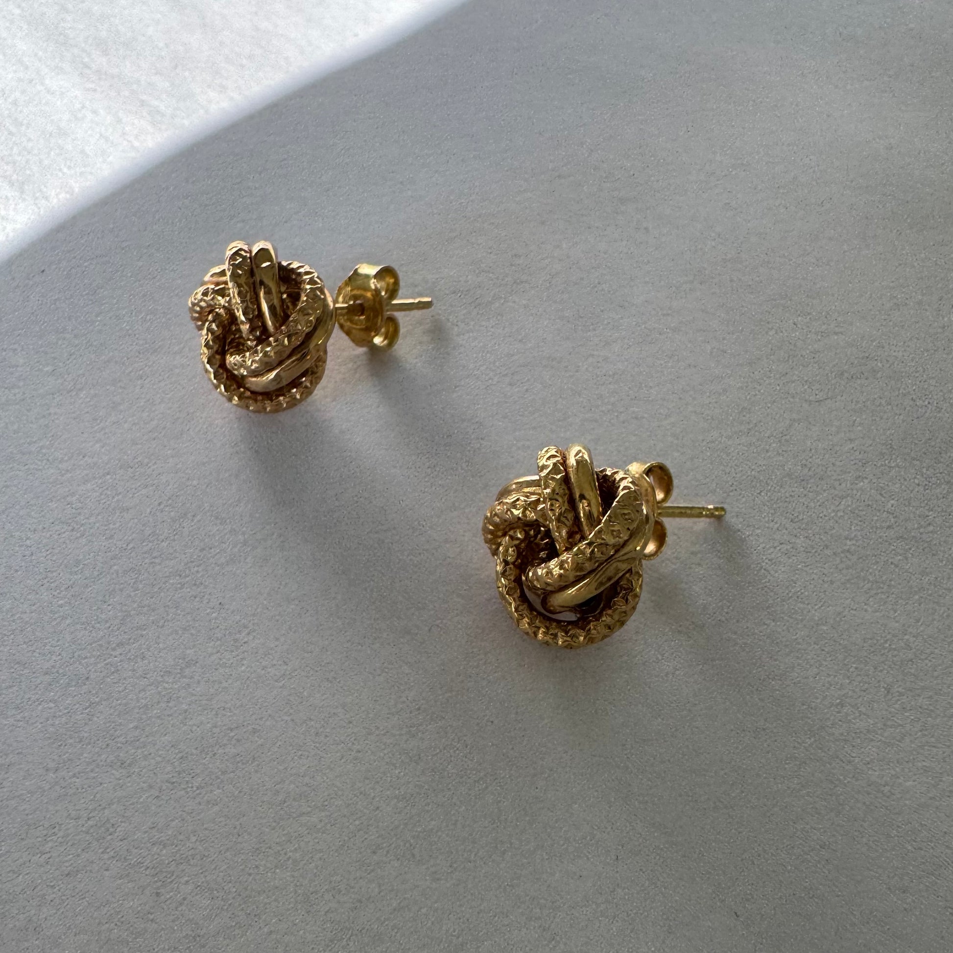 עגילי זהב צהוב 18 קראט בעיצוב קשר פיסולי, עם טקסטורה עשירה המדגישה את עומק וצורת הזהב.