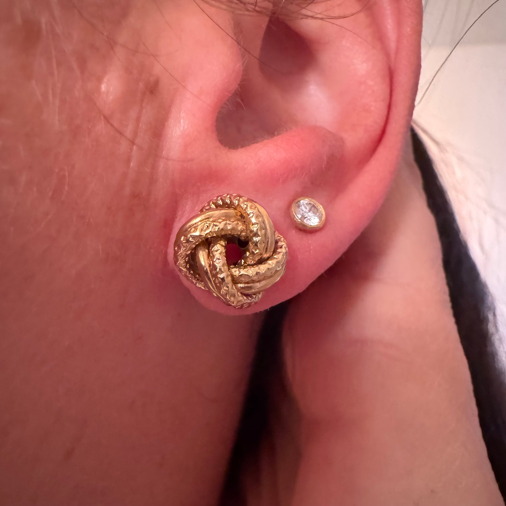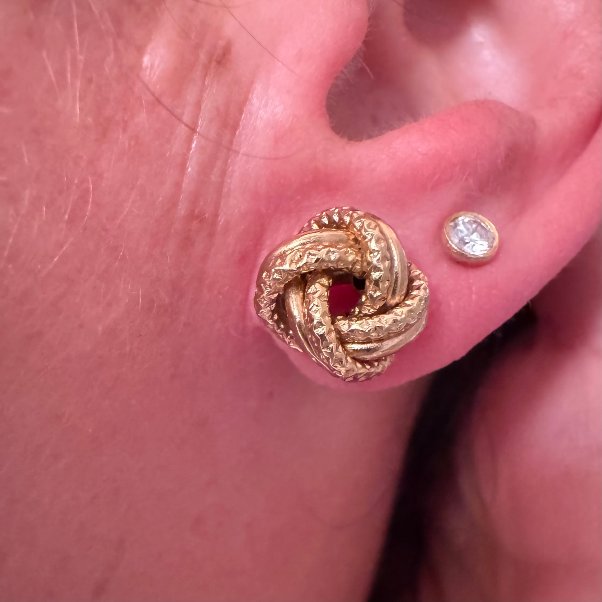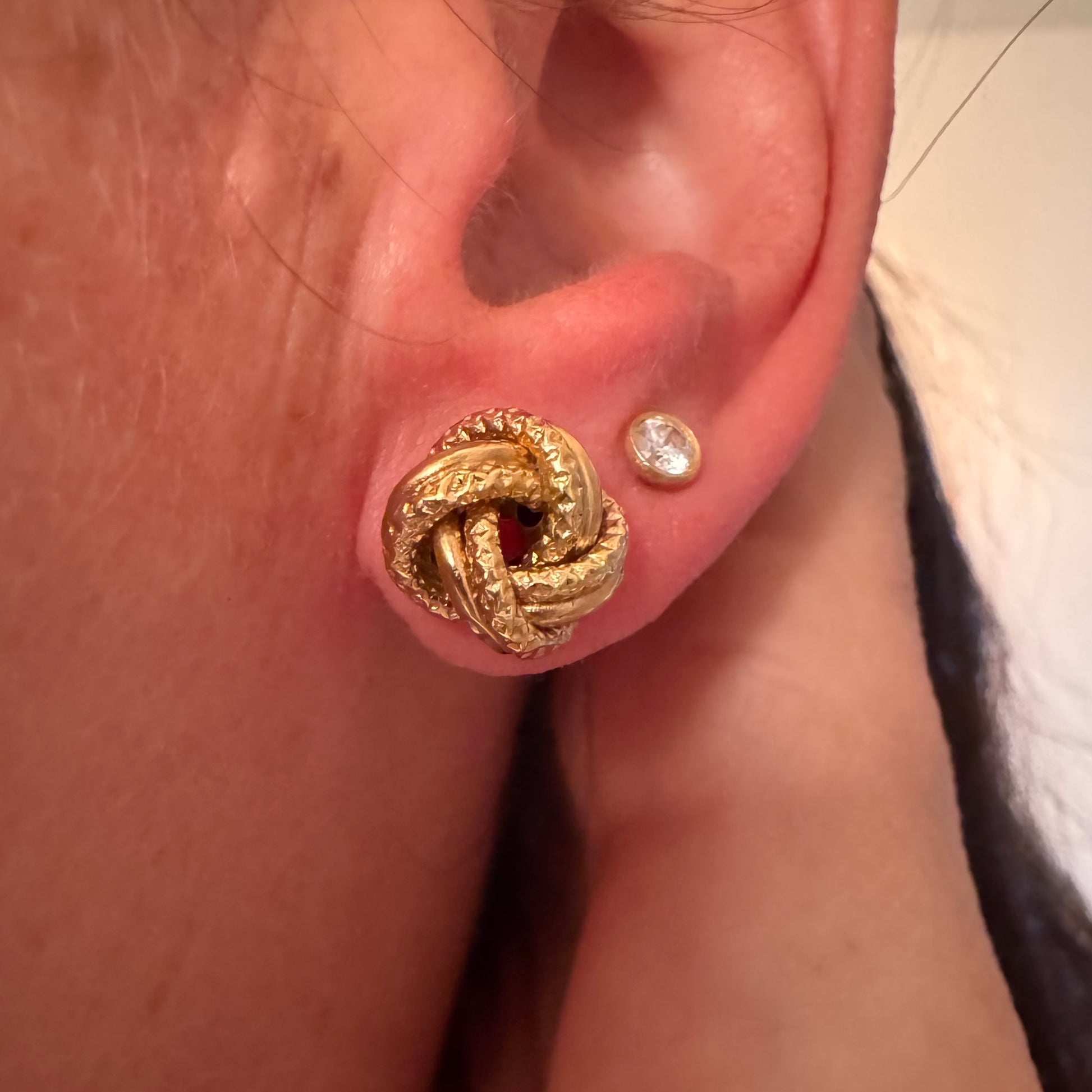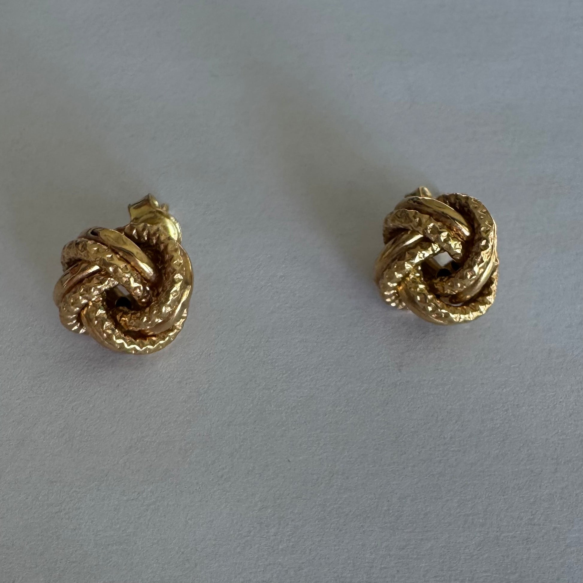 עגילי זהב צהוב 18 קראט בעיצוב קשר פיסולי, עם טקסטורה עשירה המדגישה את עומק וצורת הזהב.