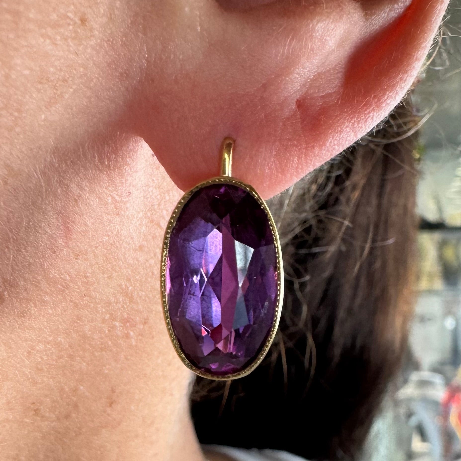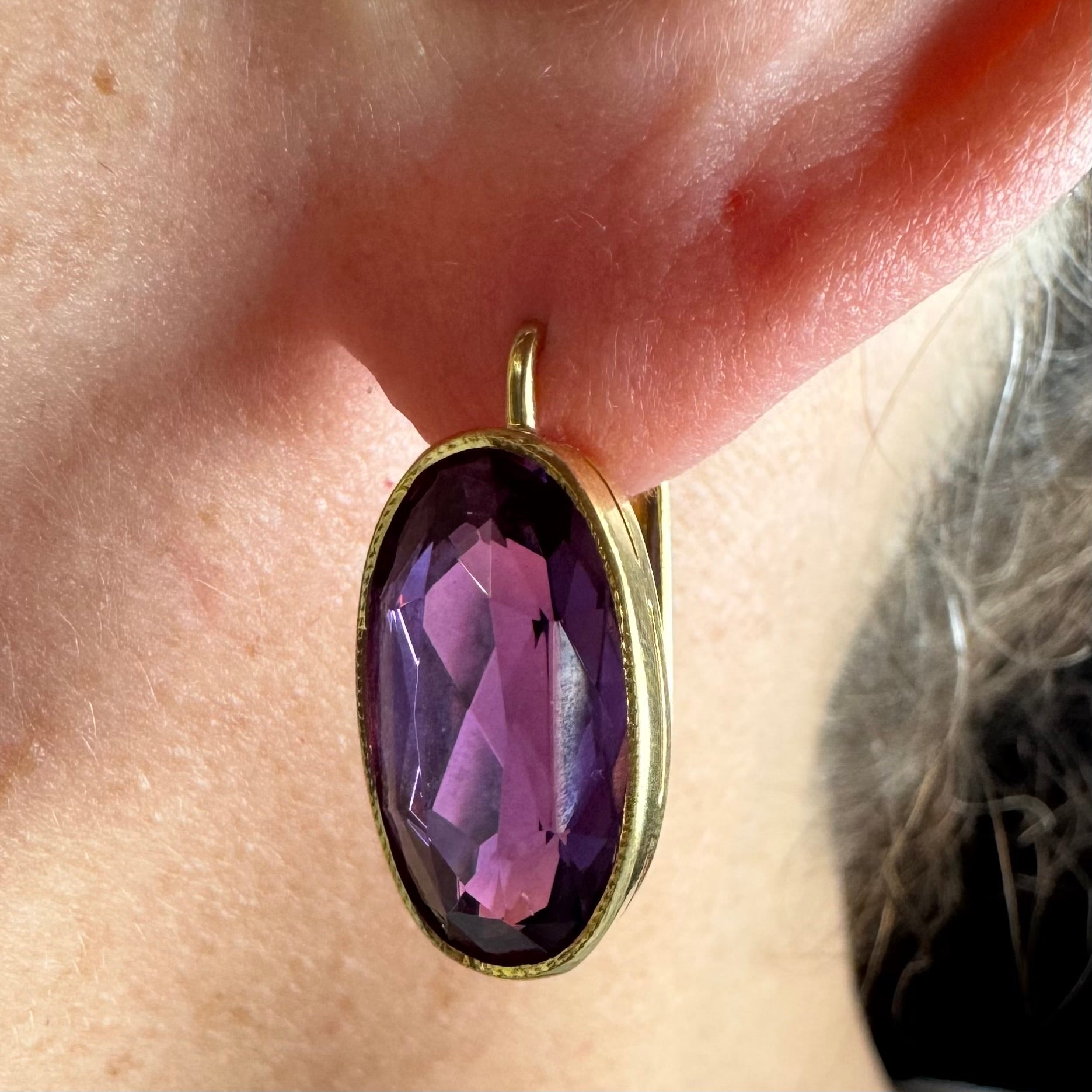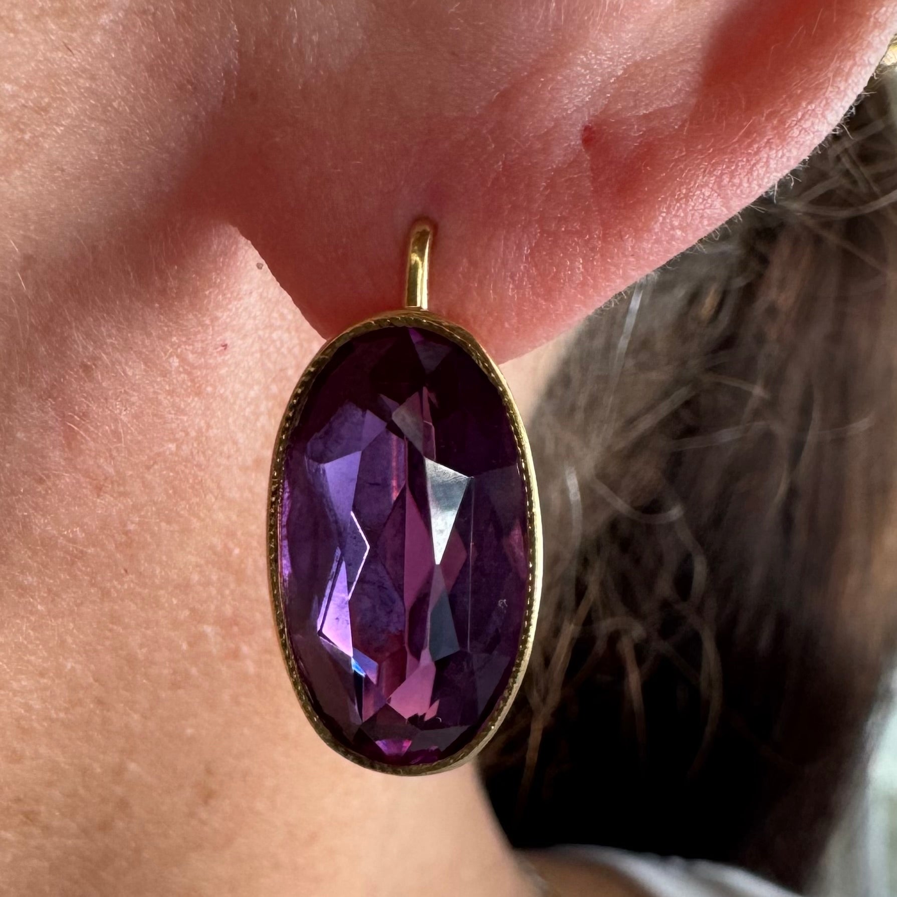 עגילי זהב צהוב 18 קראט, תלויים קצרים, משובצים באבני אמטיסט סגולות בחיתוך אובלי עמוק.