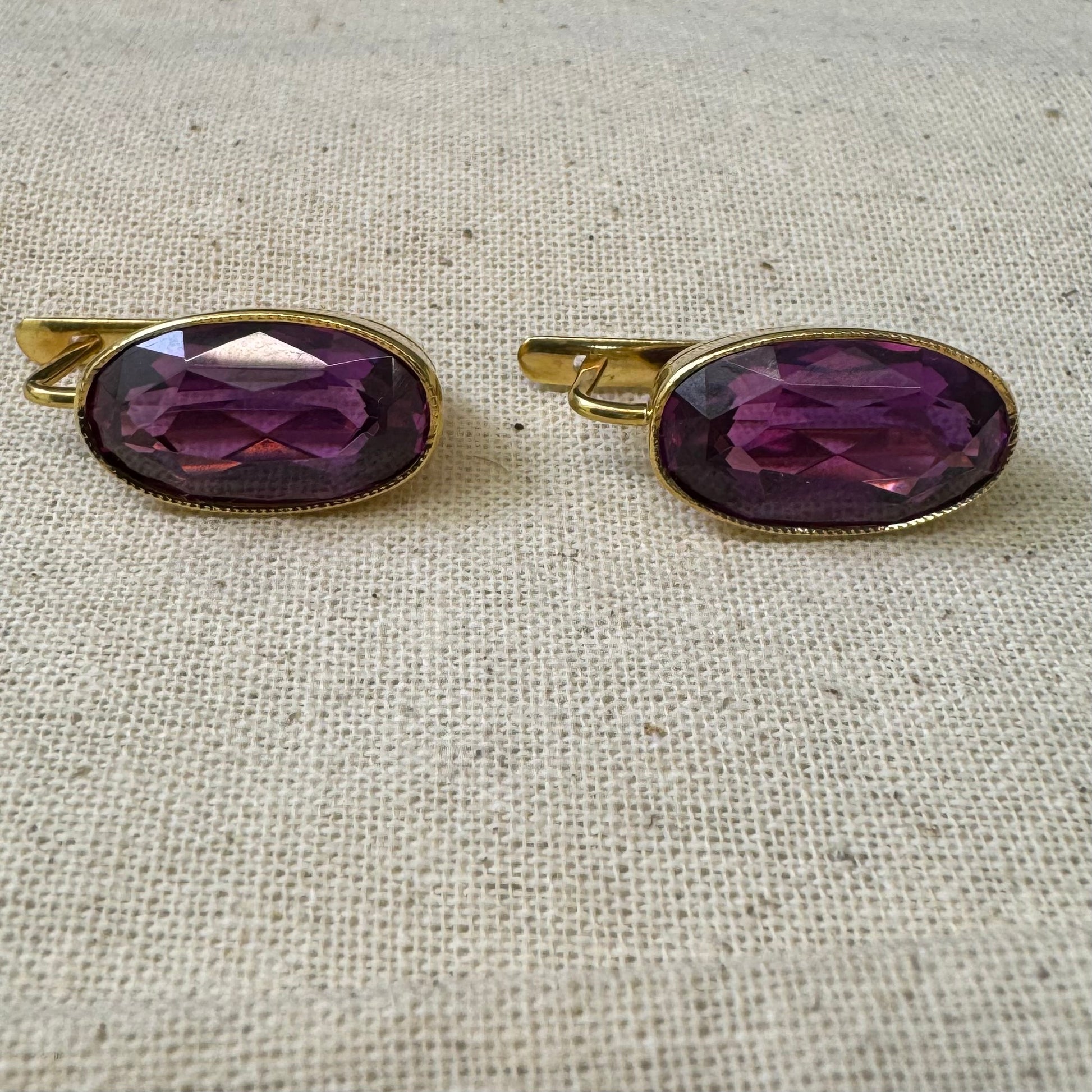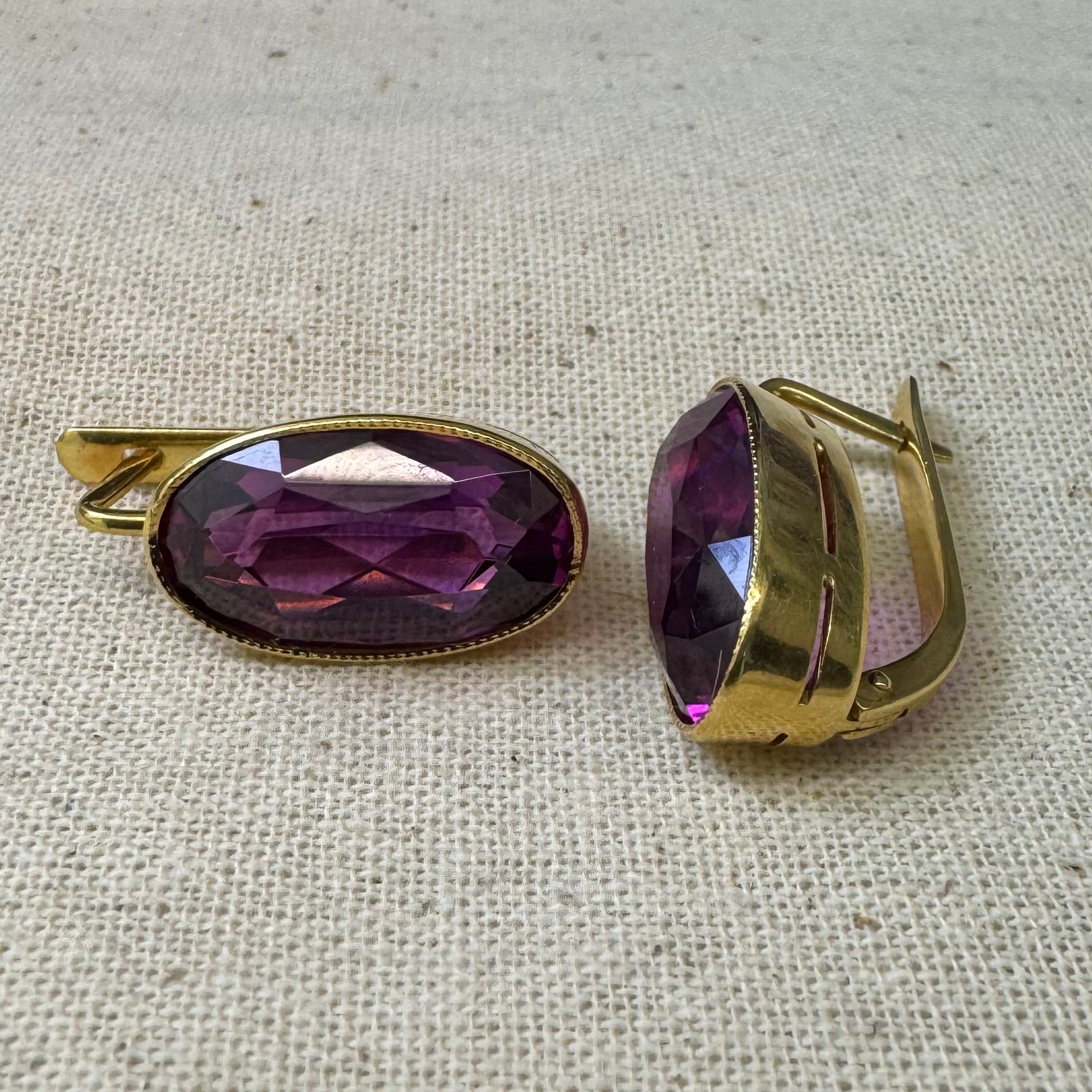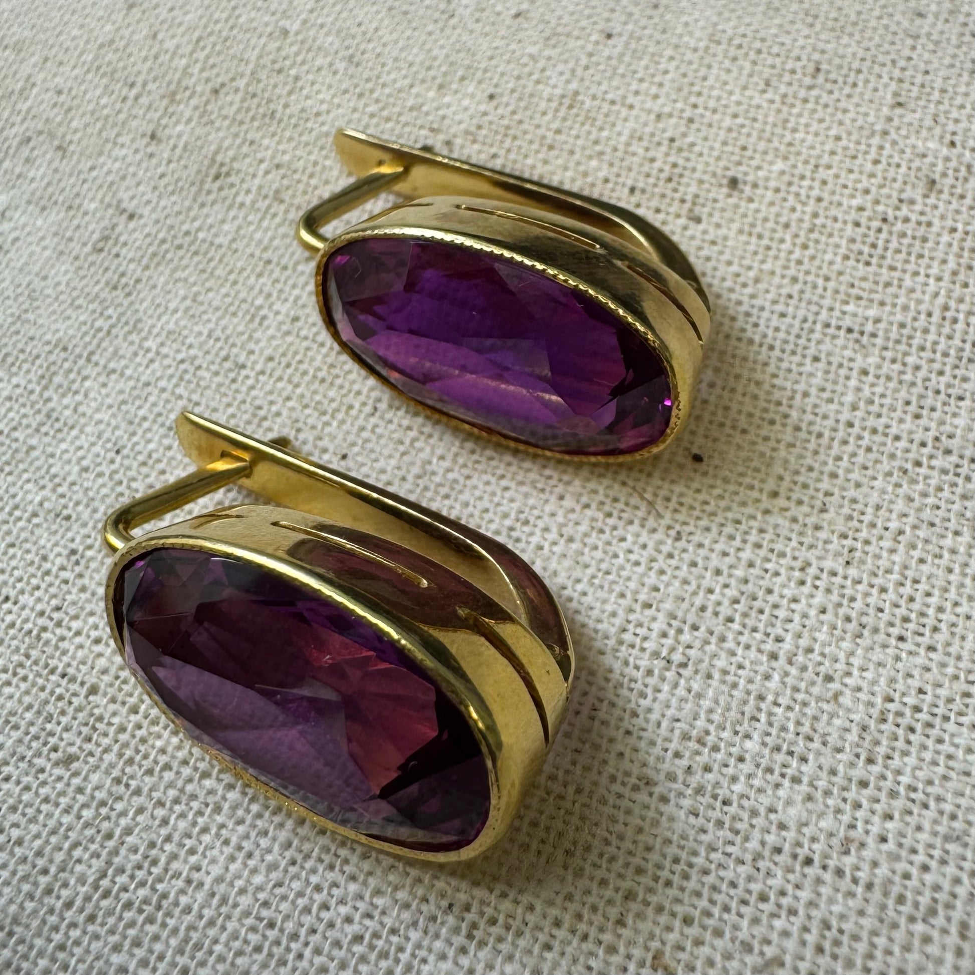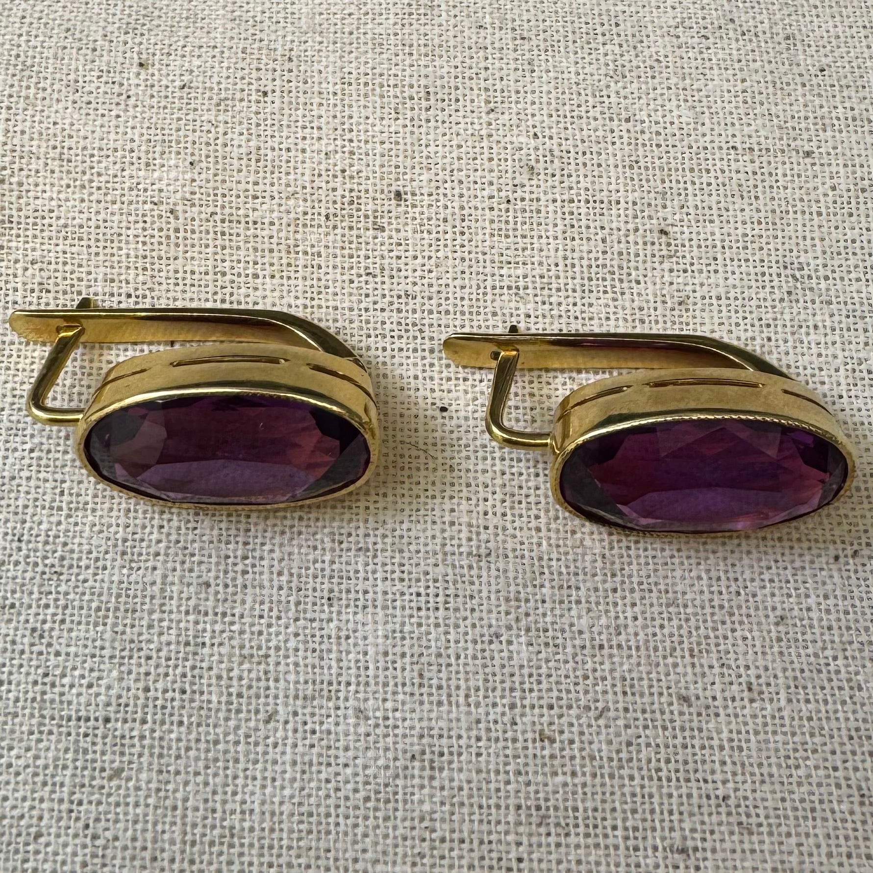 עגילי זהב צהוב 18 קראט, תלויים קצרים, משובצים באבני אמטיסט סגולות בחיתוך אובלי עמוק.