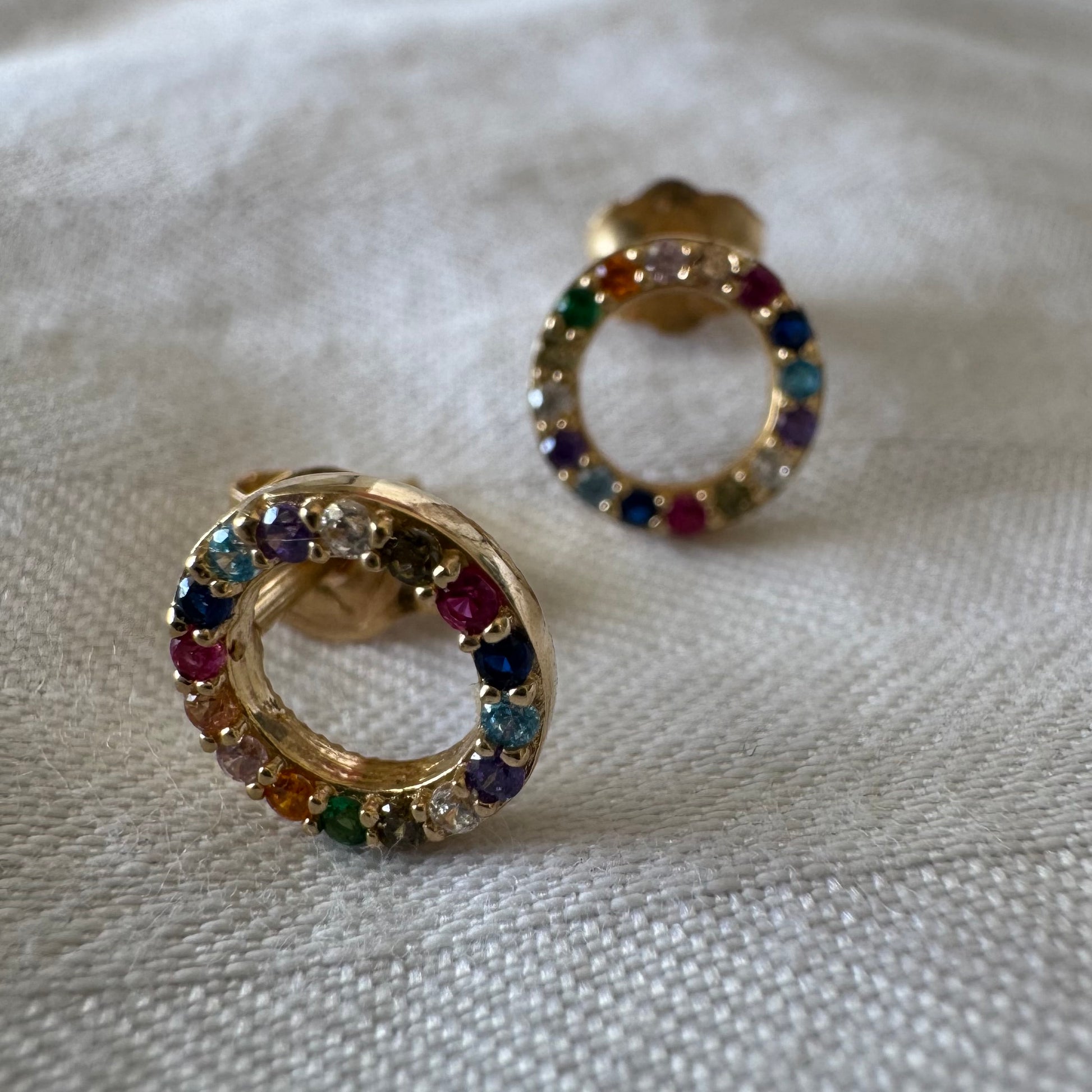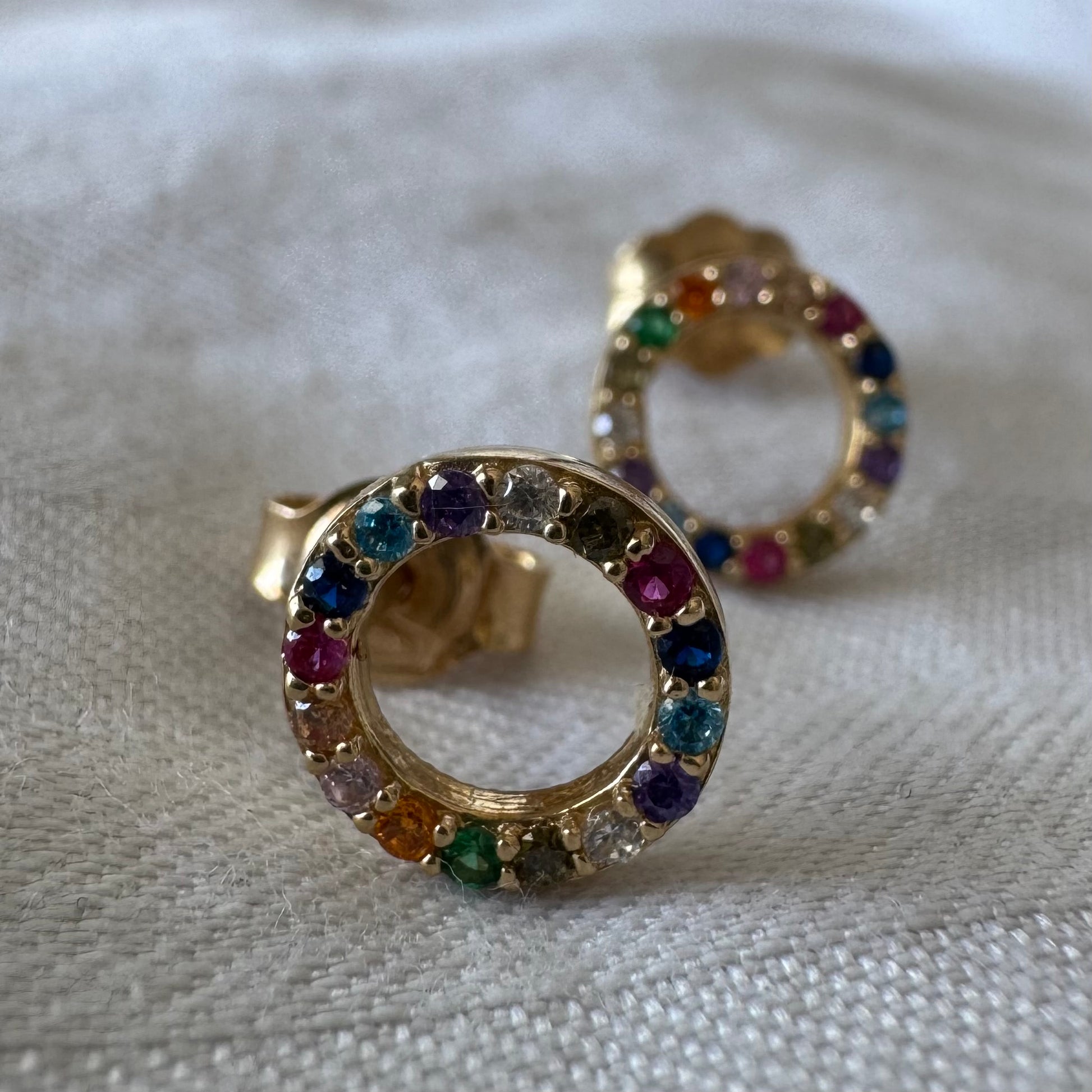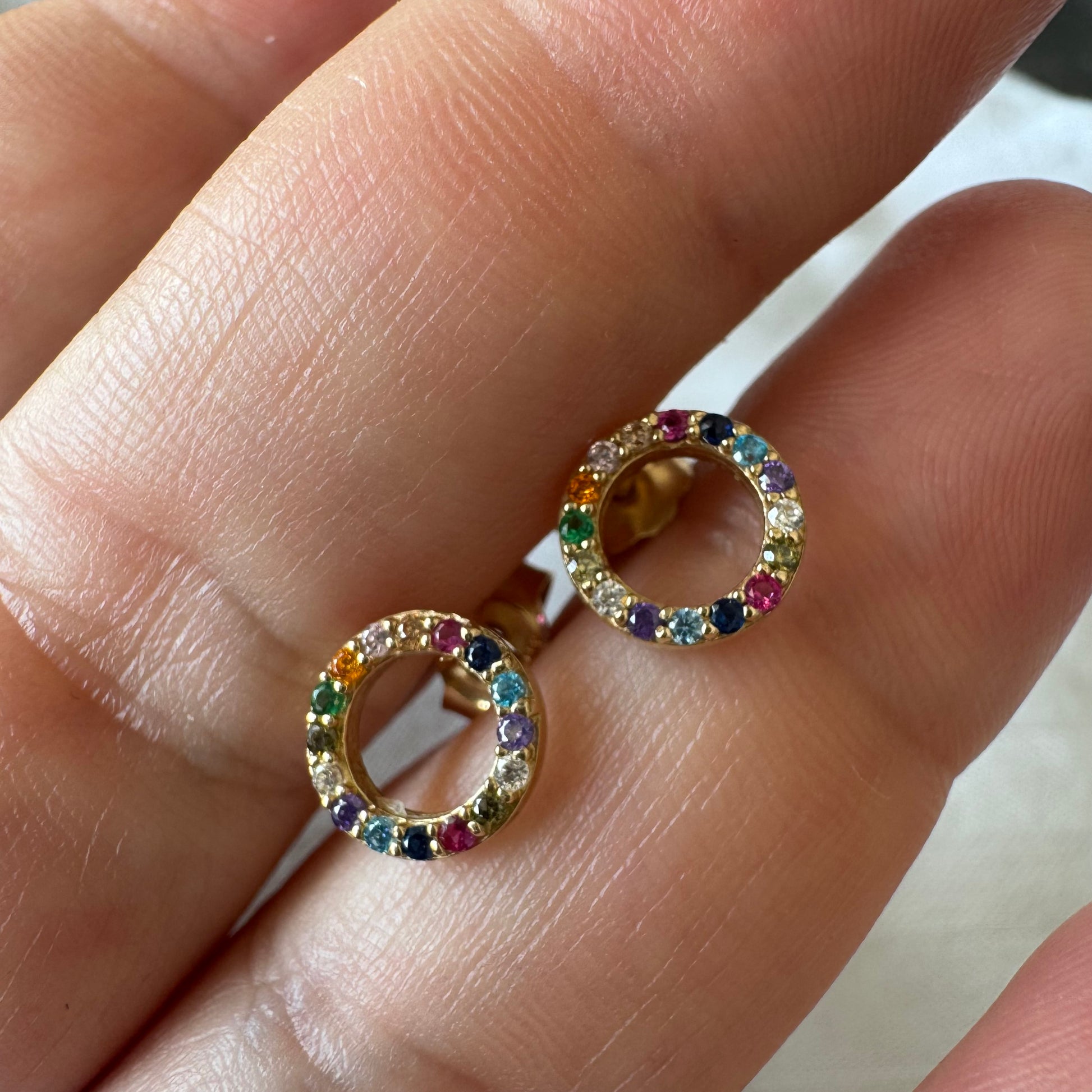 עגילי זהב 14 קראט בעיצוב עיגול קלאסי, משובצים באבני חן צבעוניות בגווני קשת.