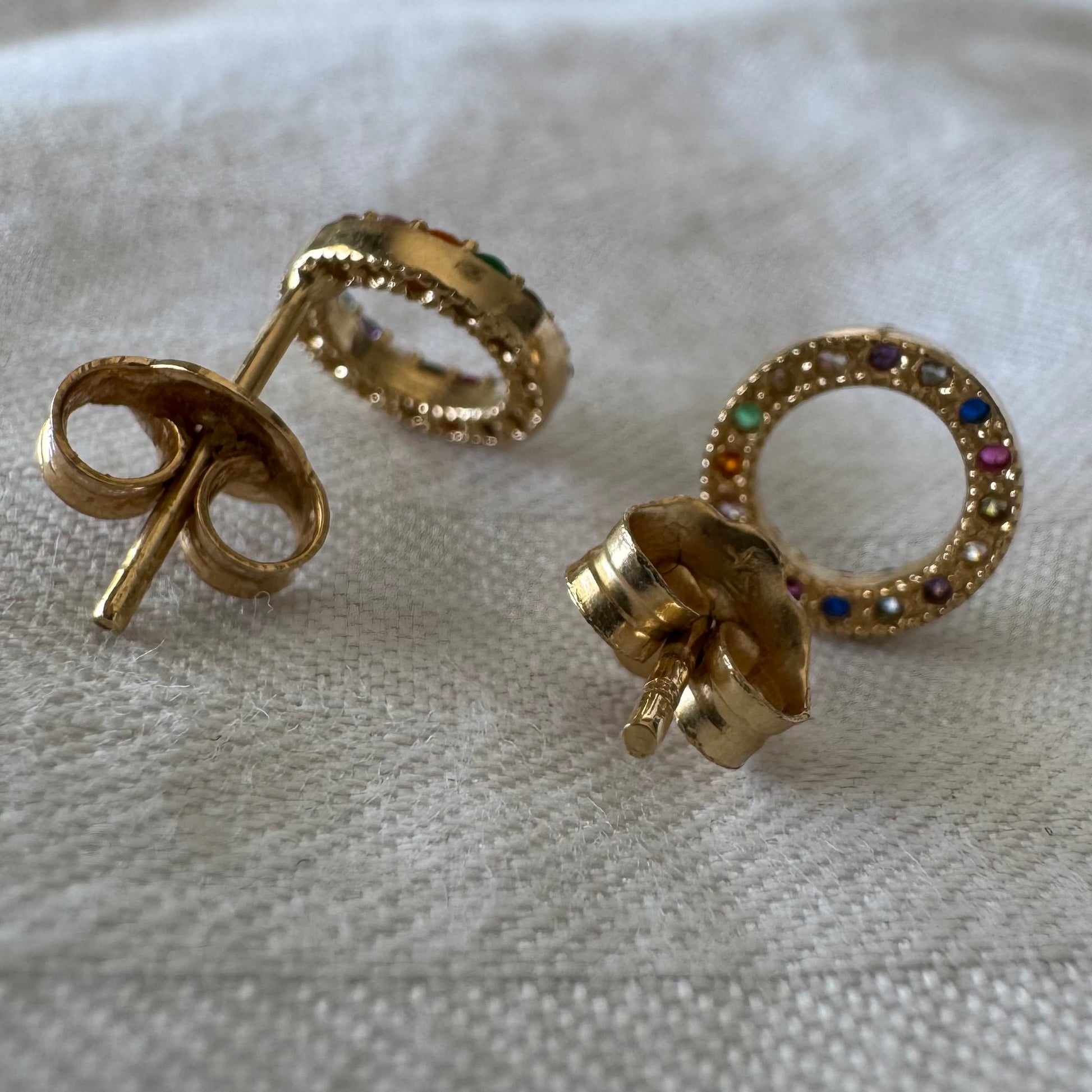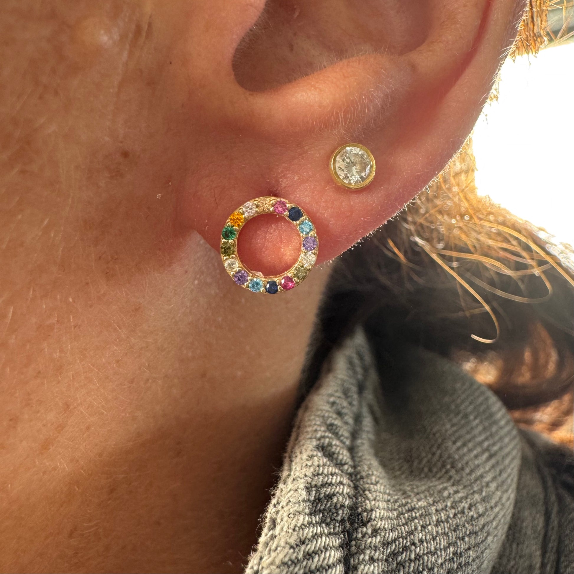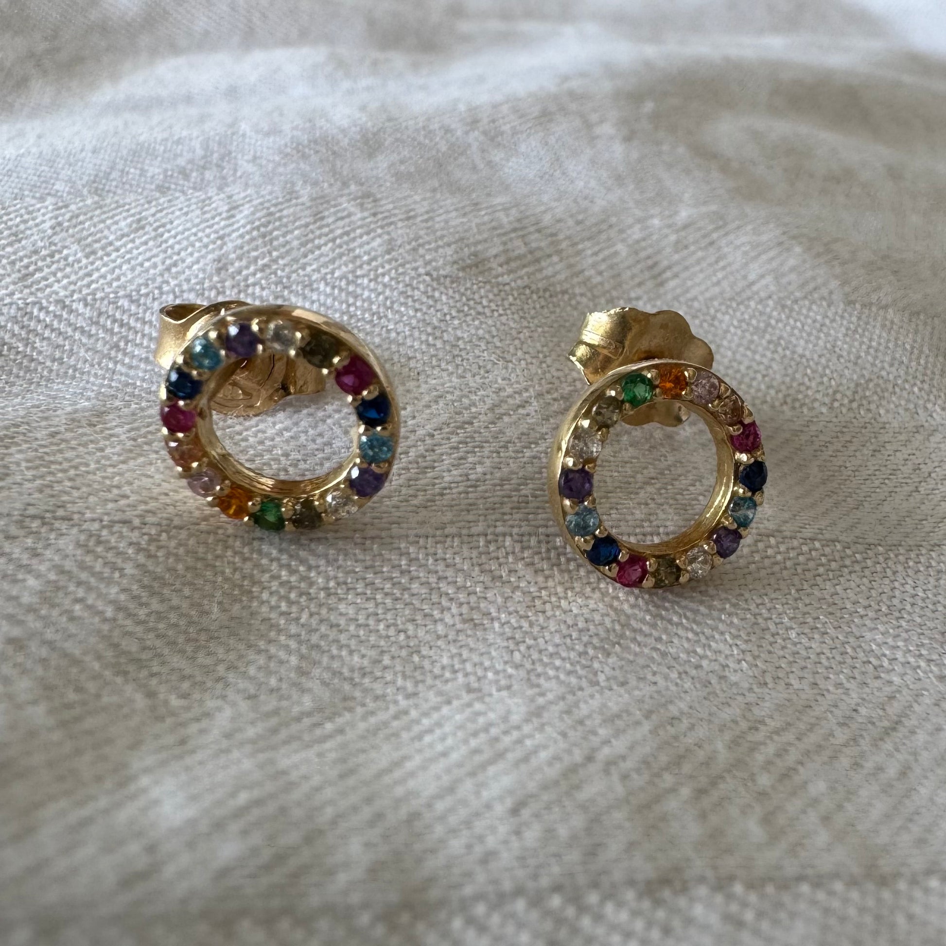 עגילי זהב 14 קראט בעיצוב עיגול קלאסי, משובצים באבני חן צבעוניות בגווני קשת.