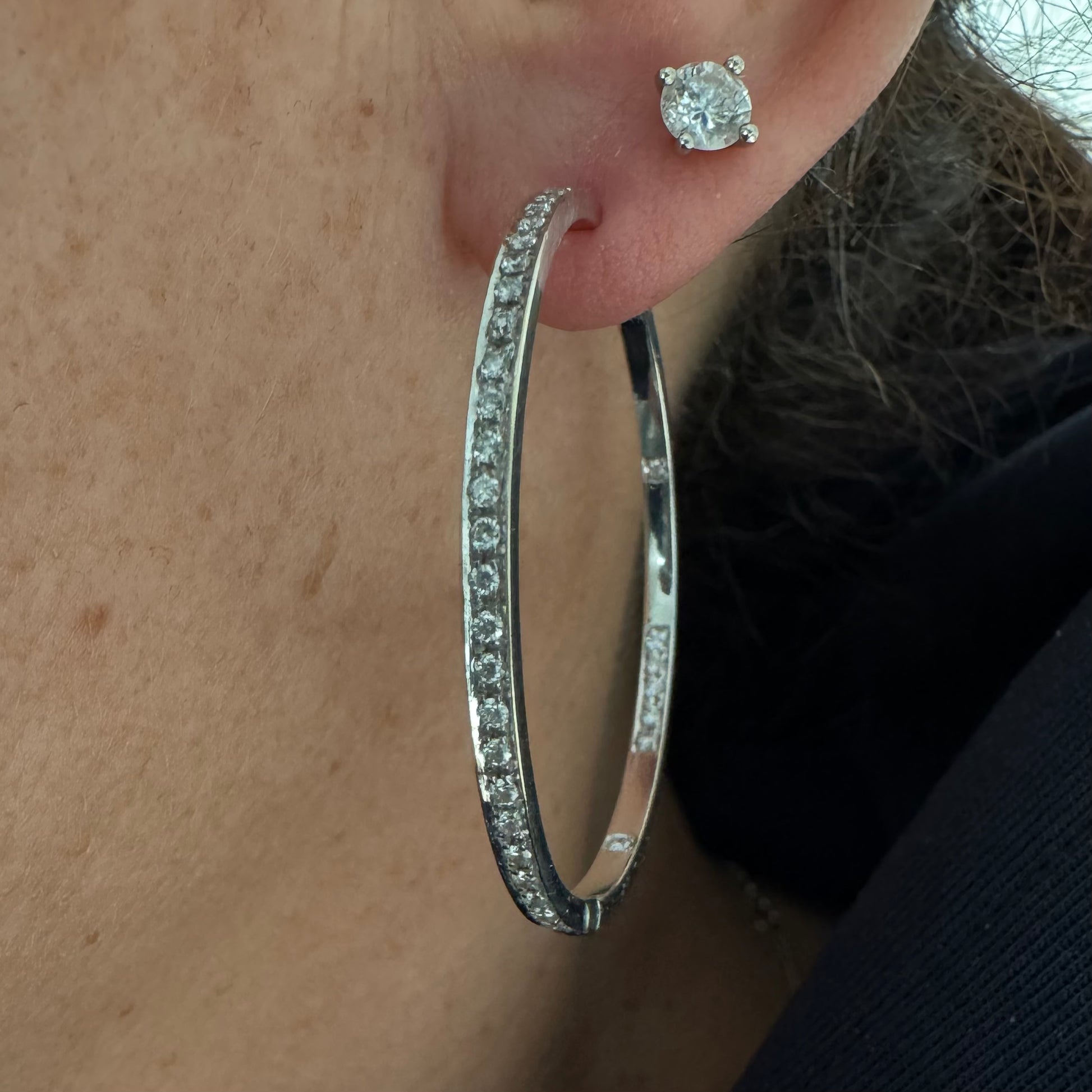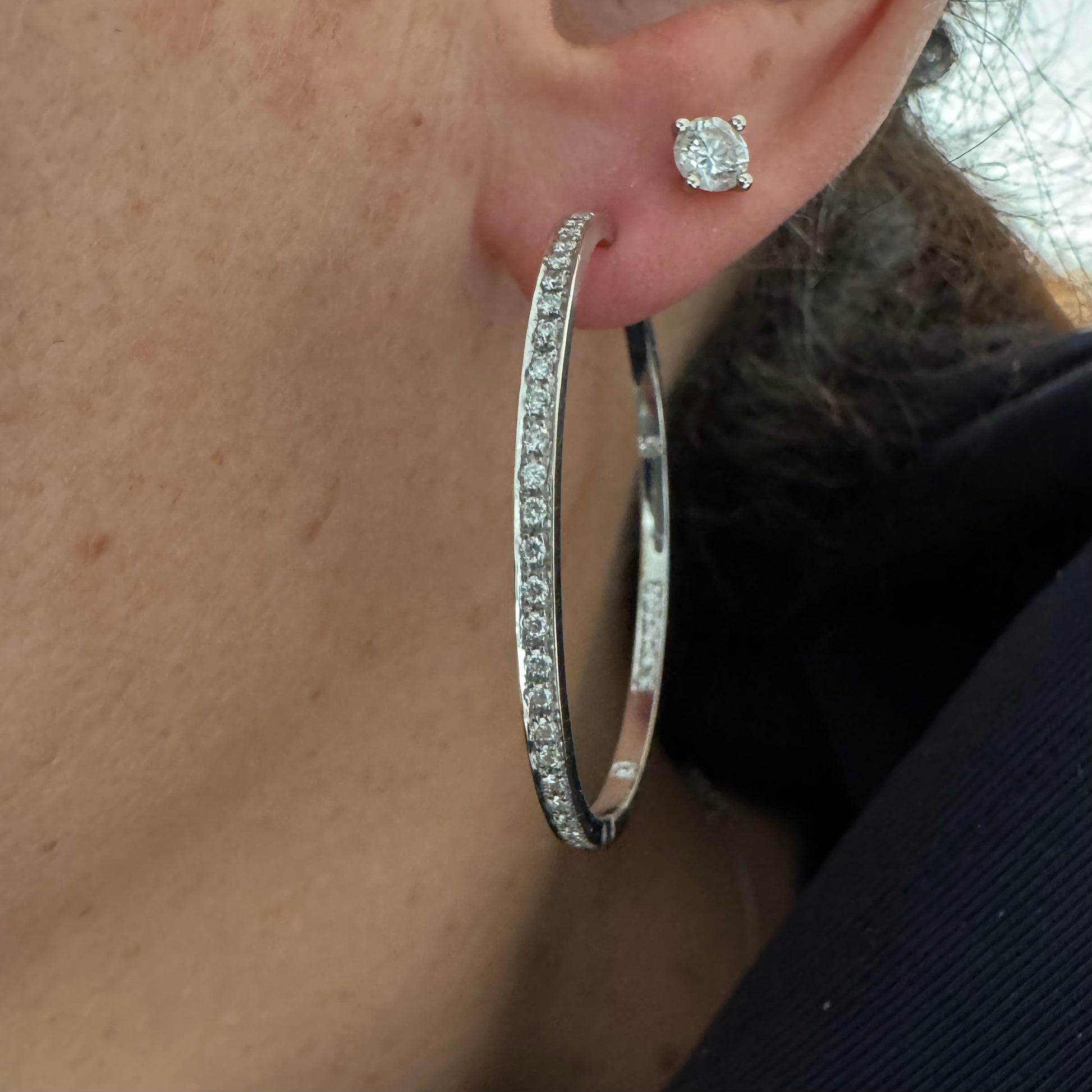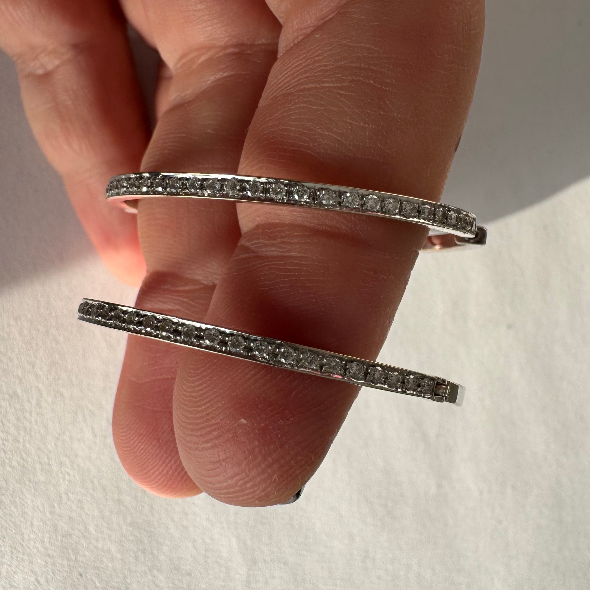 עגילי חישוק זהב 18 קראט, משובצים יהלומים לכל אורכם בחזית ובחלק הפנימי.