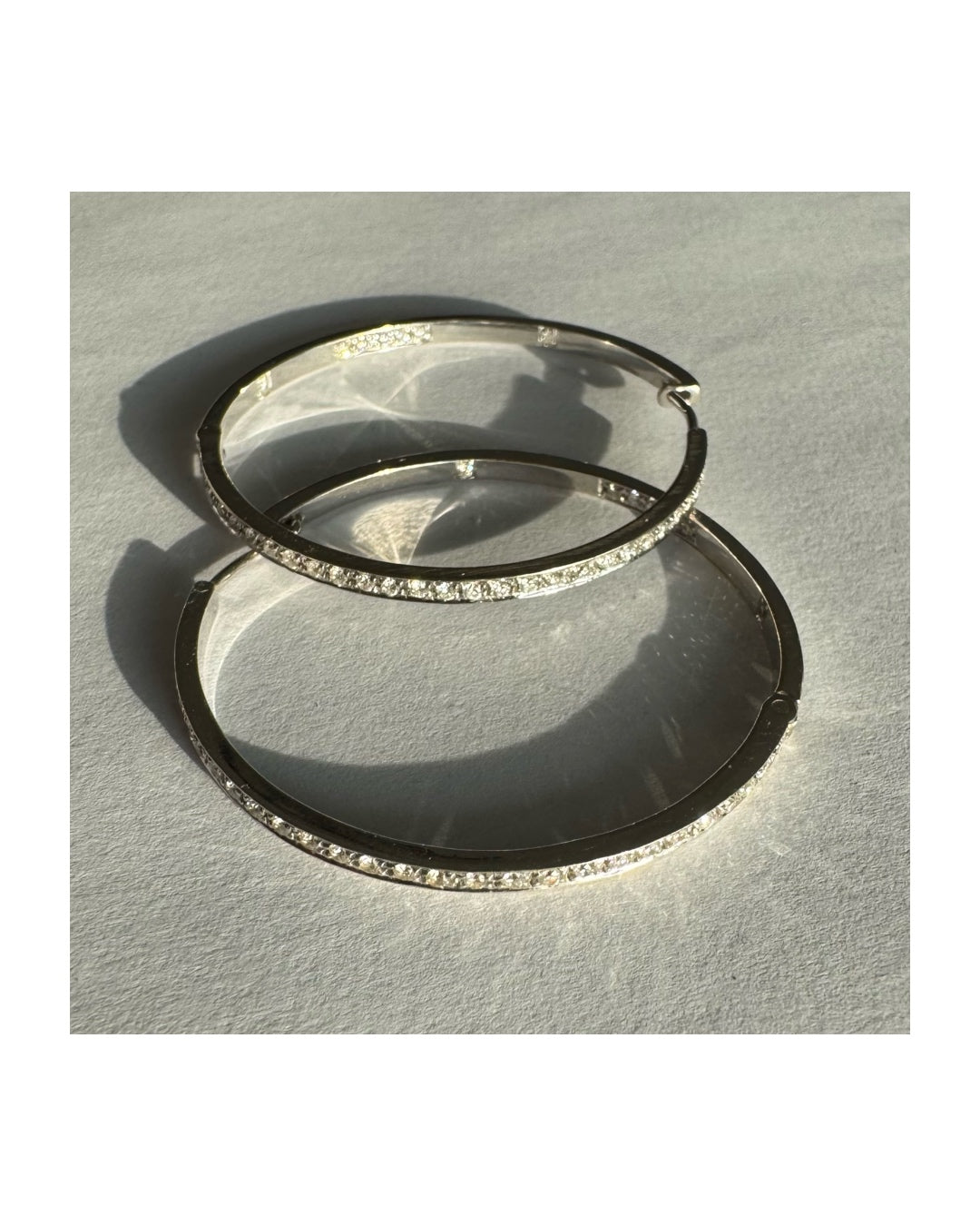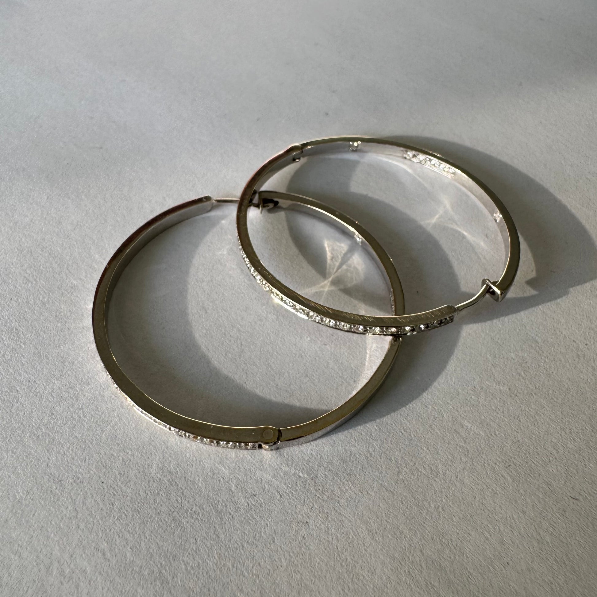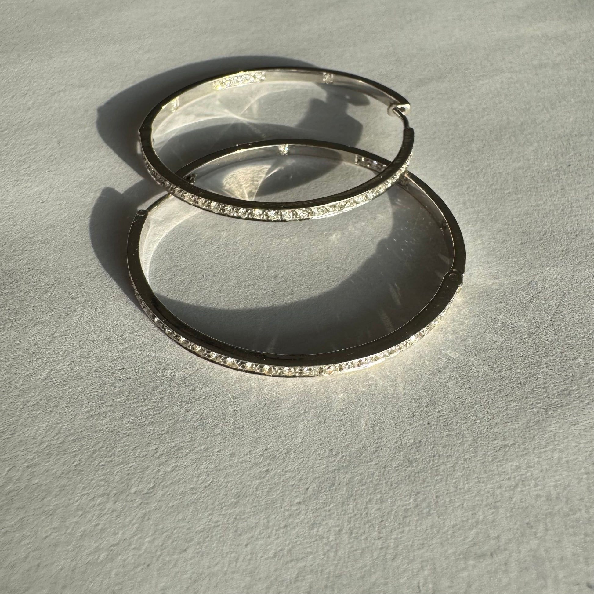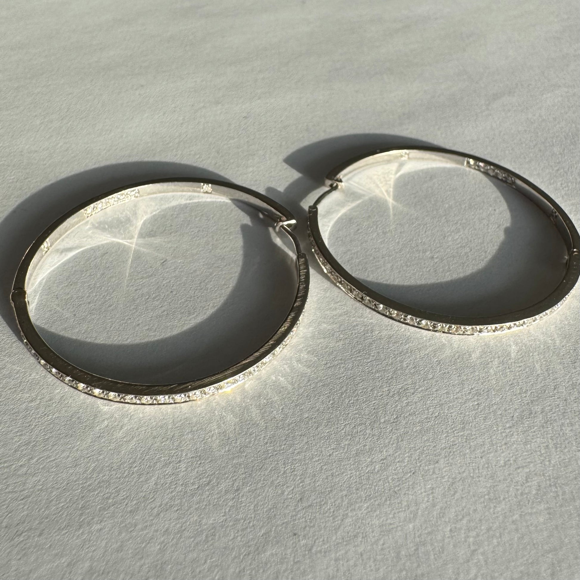 עגילי חישוק זהב 18 קראט, משובצים יהלומים לכל אורכם בחזית ובחלק הפנימי.