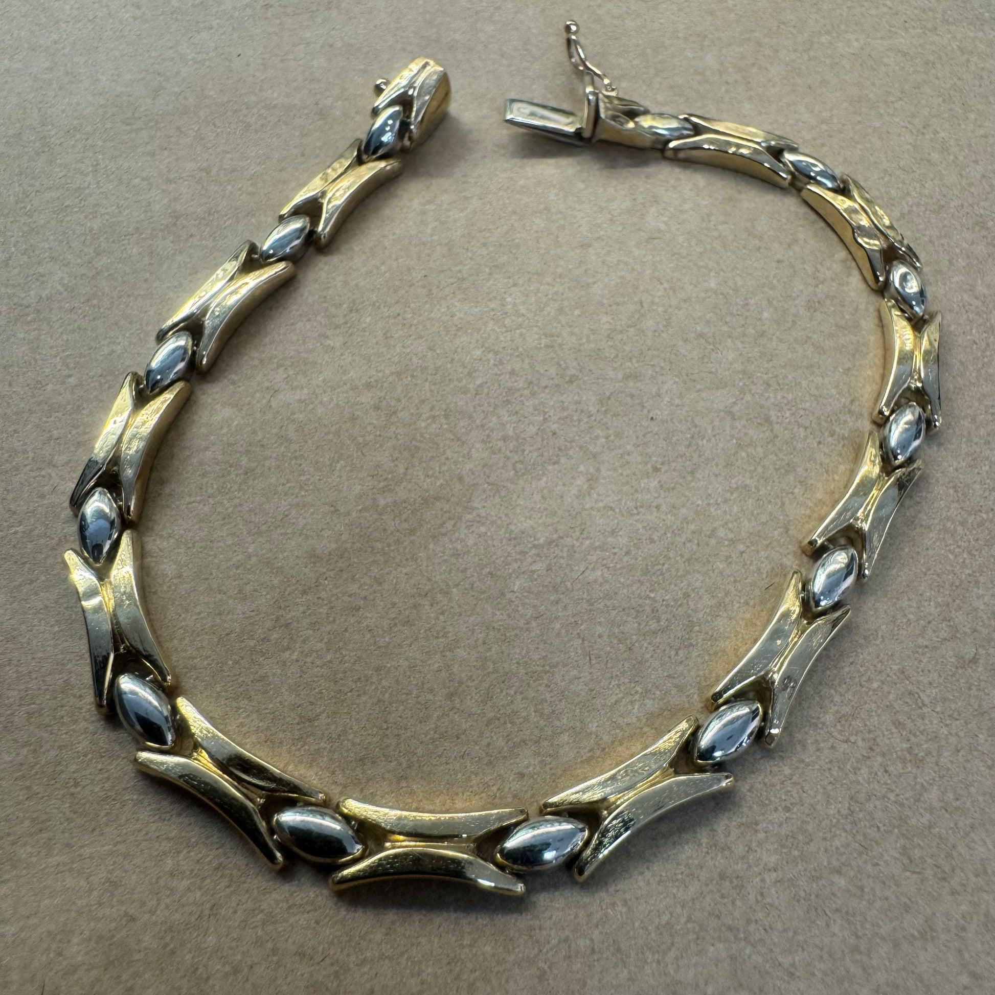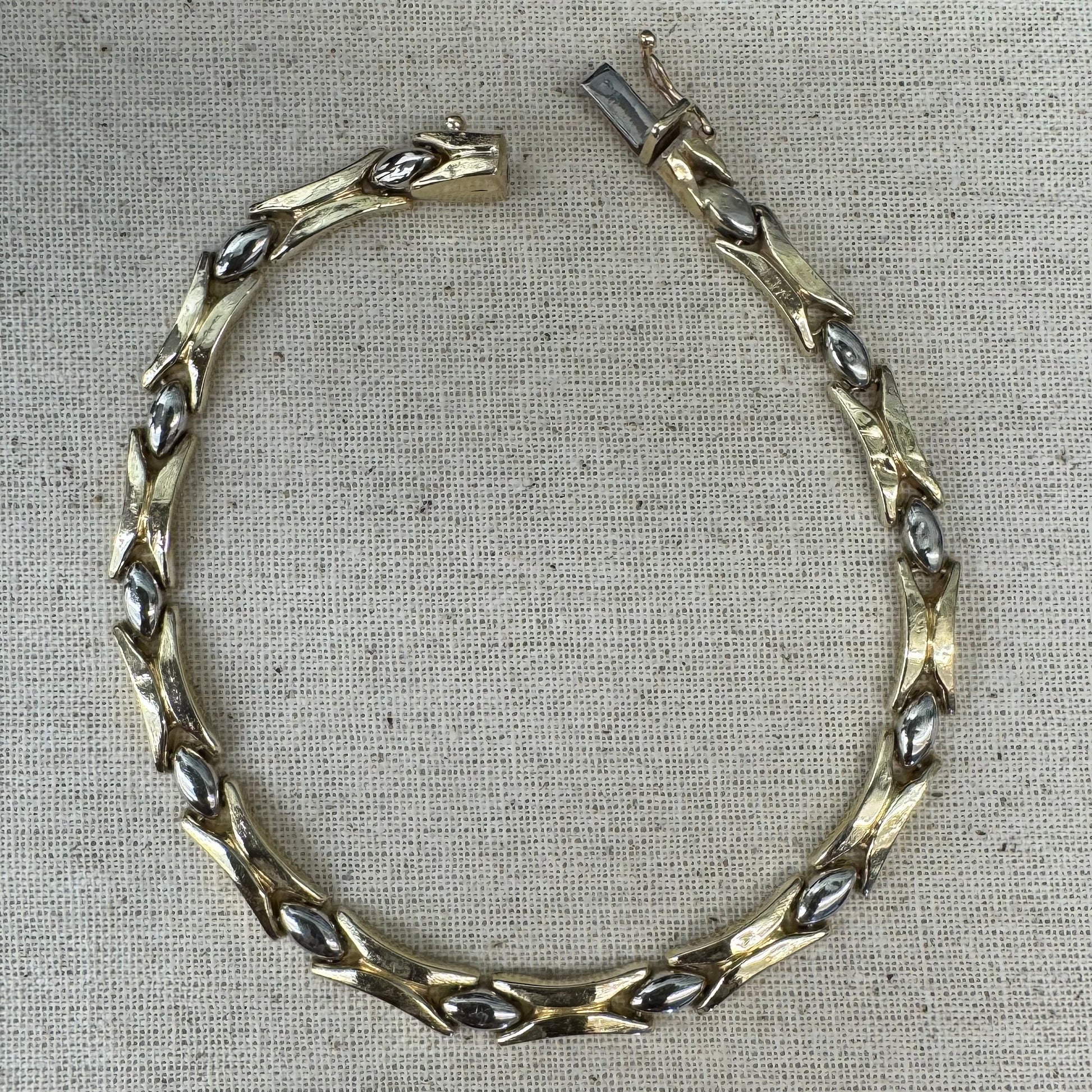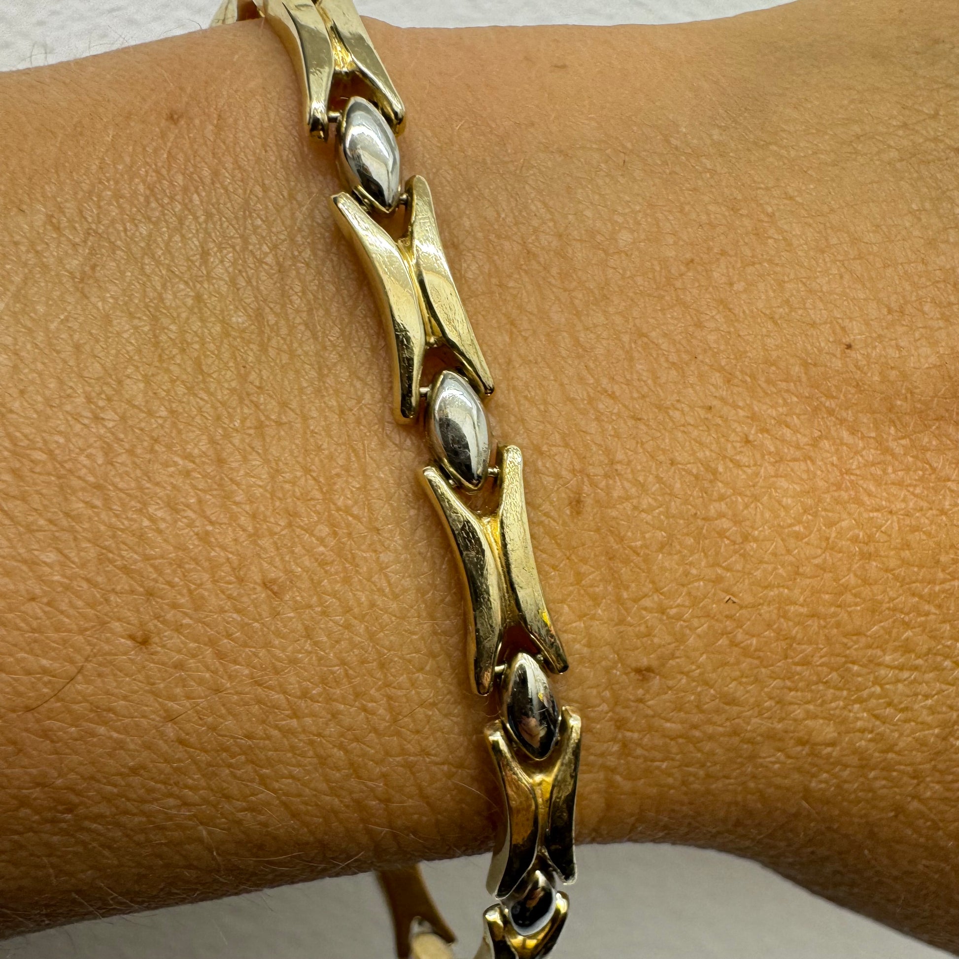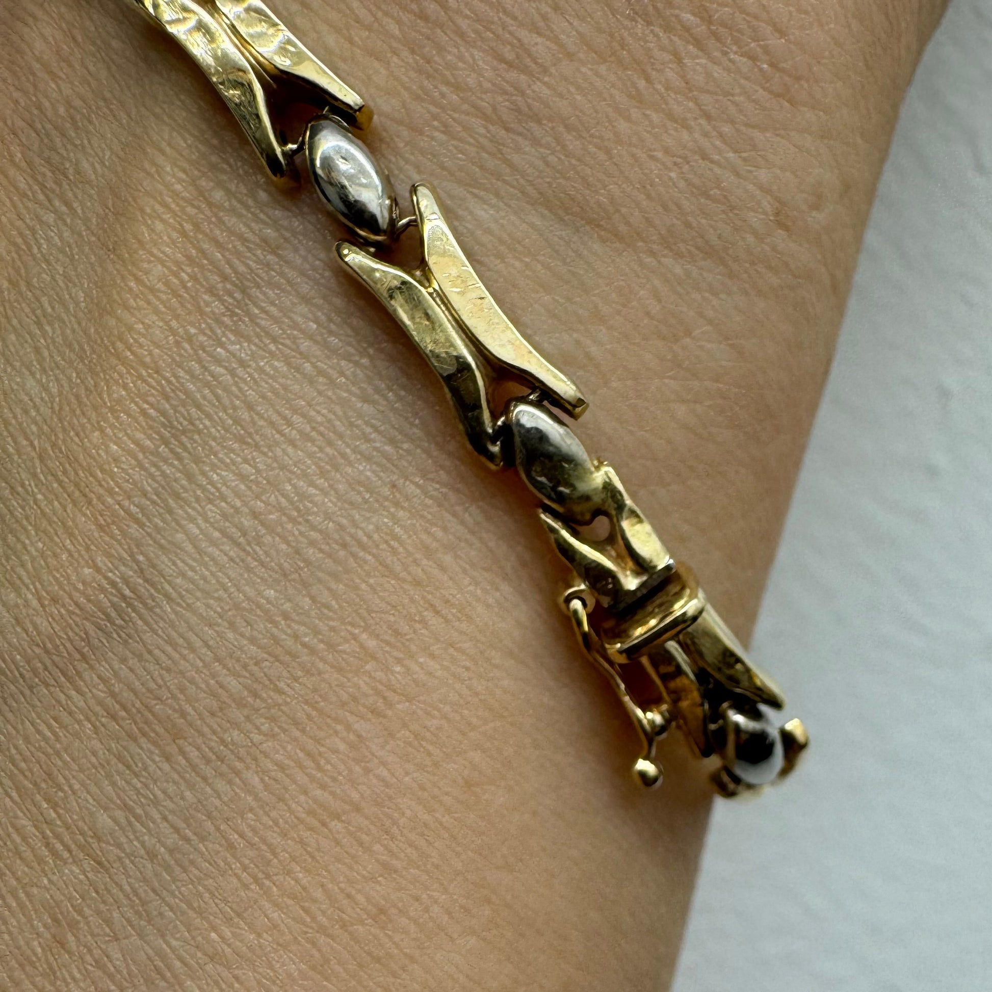 צמיד זהב צהוב וזהב לבן 14 קראט בעיצוב גאומטרי מיוחד, עם חיבורים בצורת X מזהב צהוב ושיבוצים מבריקים בזהב לבן