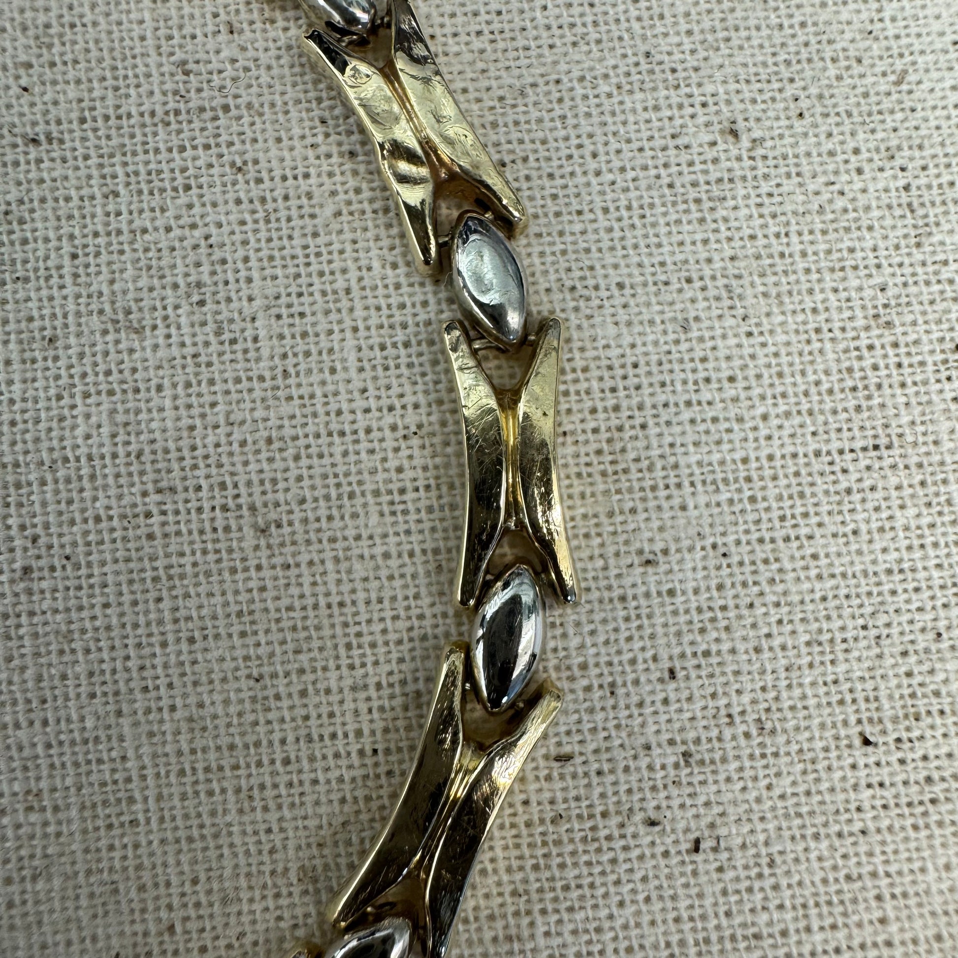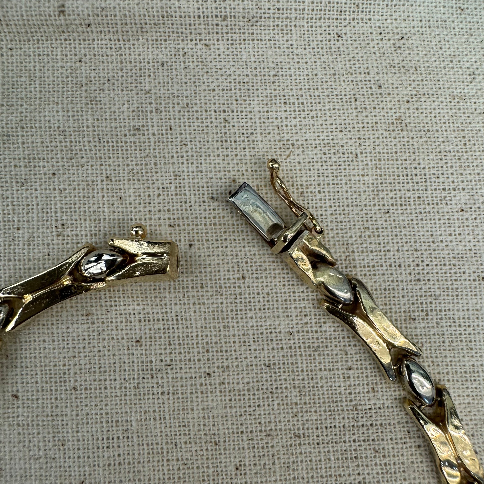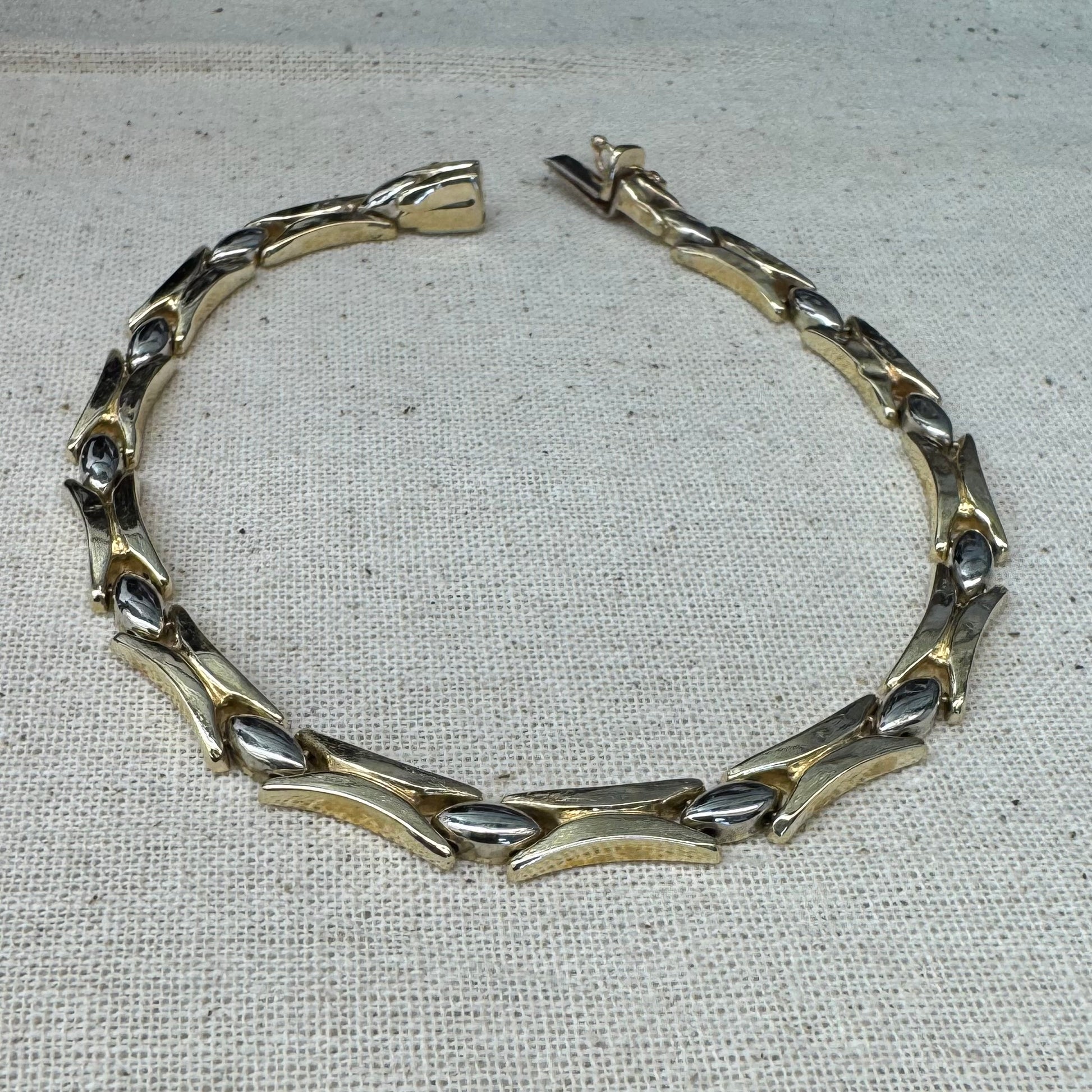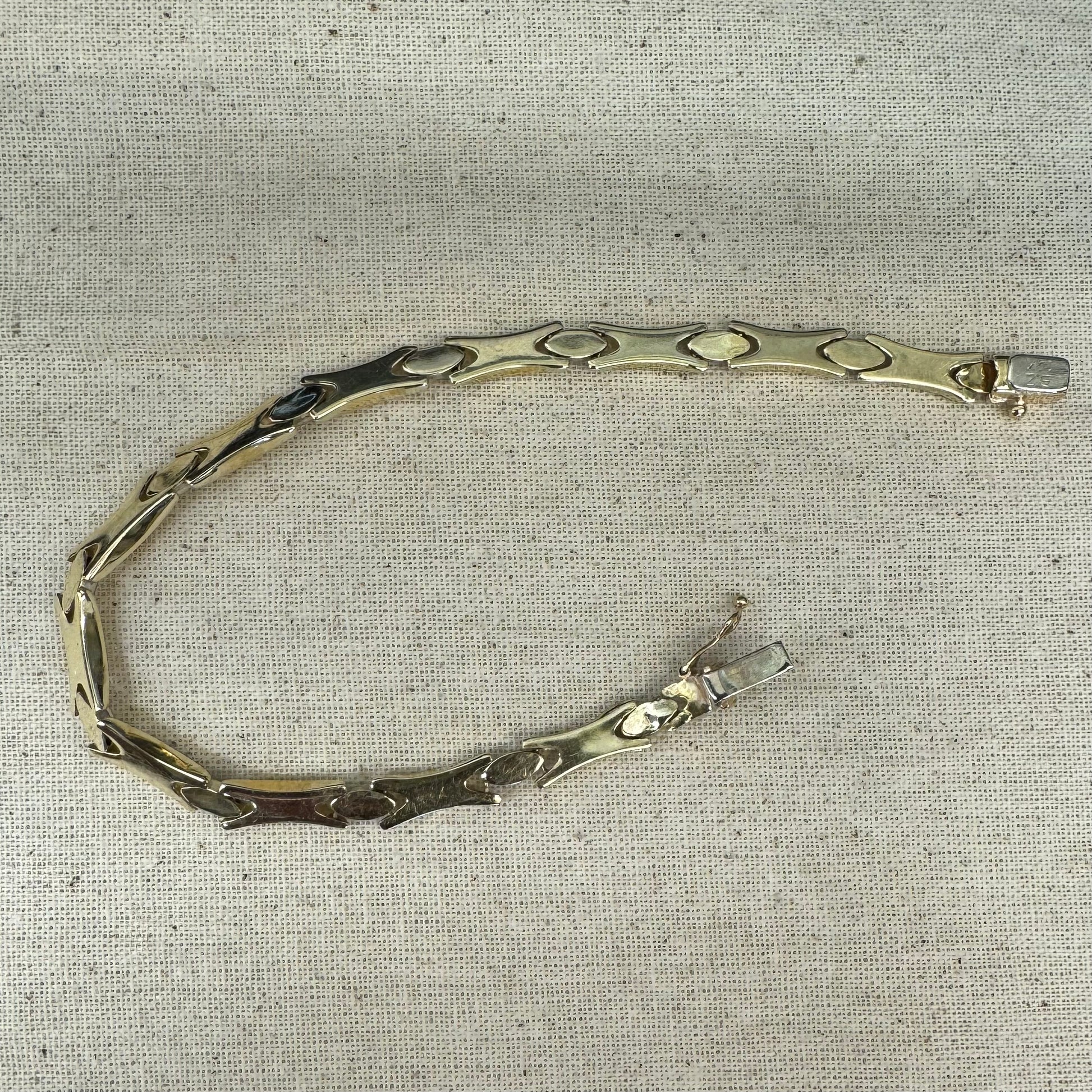 צמיד זהב צהוב וזהב לבן 14 קראט בעיצוב גאומטרי מיוחד, עם חיבורים בצורת X מזהב צהוב ושיבוצים מבריקים בזהב לבן