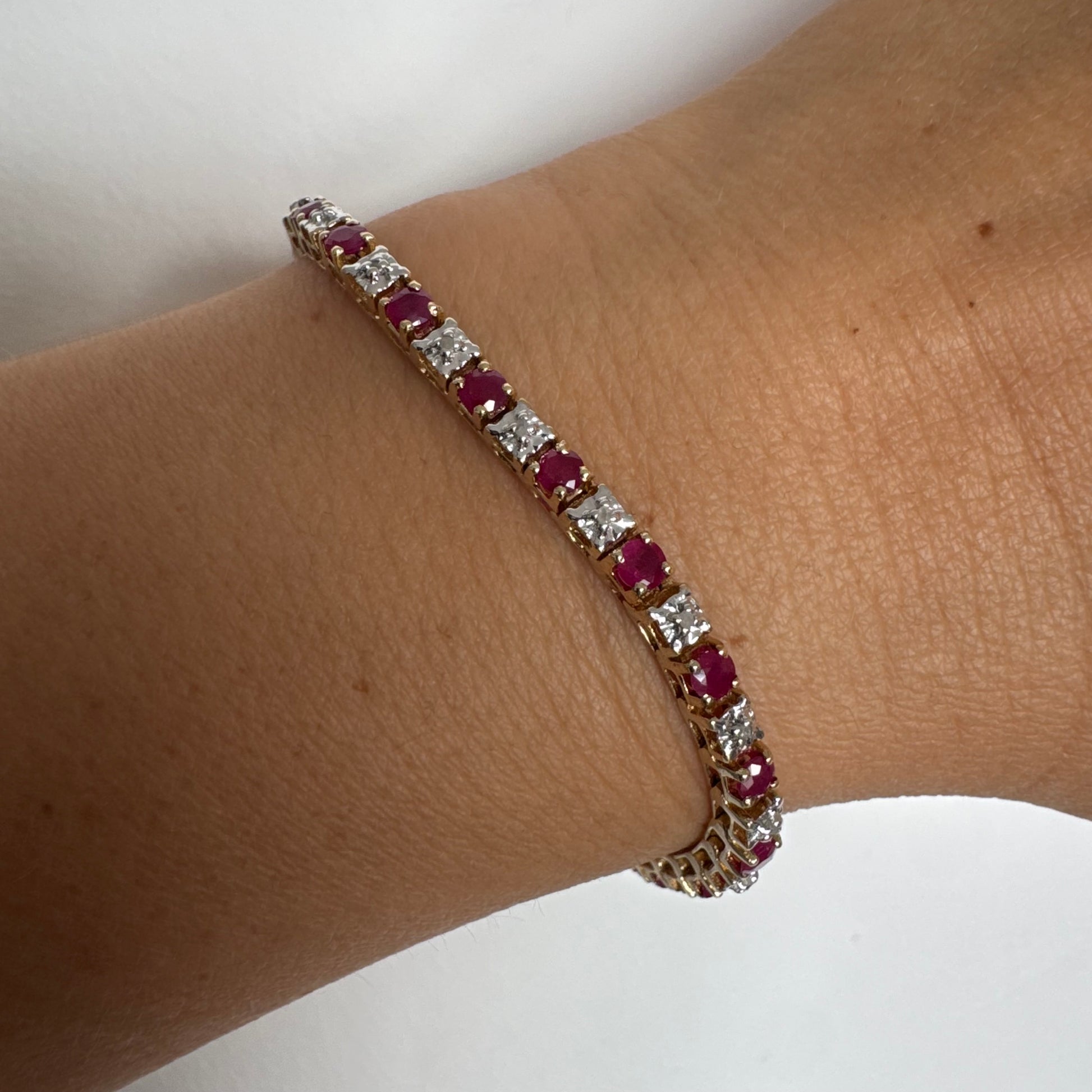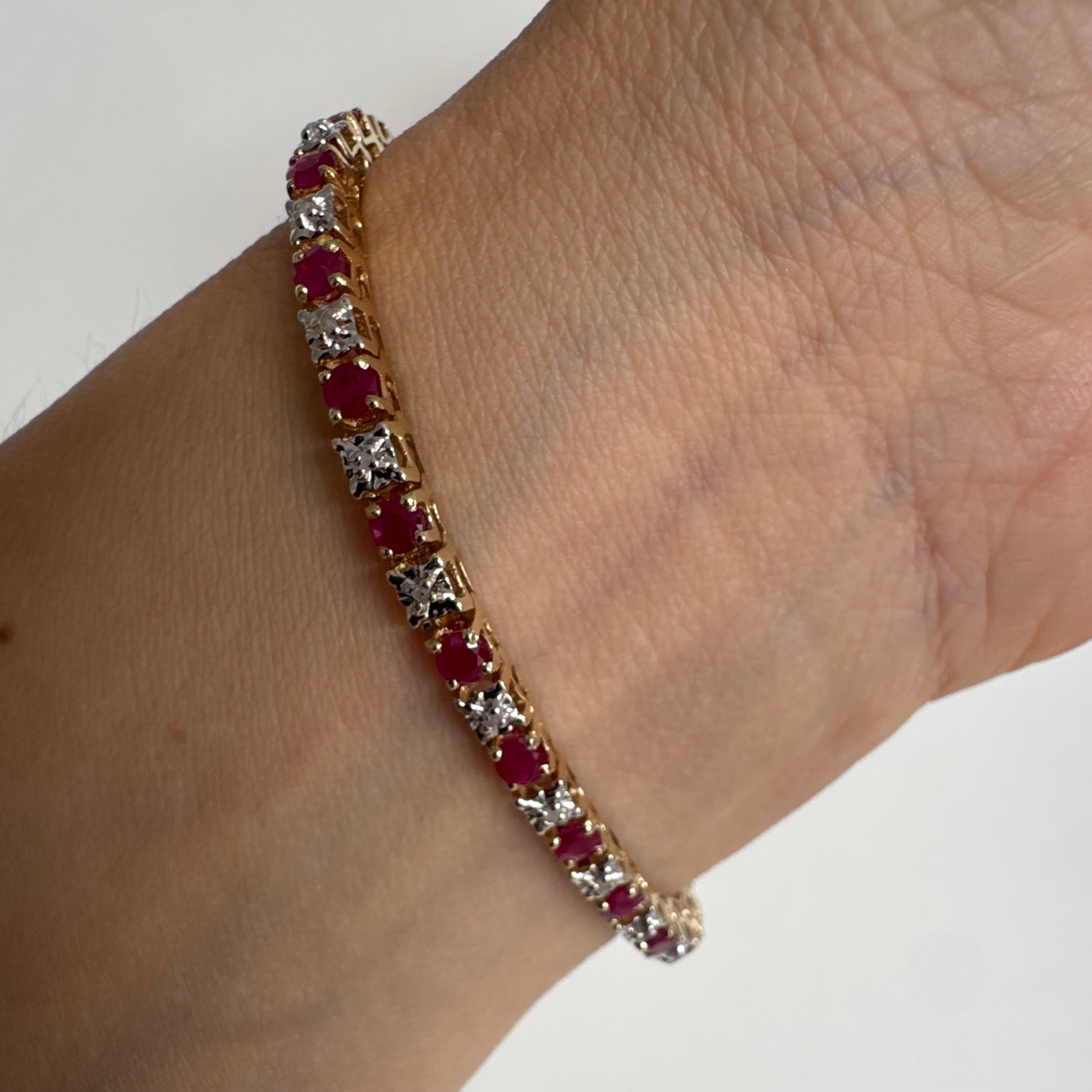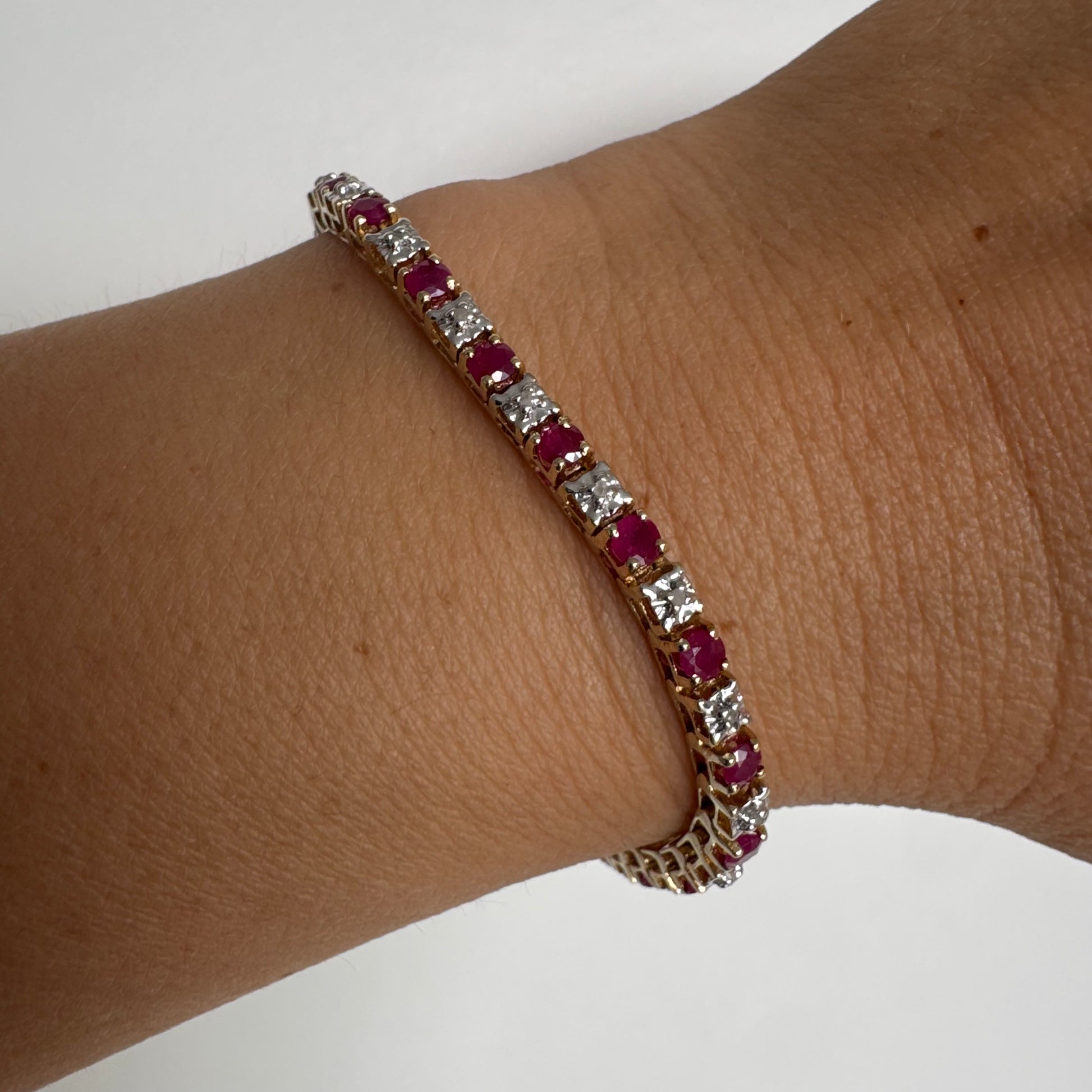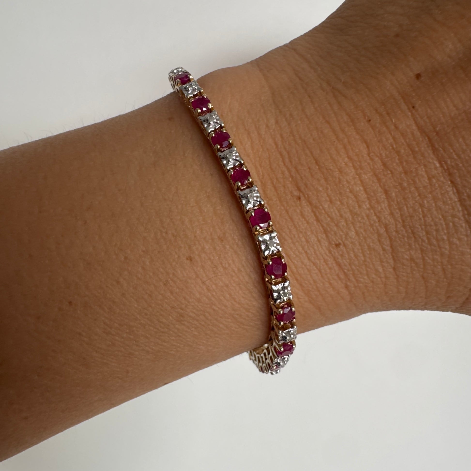 צמיד זהב צהוב 10 קראט משובץ אבני רובי בגוון אדום עמוק וביניהן יהלומים לבנים מנצנצים.