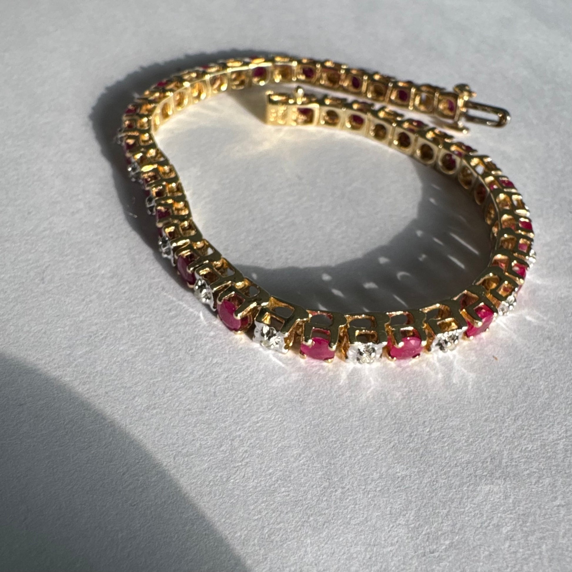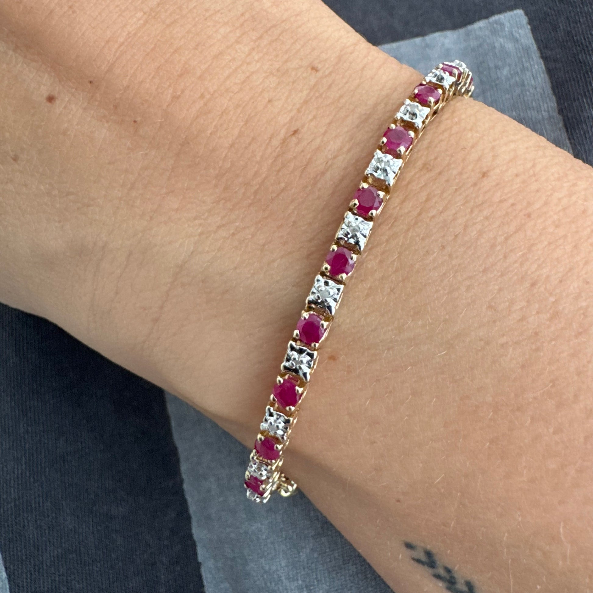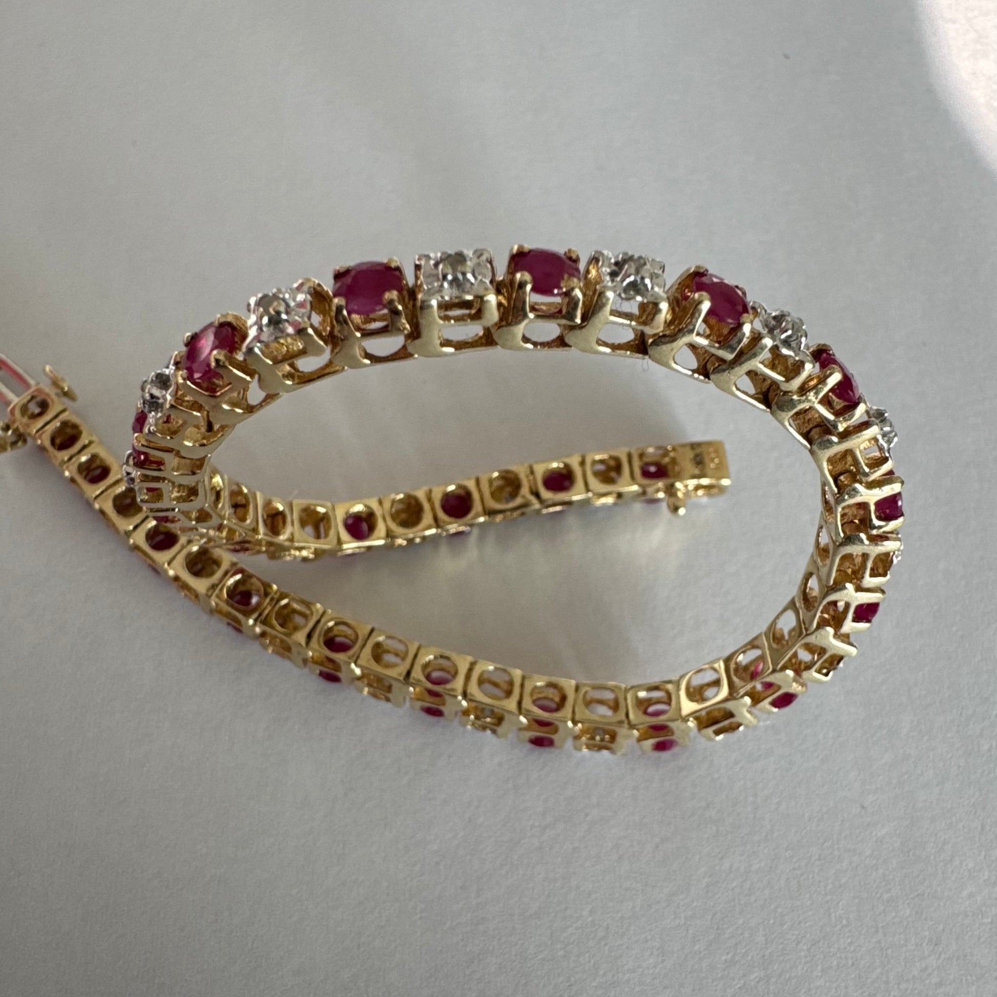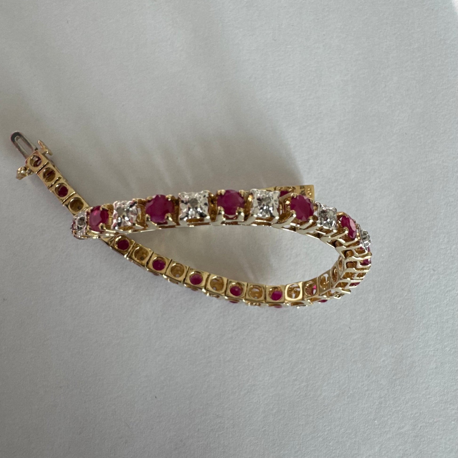 צמיד זהב צהוב 10 קראט משובץ אבני רובי בגוון אדום עמוק וביניהן יהלומים לבנים מנצנצים.
