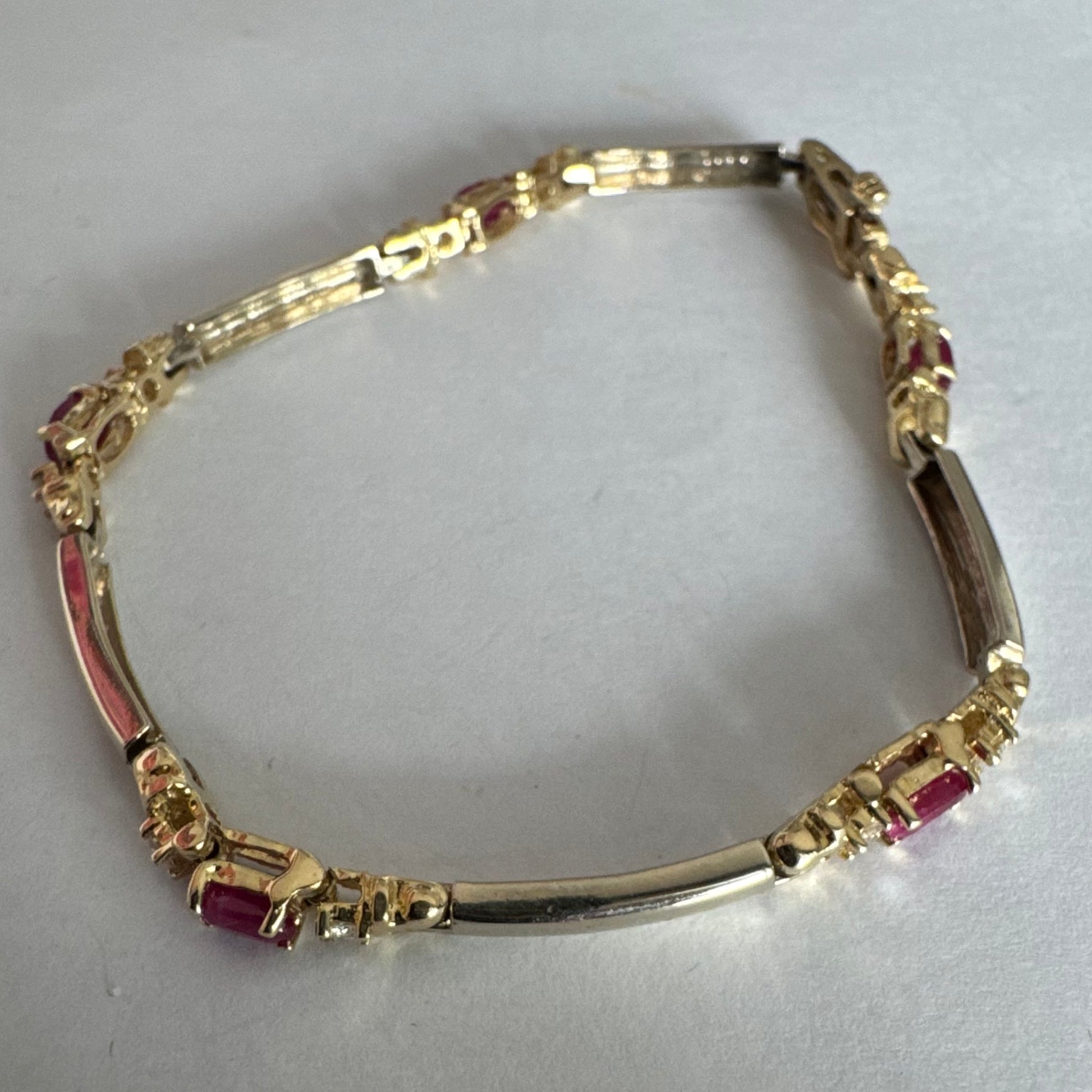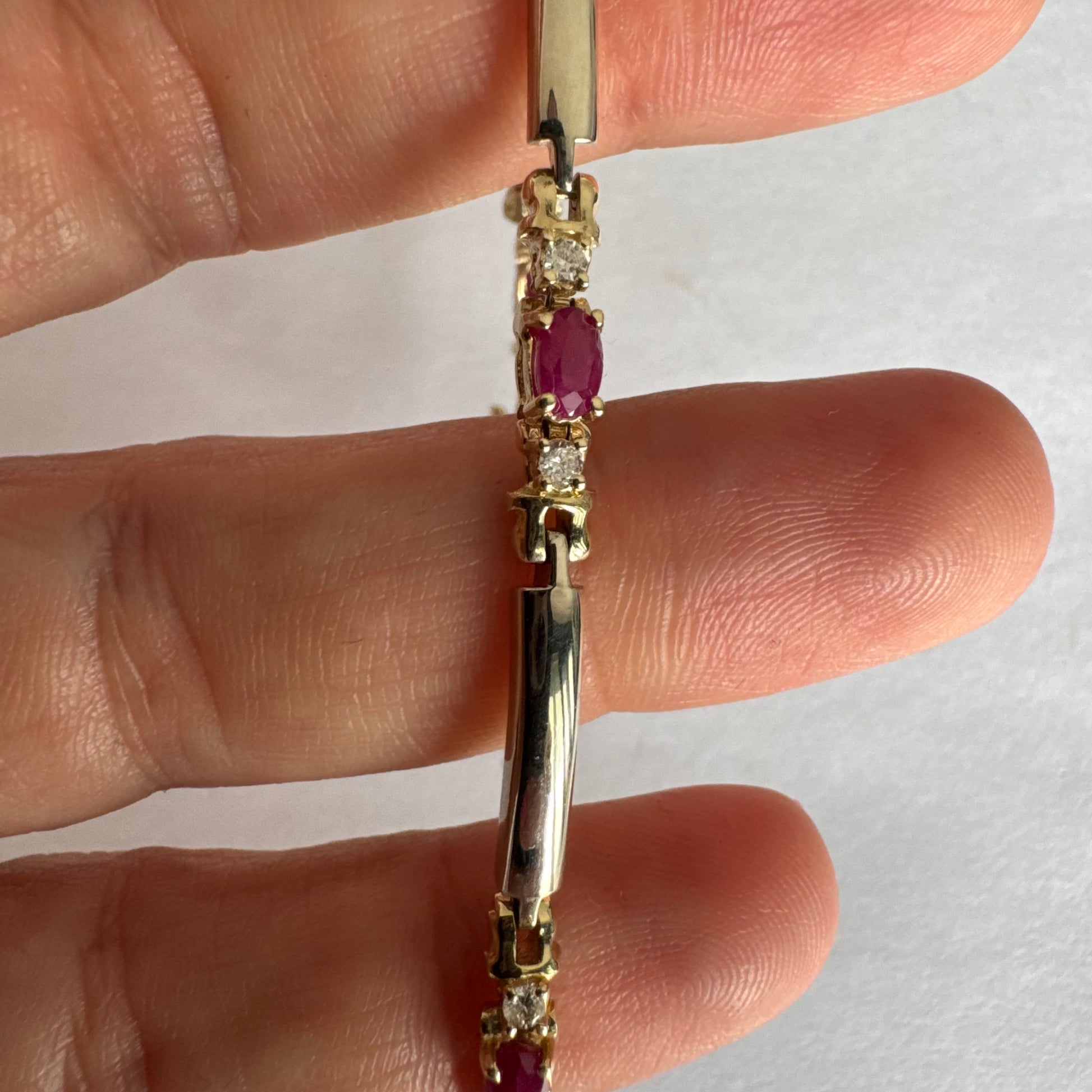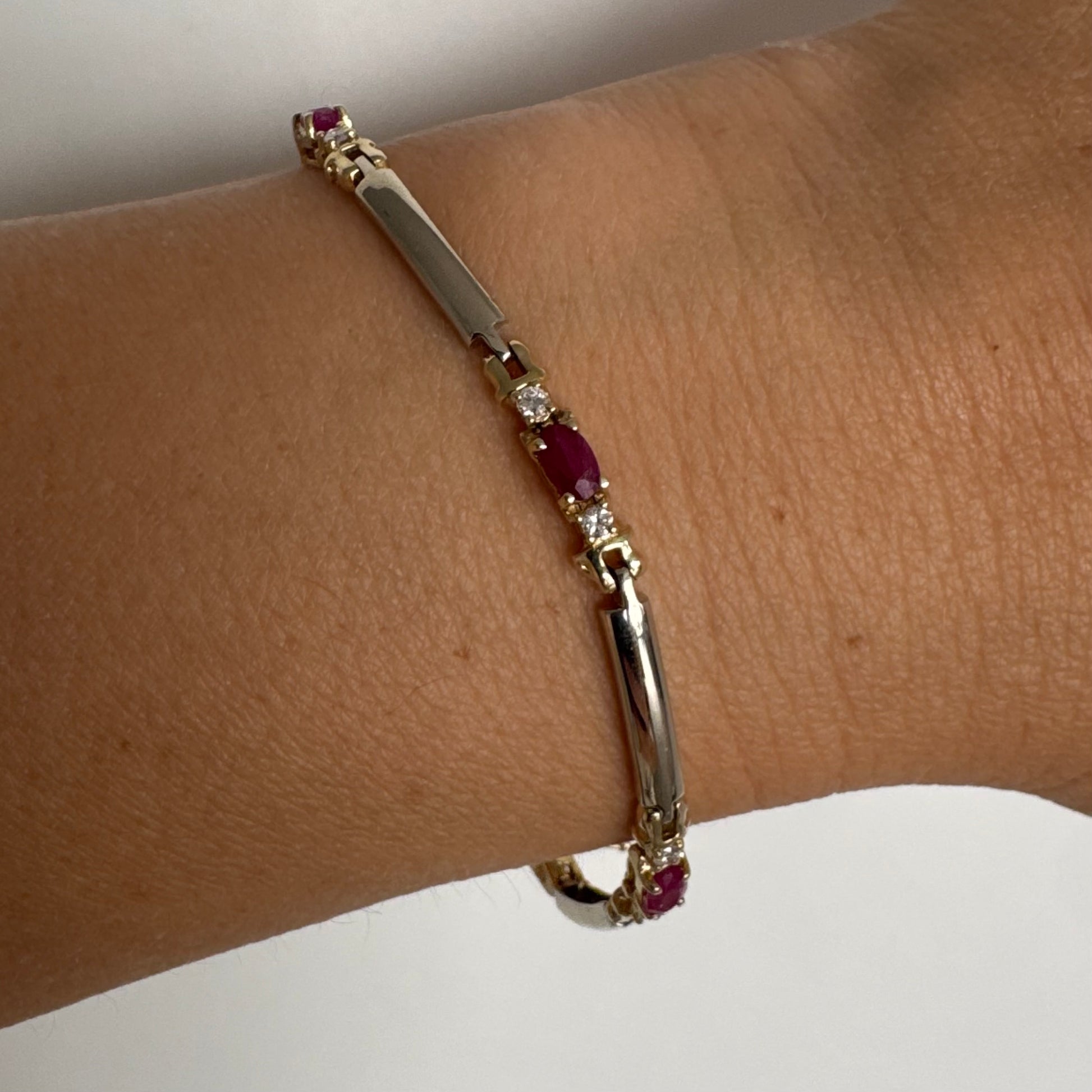 צמיד זהב צהוב 14 קראט משובץ אבני רובי אדומות בחיתוך אובלי, עם יהלומים המשובצים ביניהן להוספת ברק עדין.