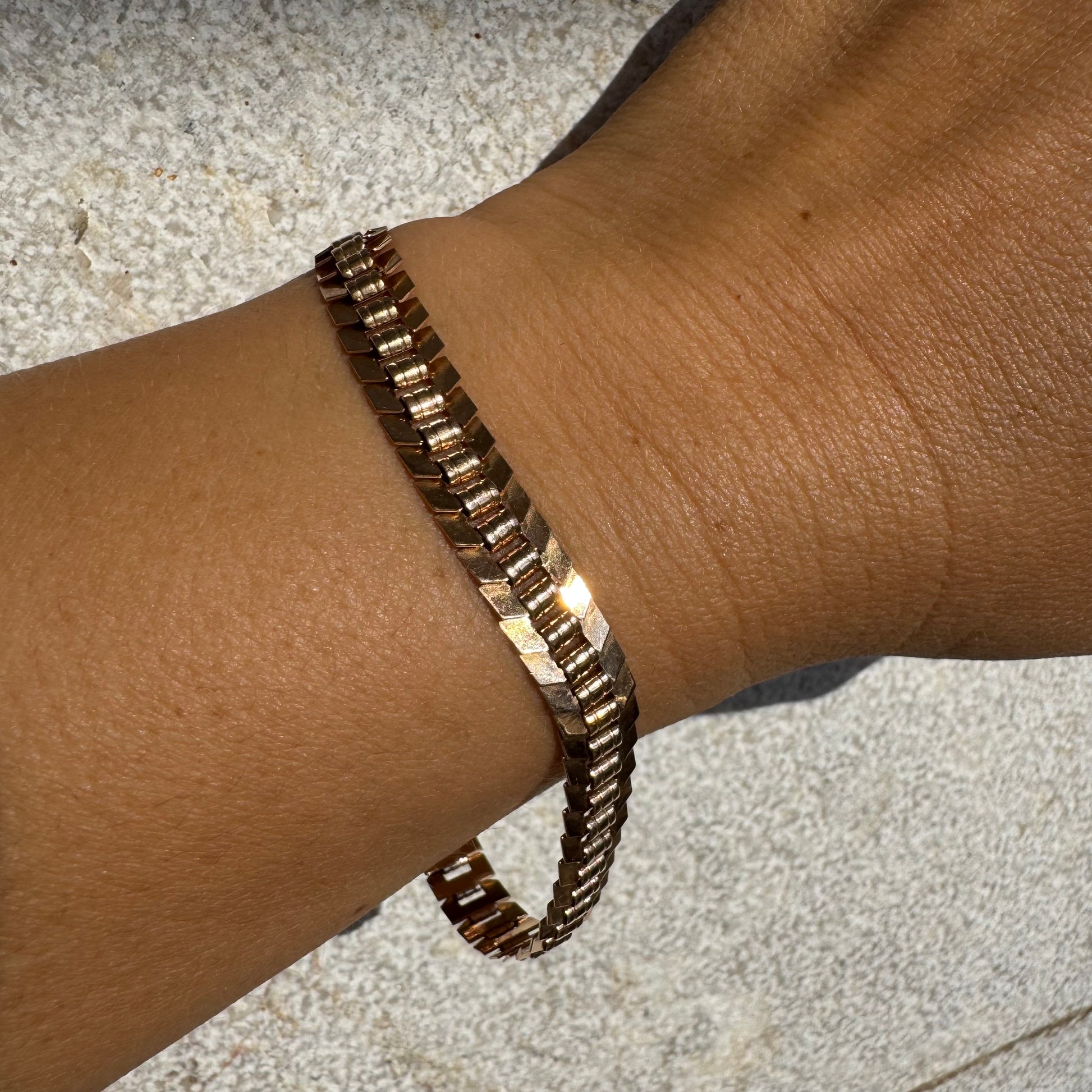 צמיד זהב 14 קראט בעיצוב חוליות גמיש ומרשים, עם סגירת קופסה בטיחותית.
