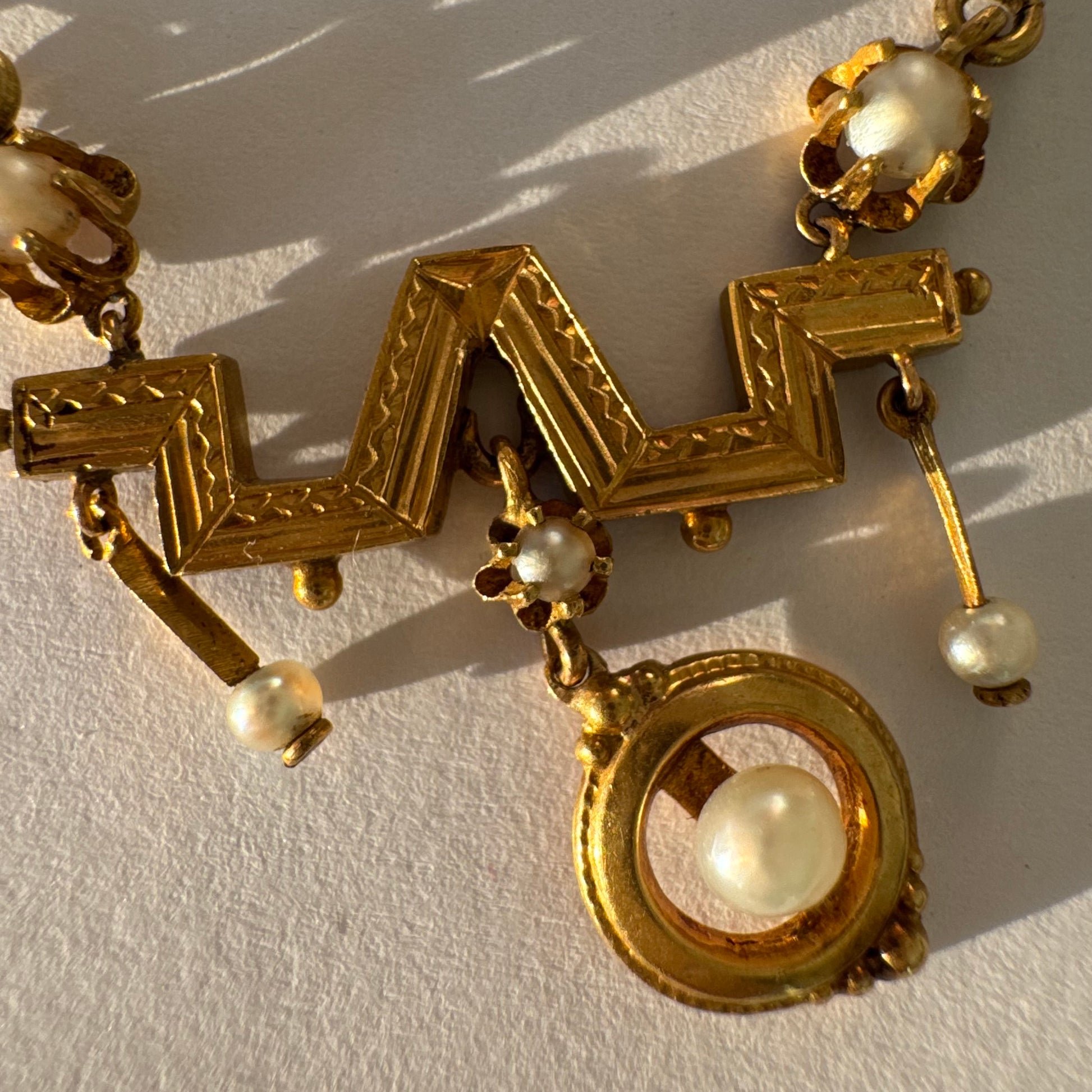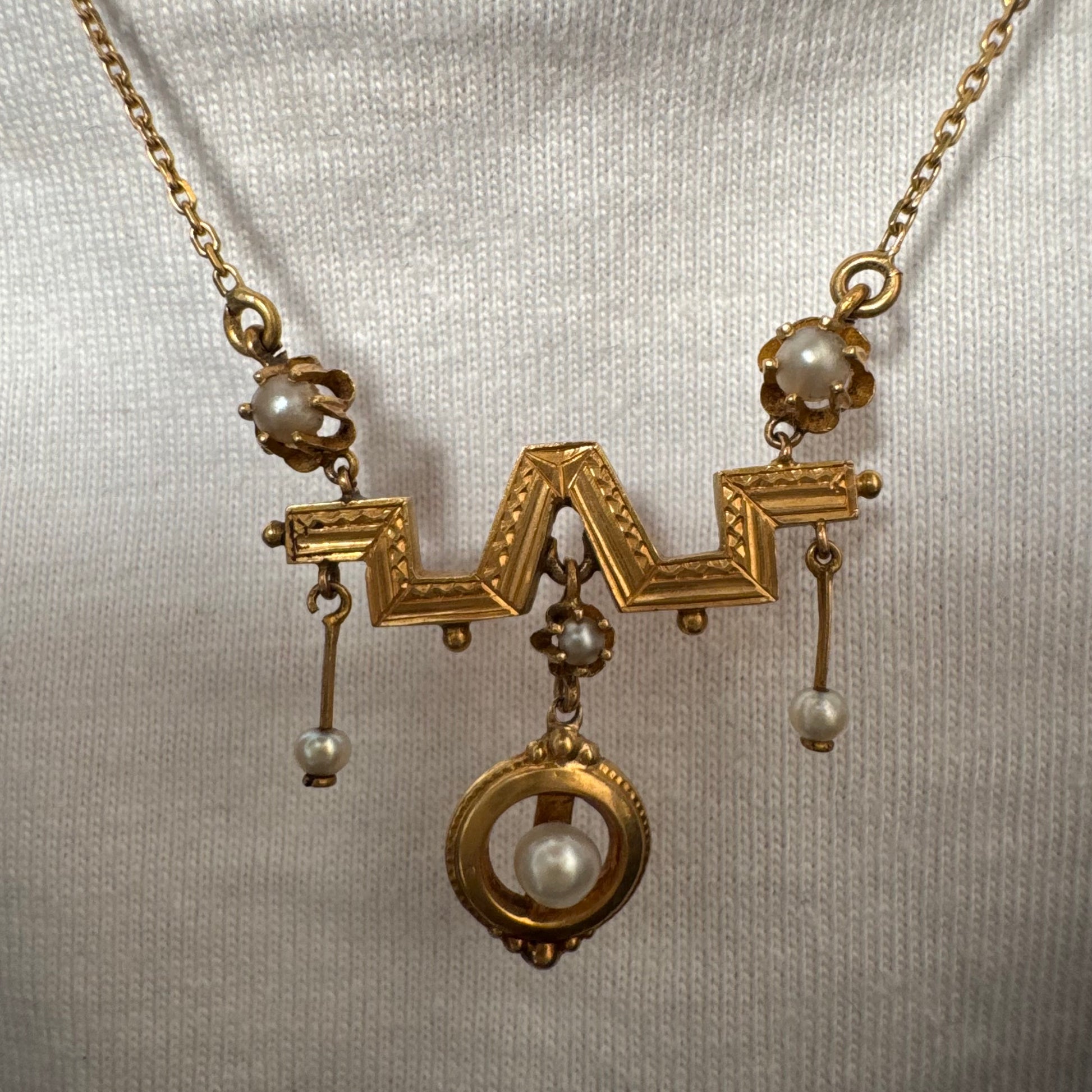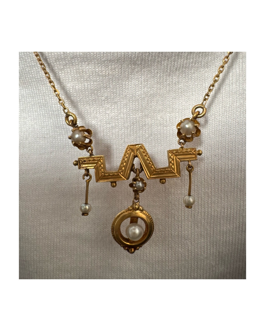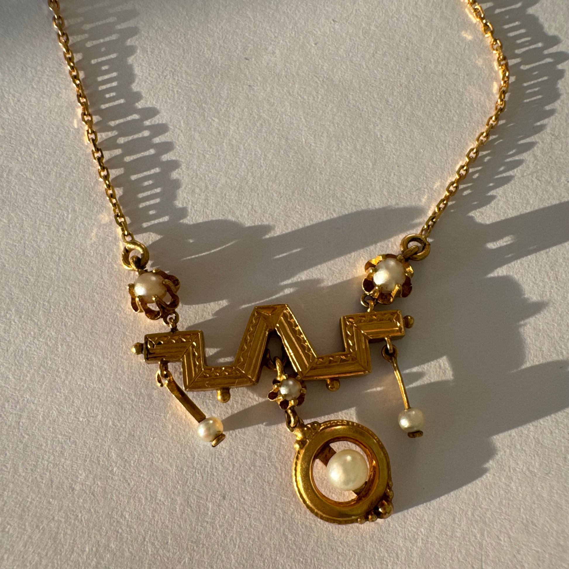 שרשרת זהב צהוב 14 קראט בעיצוב ייחודי, משובצת פנינים עדינות. פריט מלא אופי ונוכחות עם עבודת זהב מרהיבה ואלמנטים תלויים שמוסיפים תנועה וקסם