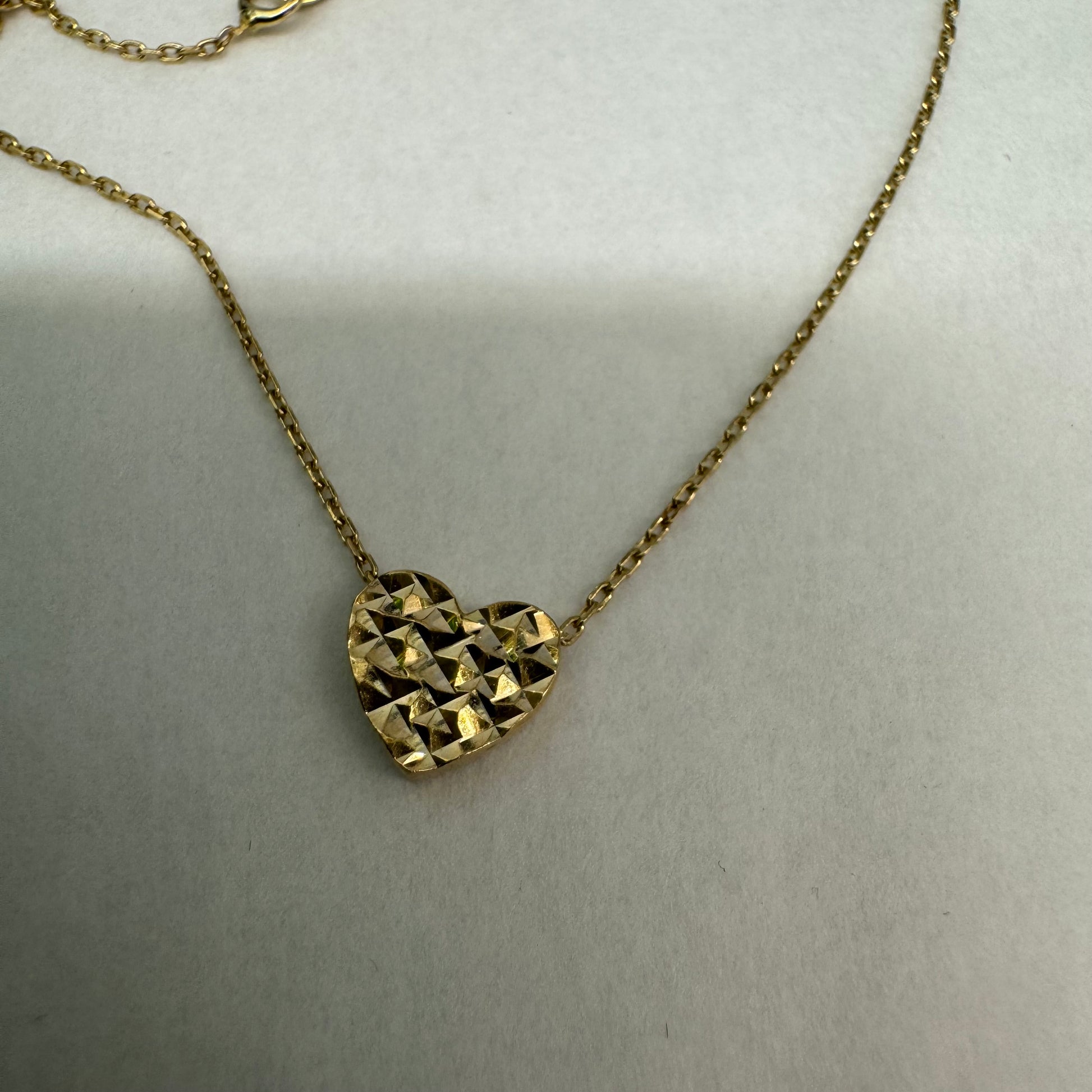 שרשרת זהב 14 קראט עם תליון לב מעוצב במרקם גאומטרי עדין.