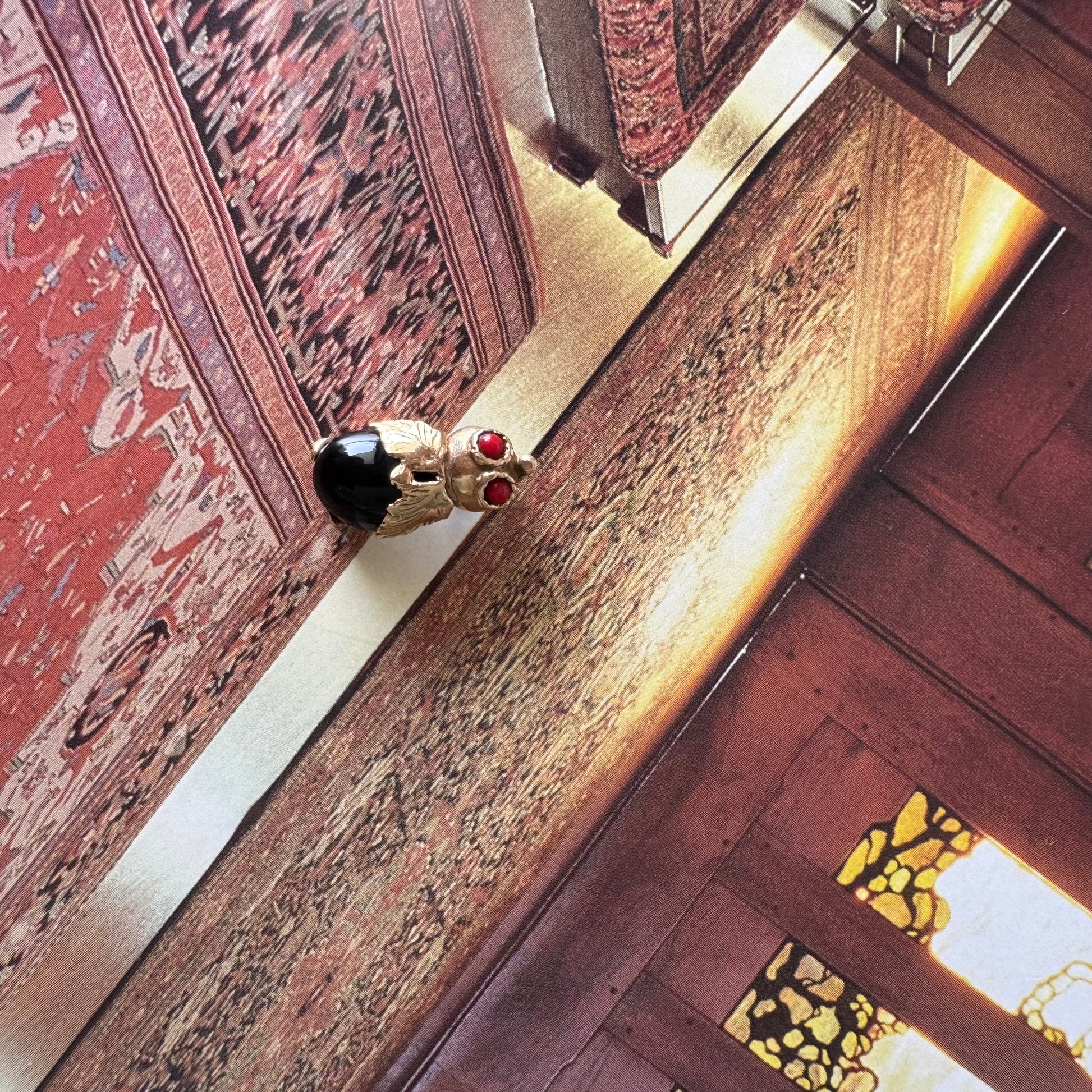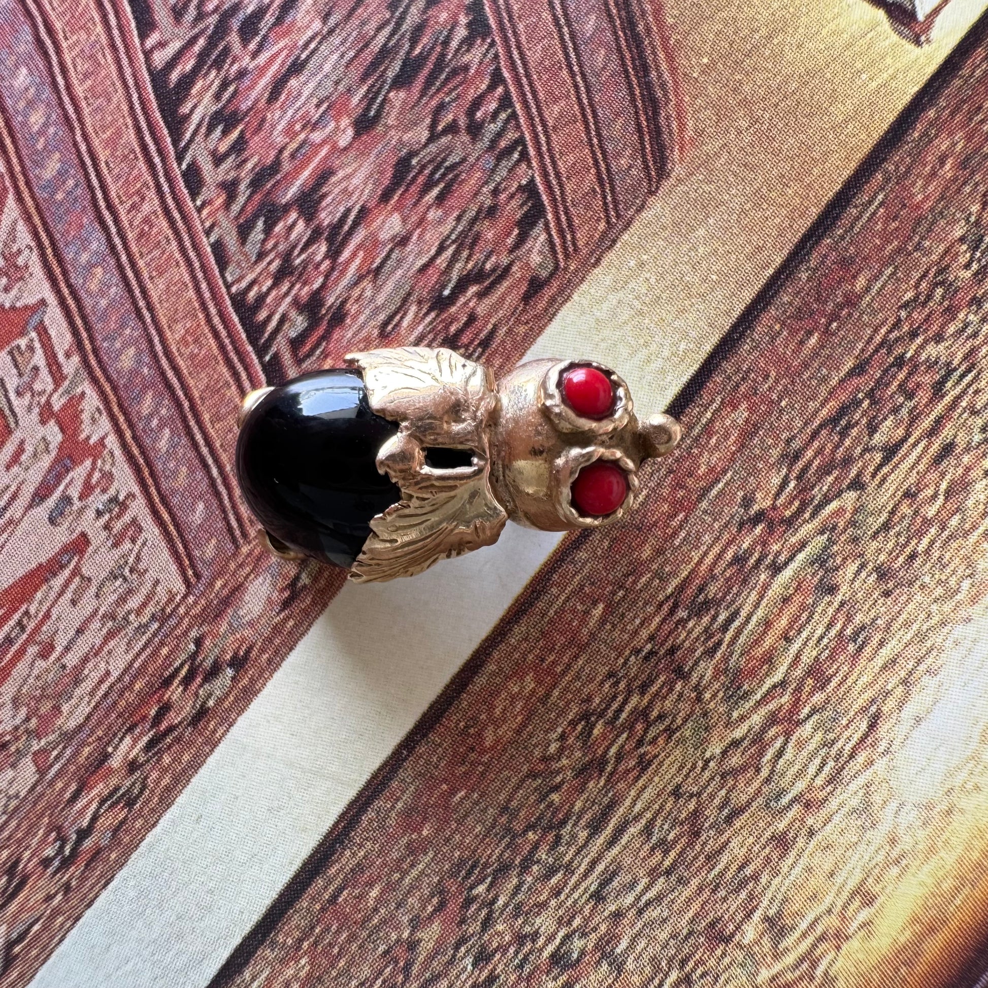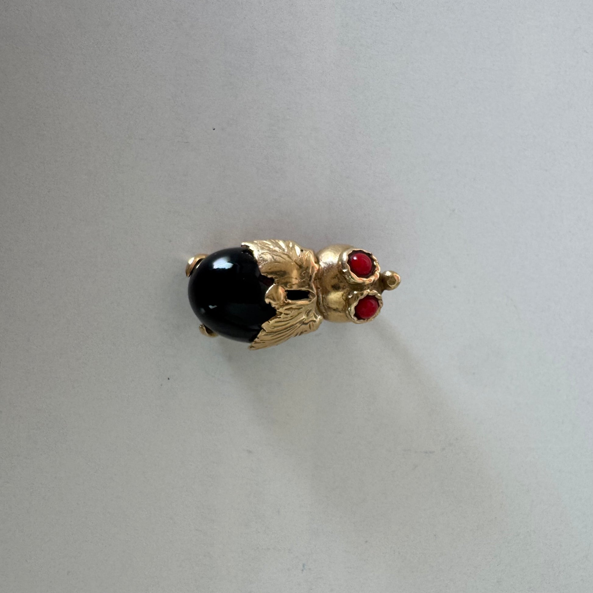 תליון בצורת חיפושית מזהב 14 קראט, עם עיניים אדומות מאבן קורל בחיתוך קבושון וגוף מאבן אוניקס שחורה מבריקה.