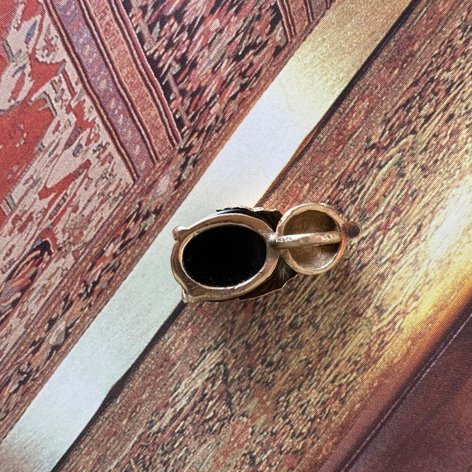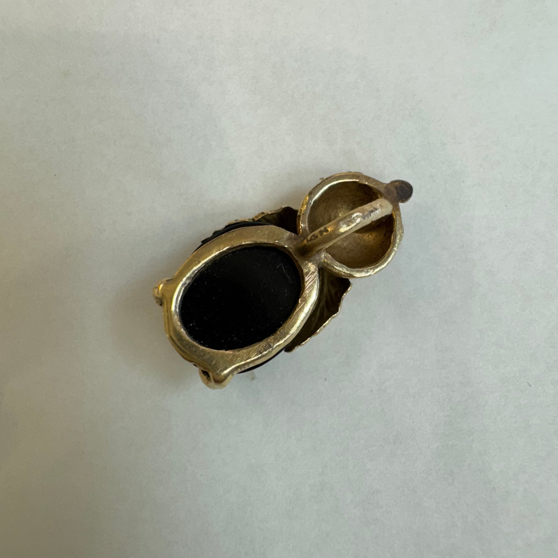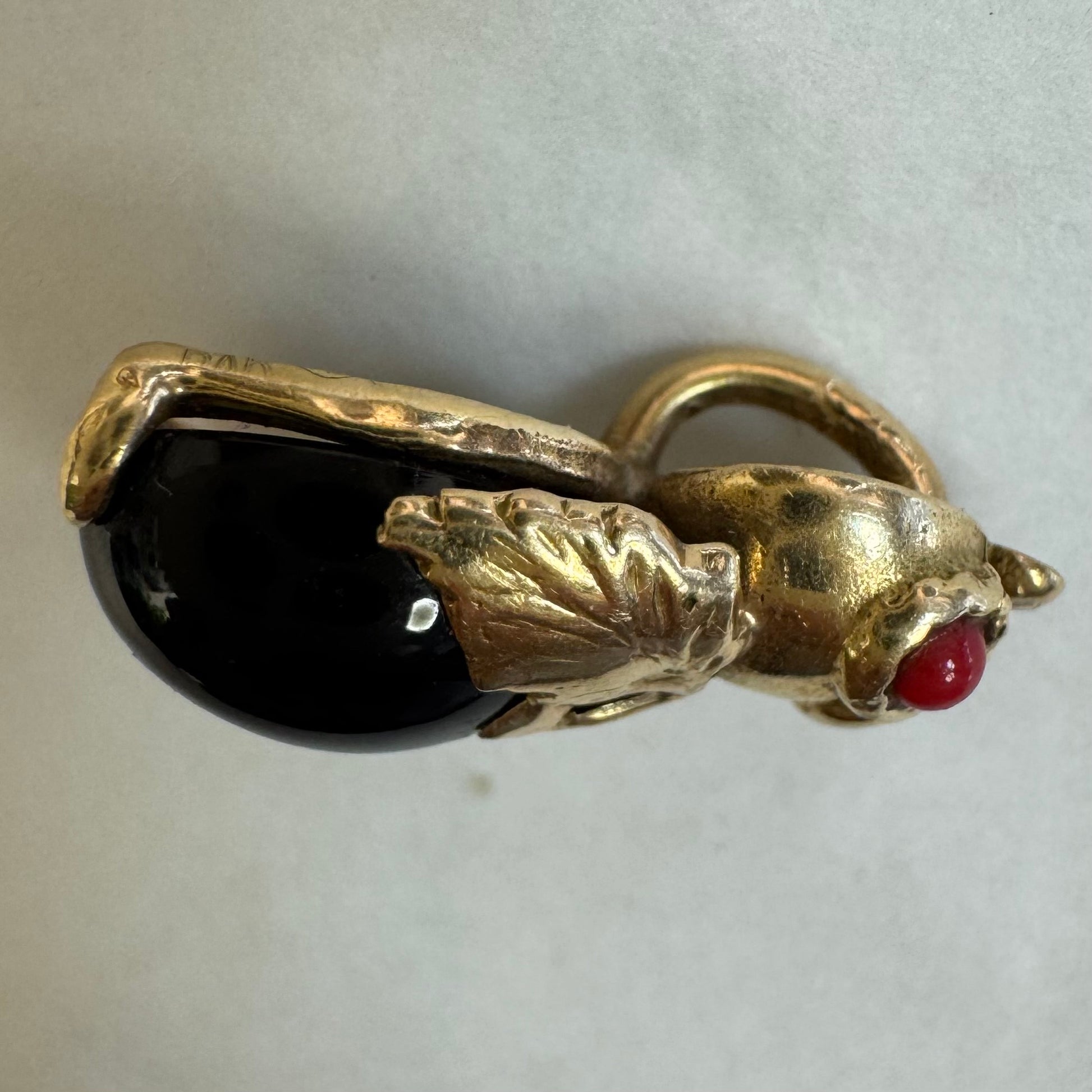 תליון בצורת חיפושית מזהב 14 קראט, עם עיניים אדומות מאבן קורל בחיתוך קבושון וגוף מאבן אוניקס שחורה מבריקה.