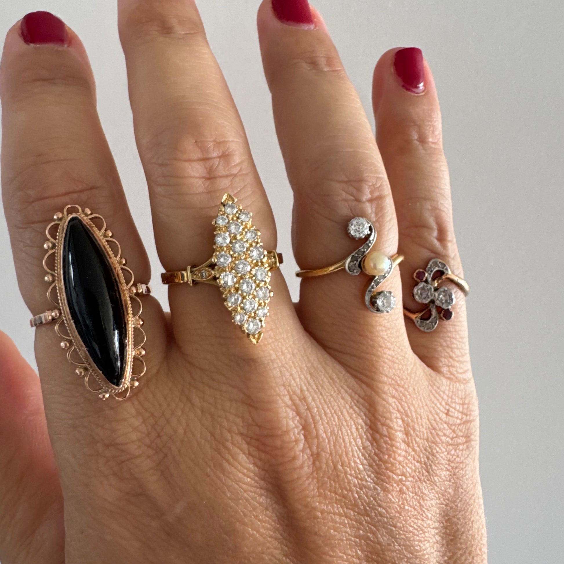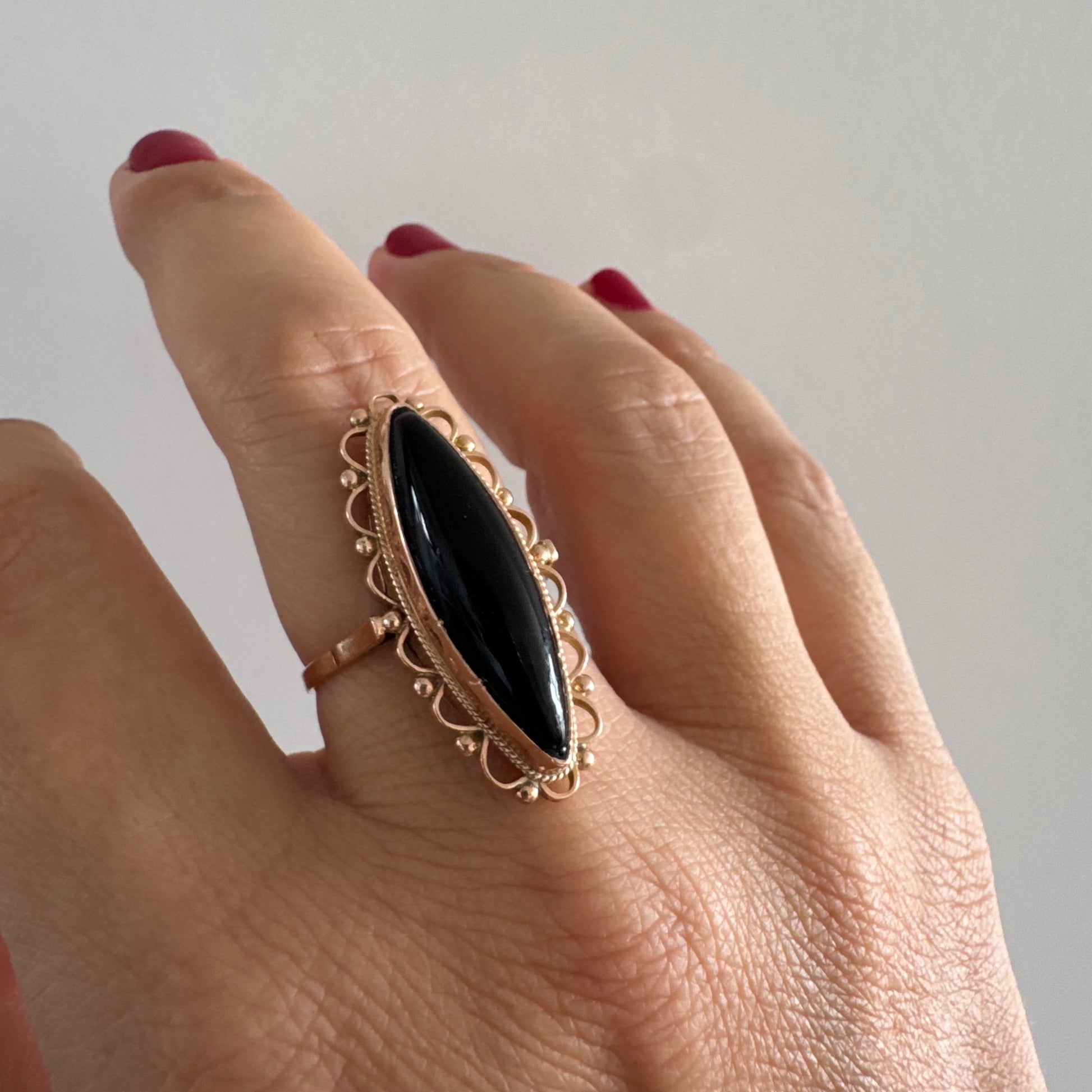 טבעת זהב אדום 14 קראט משובצת אבן אוניקס שחורה בחיתוך מרקיזה עם מבנה מאורך