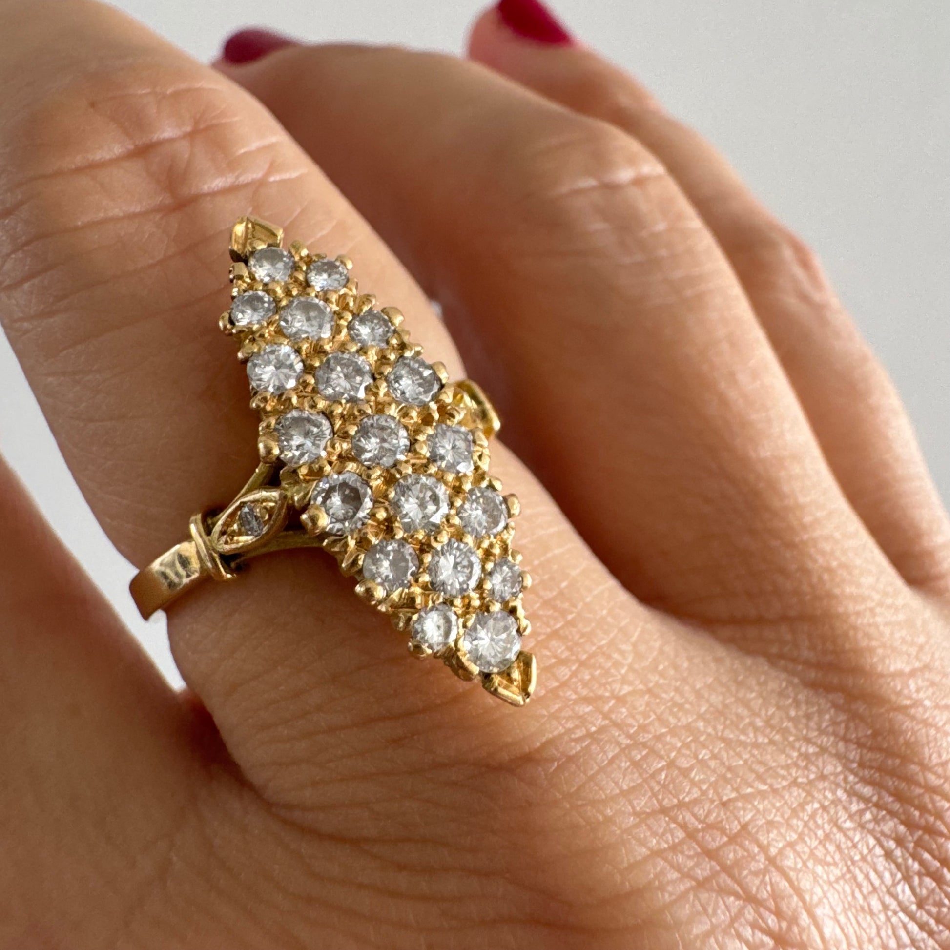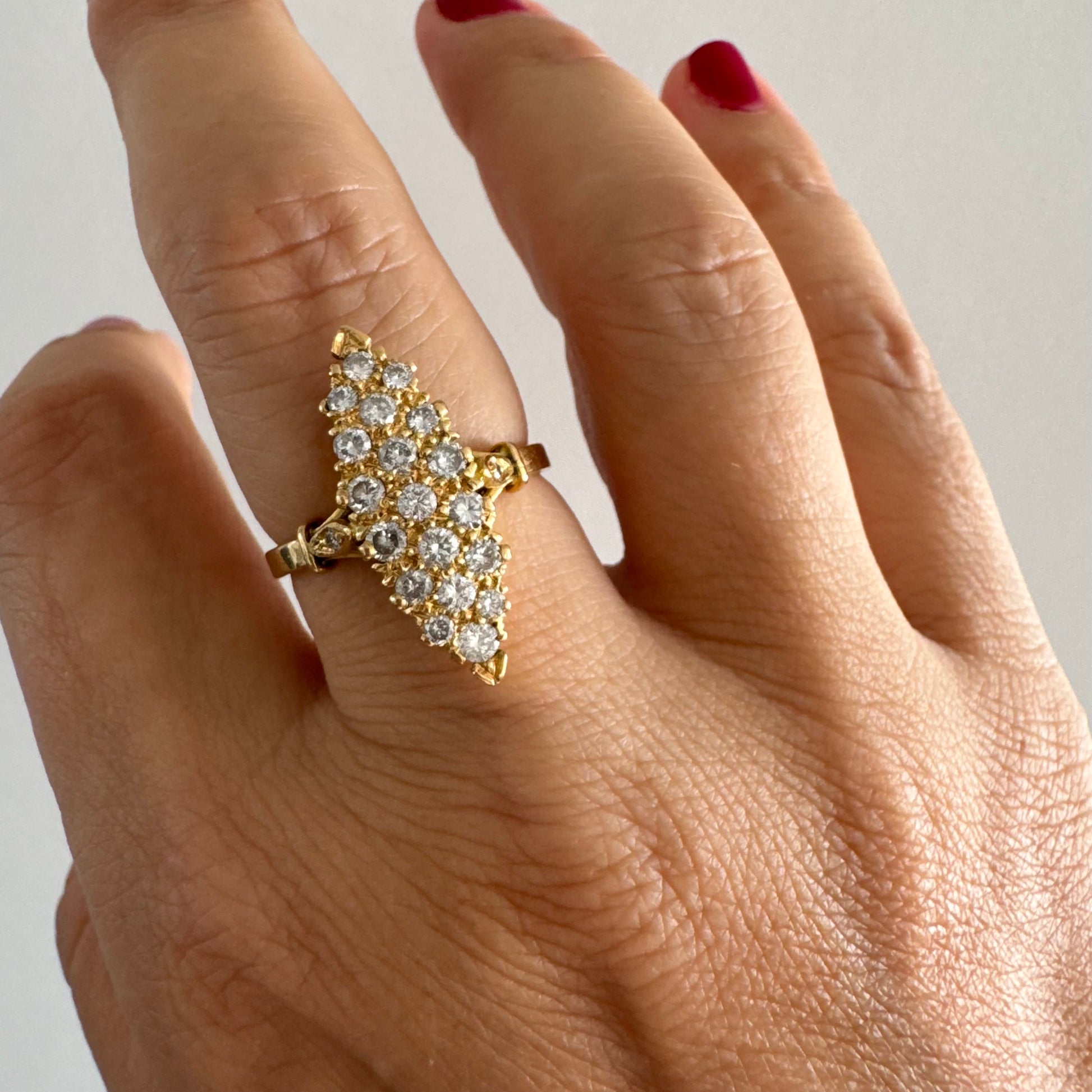 טבעת זהב צהוב 18 קראט בצורת מרקיזה משובצת יהלומים נוצצים