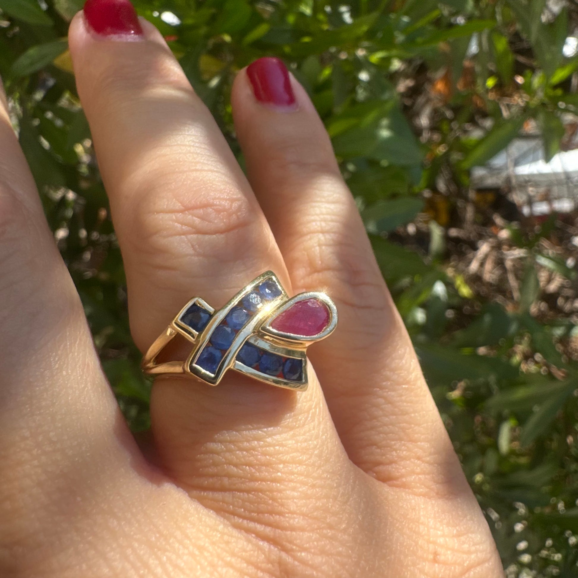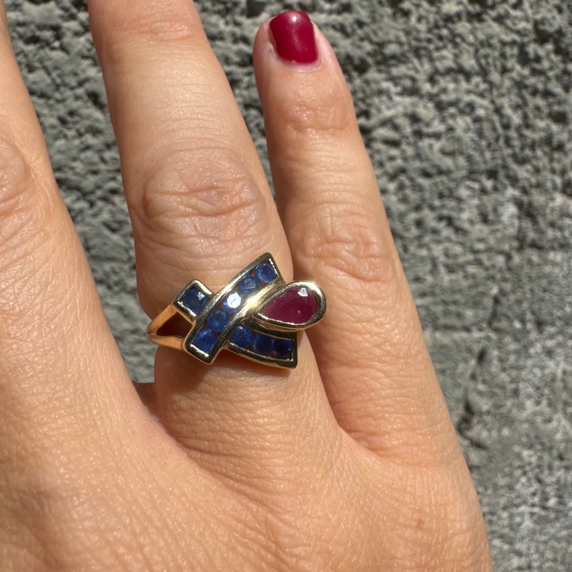 10K gold ring set with a pear-shaped Ruby and deep blue Sapphires in a geometric design.