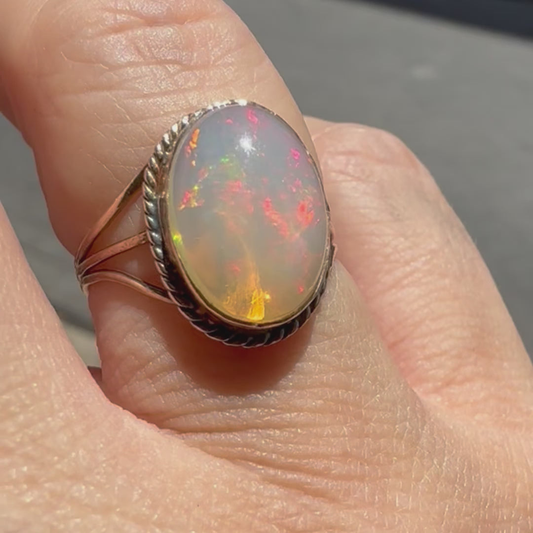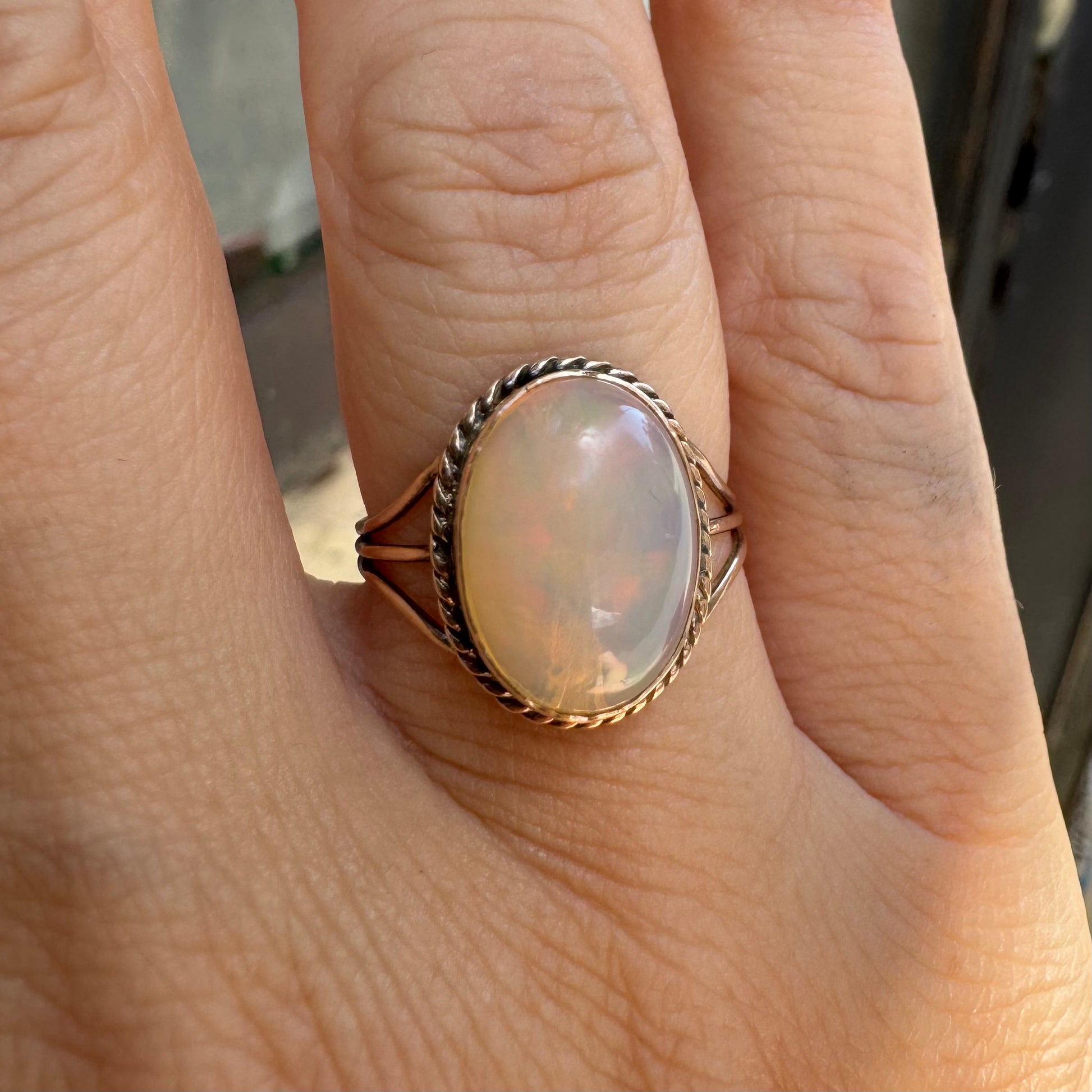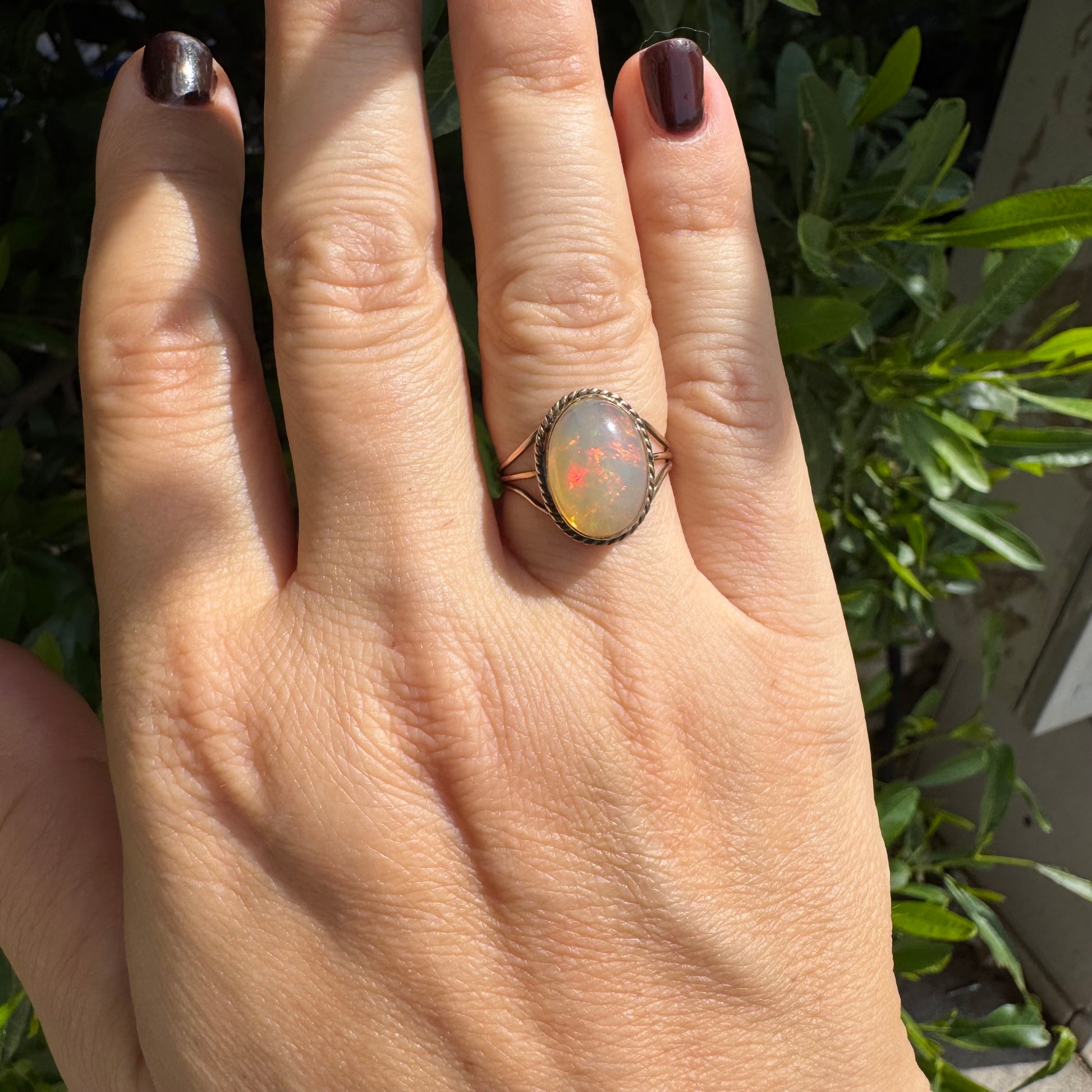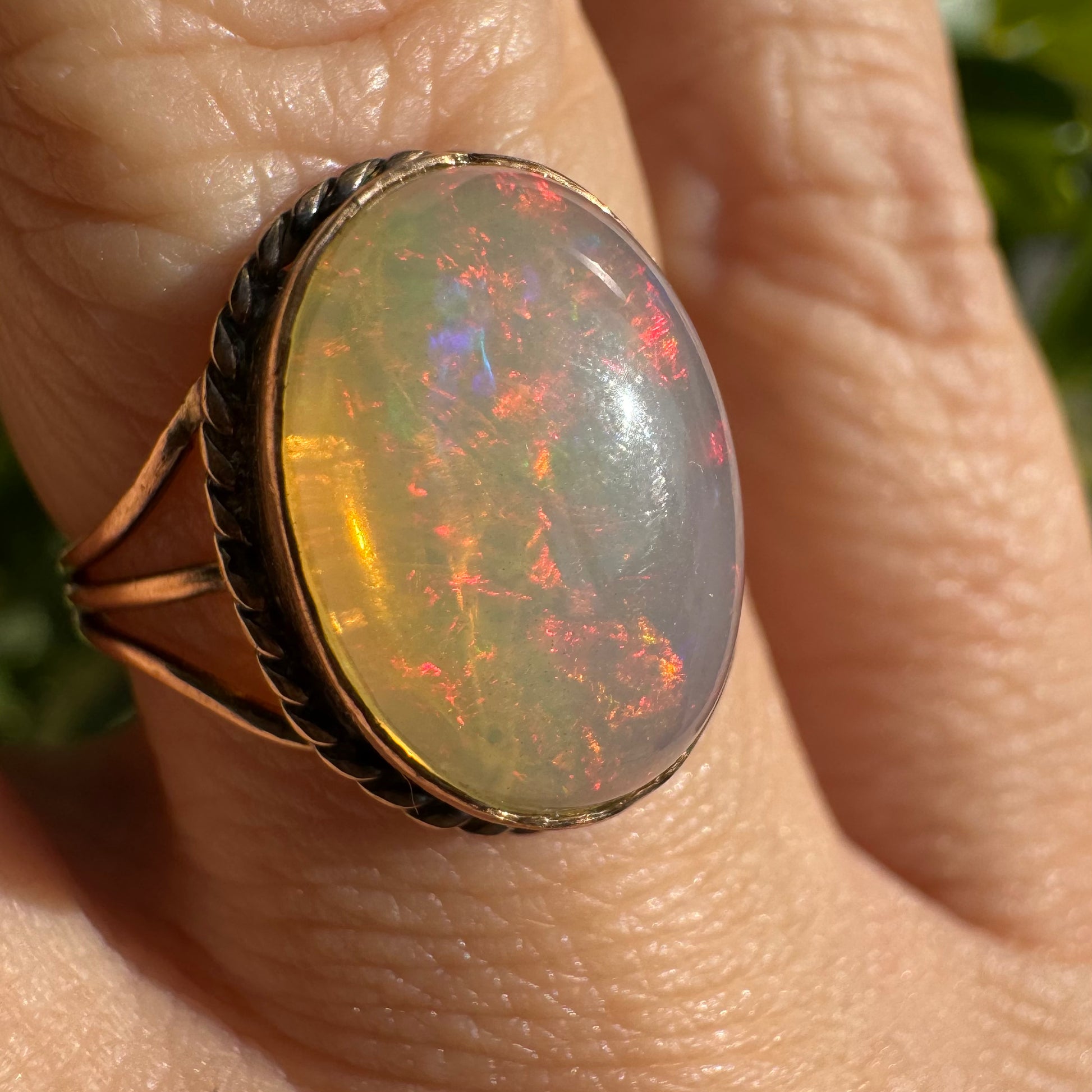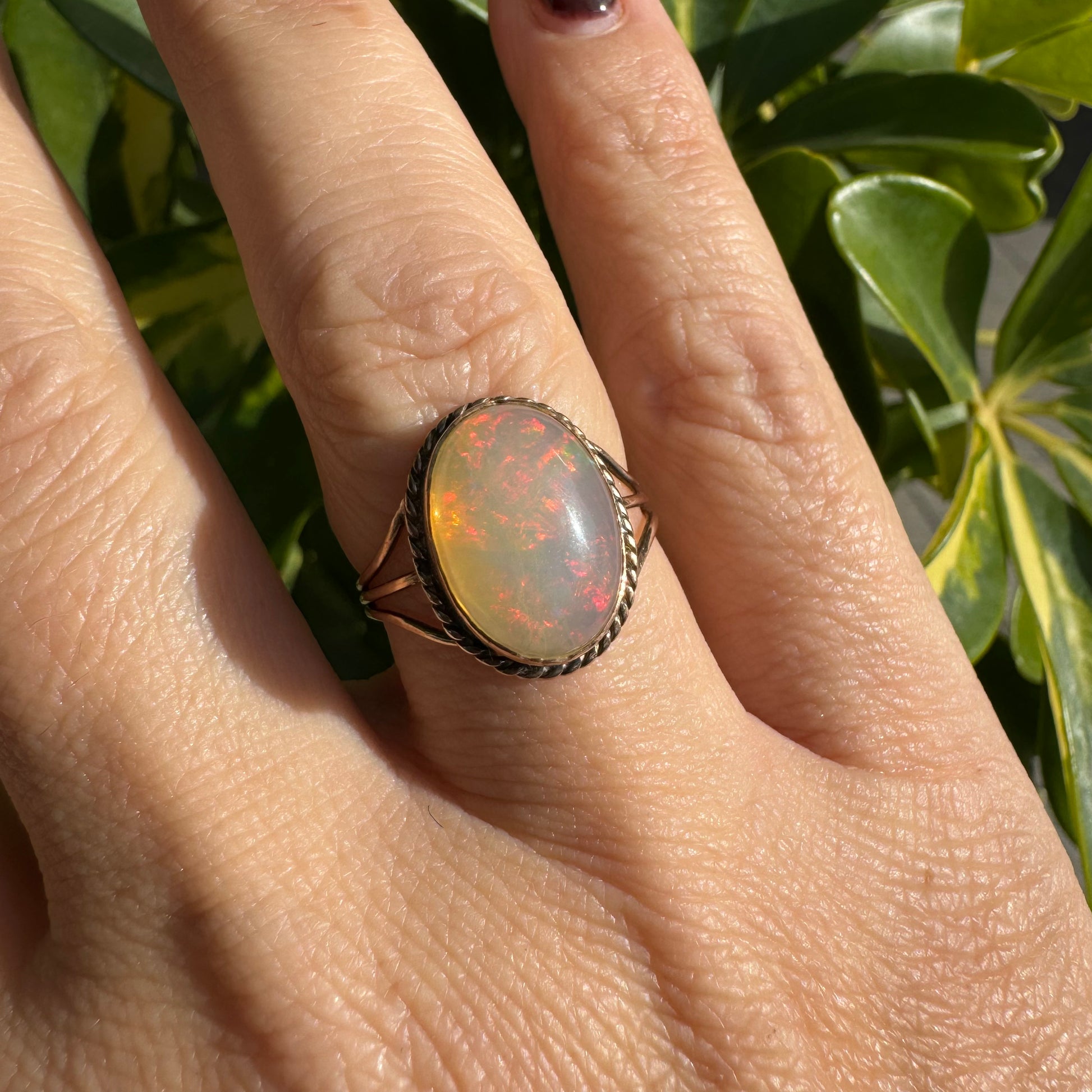 טבעת זהב אדום 10 קראט משובצת אבן אופל בעל תכלילים צבעוניים