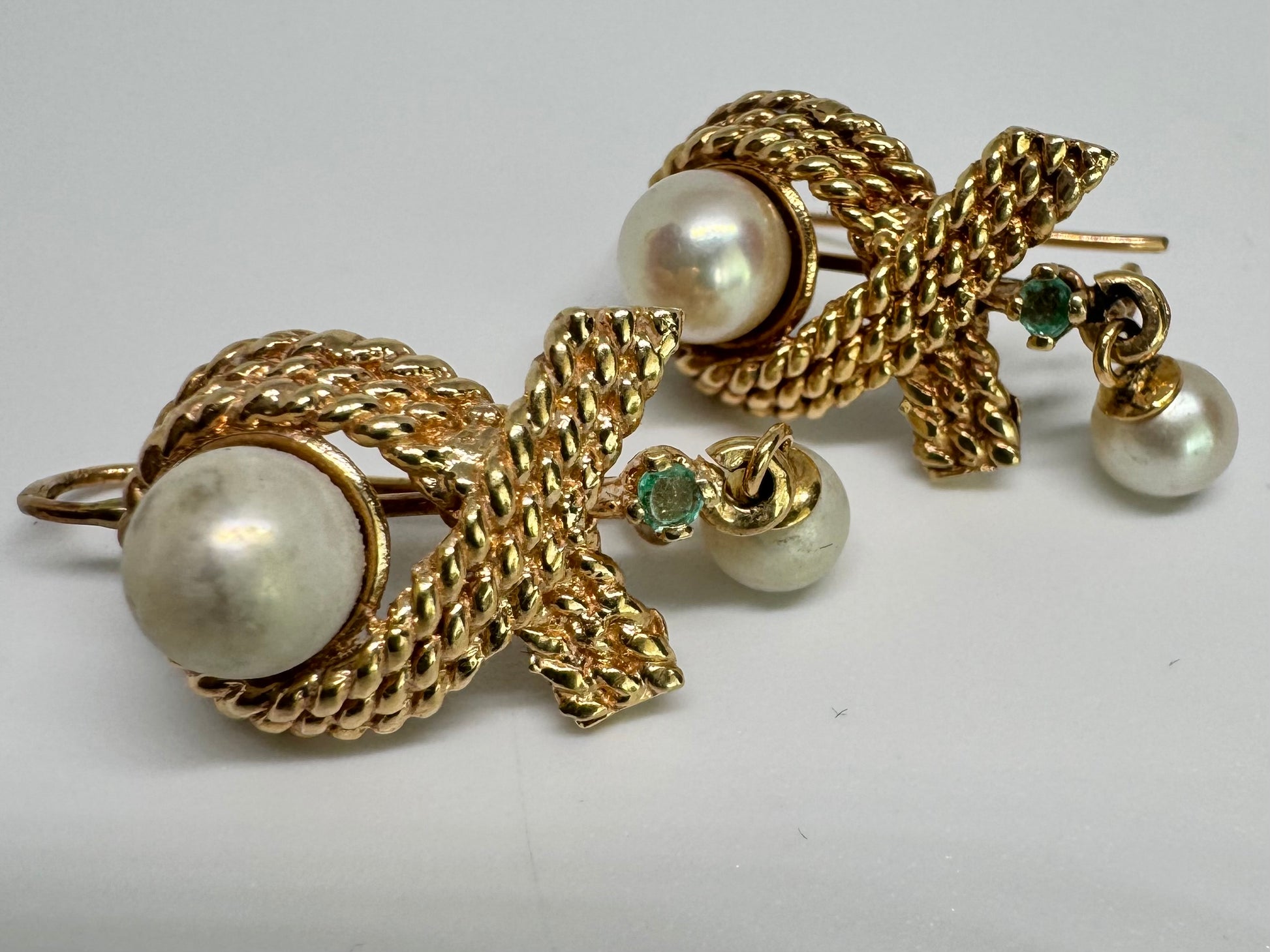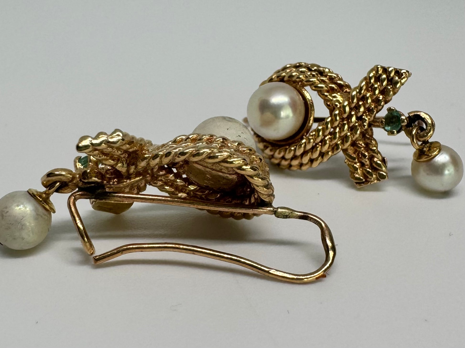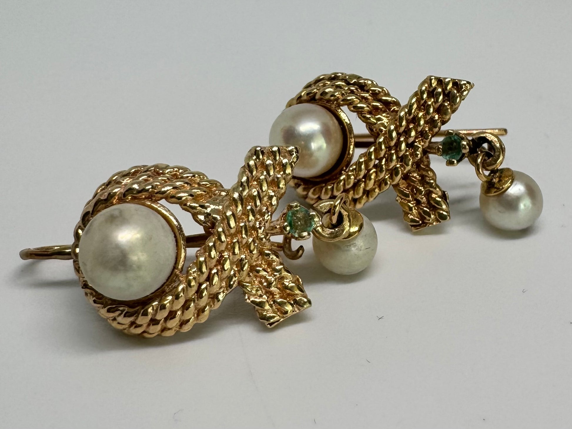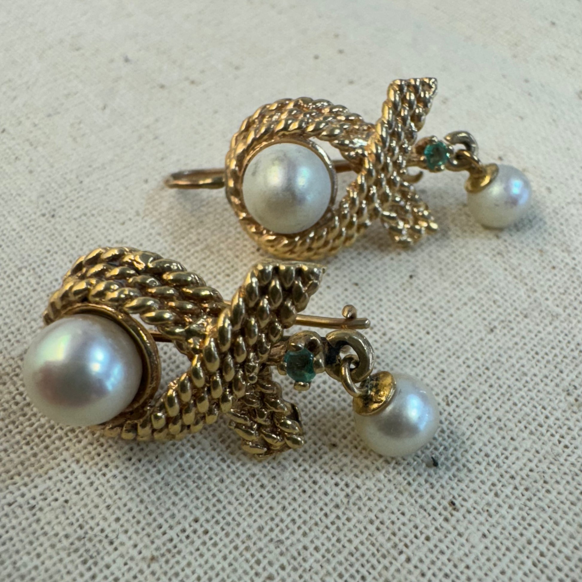 עגילי זהב צהוב 14 קראט משובצים פנינה ואמרלד