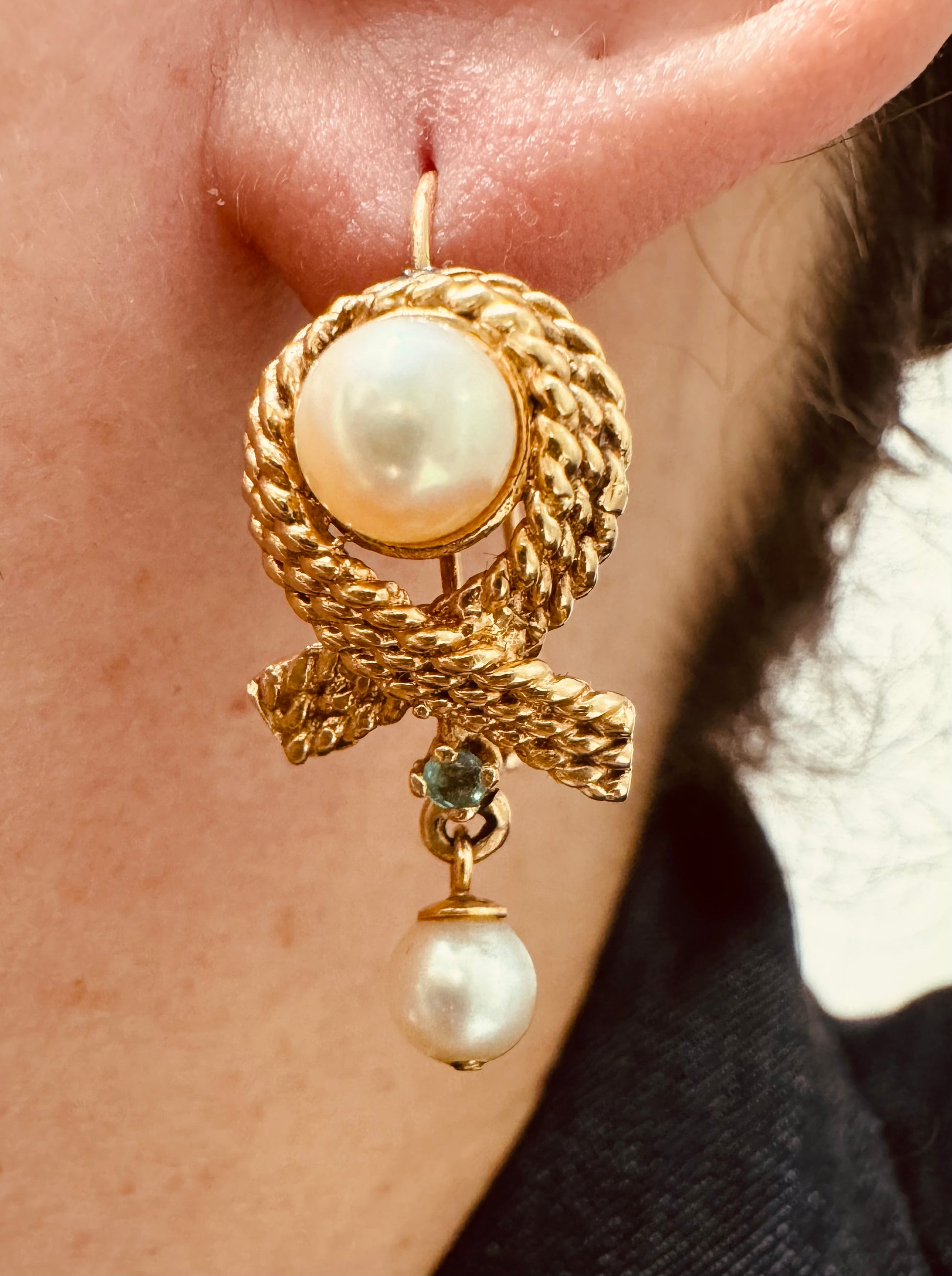 עגילי טיפה זהב צהוב 14K משובצים עם פנינה ואזמרגד.