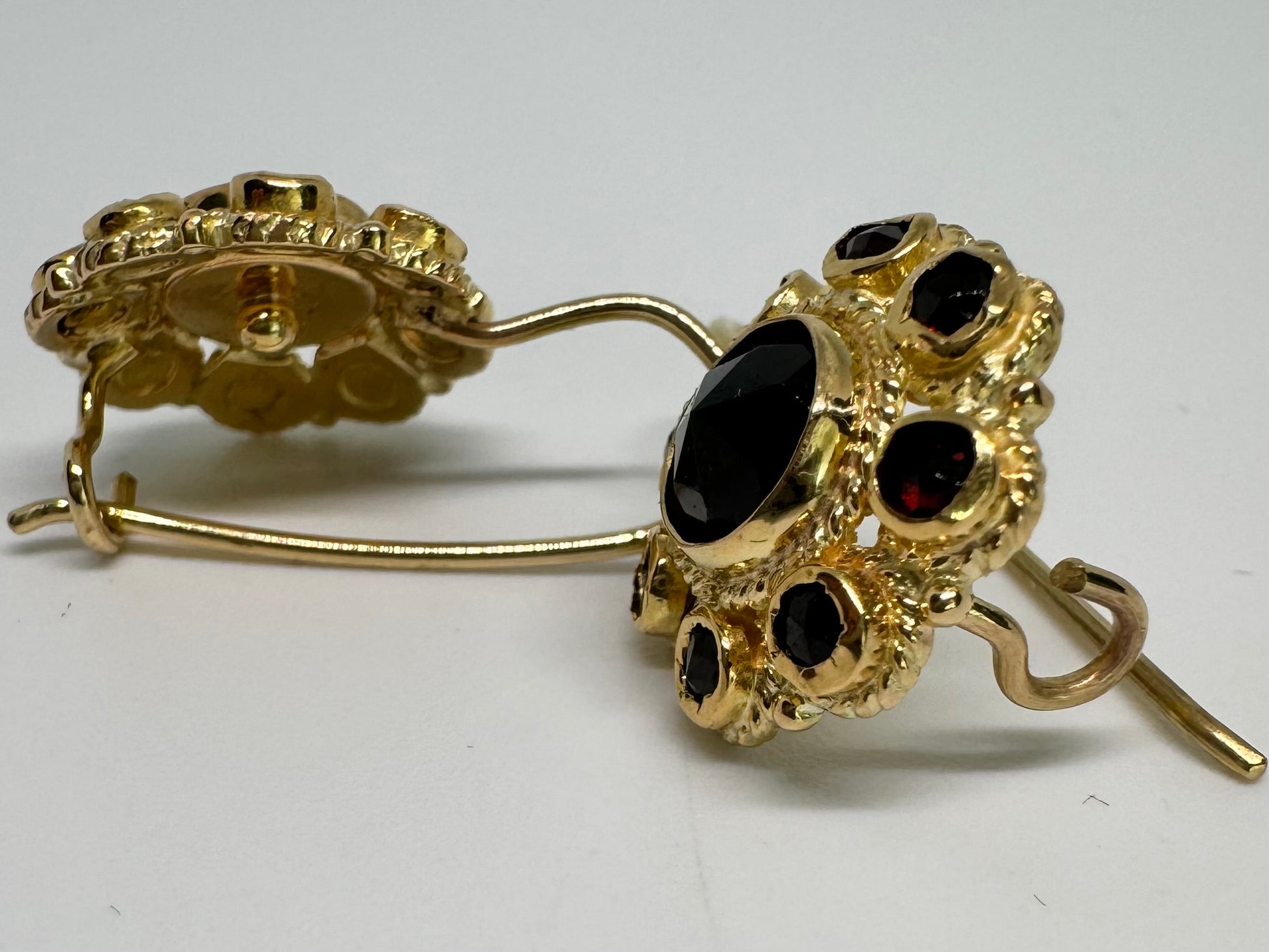 עגילי זהב צהוב 18 קראט, נופלים באורך בינוני, משובצים אבני גרנט.