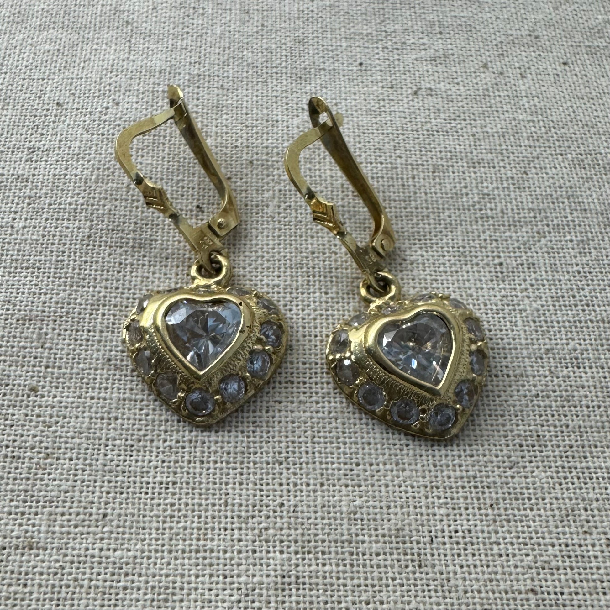 14K yellow gold drop earrings set with a heart-cut central stone & surrounded by a halo of delicate gems.