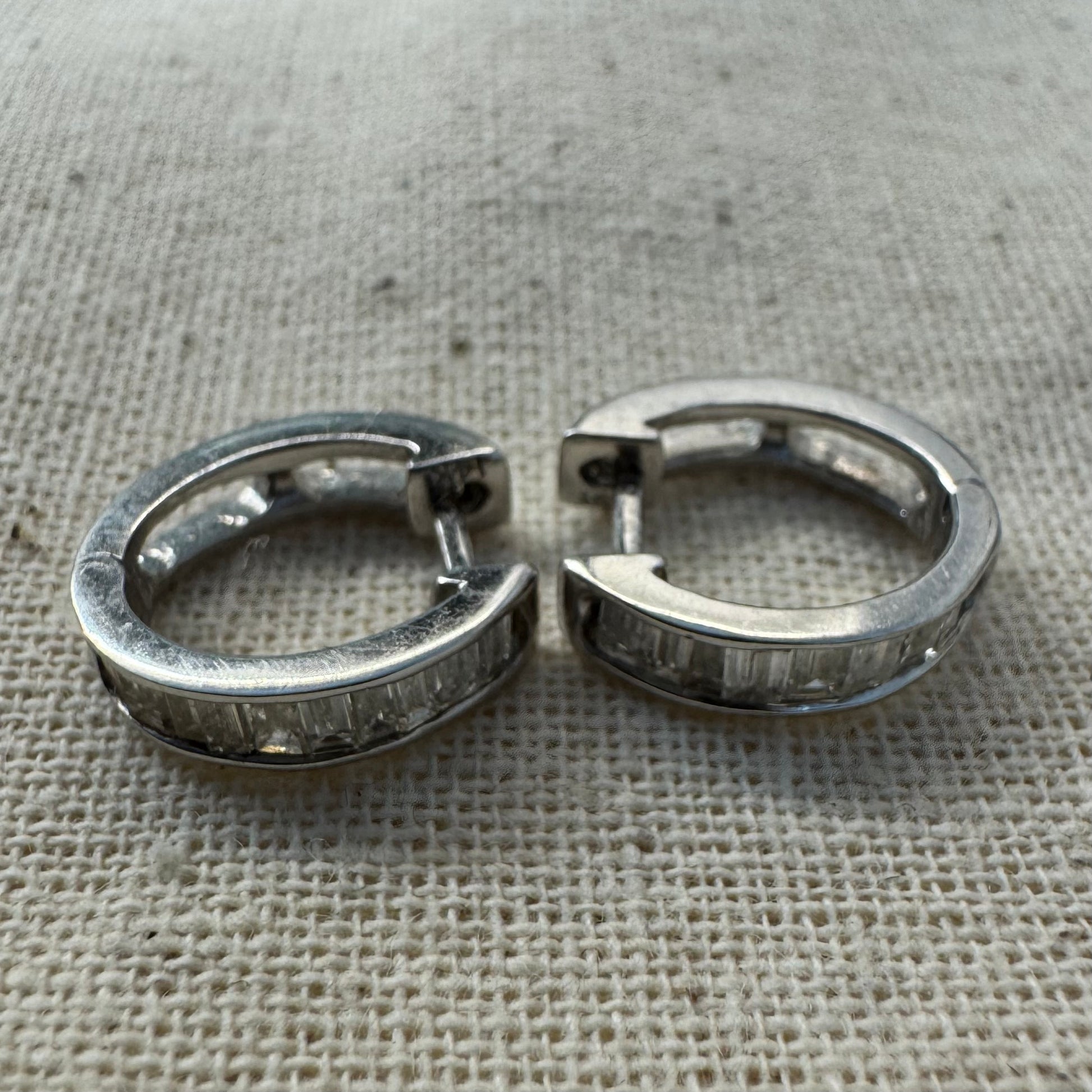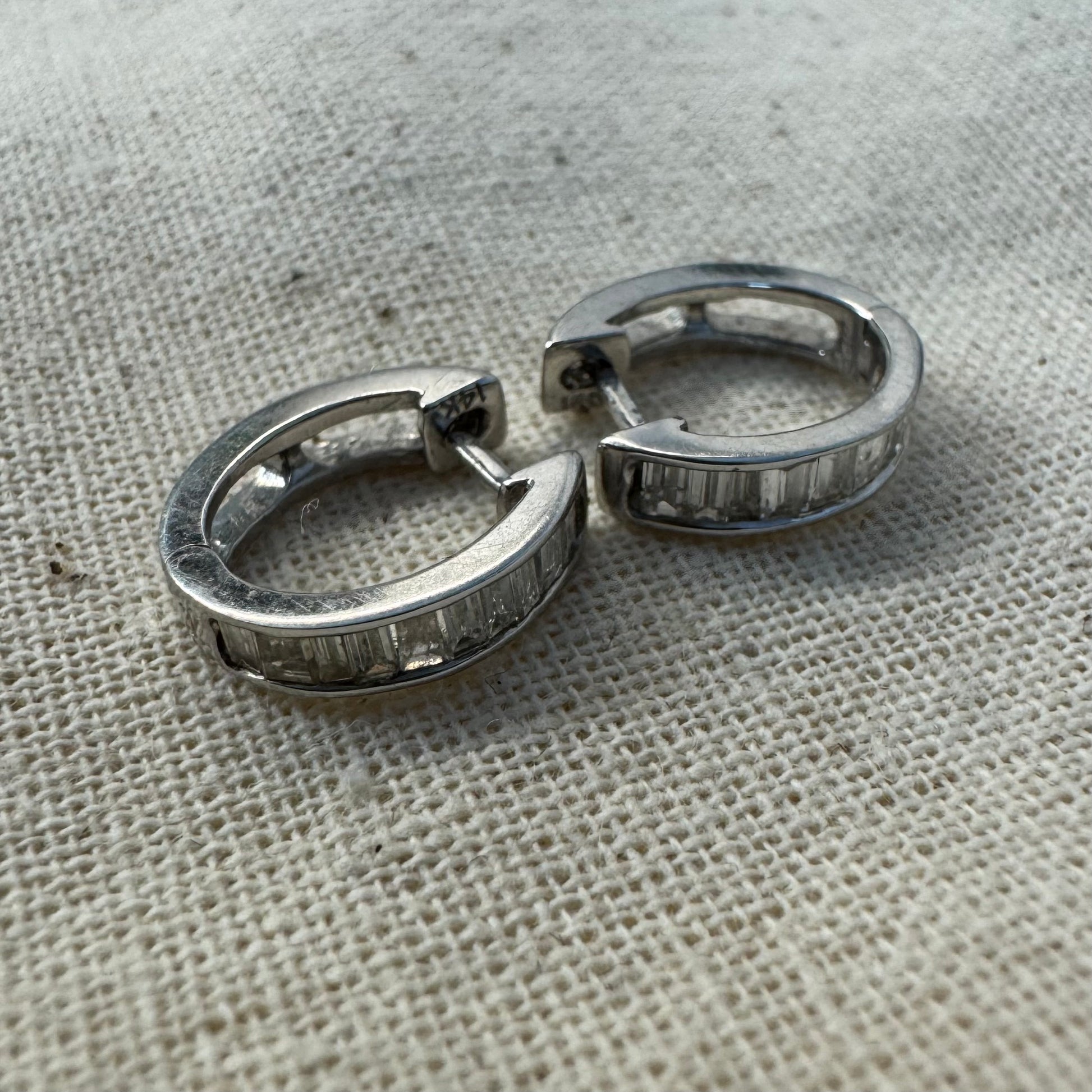 עגיל חישוק זהב לבן 14 קראט משובצים בשורת יהלומים בחיתוך באגט – ליטוש גיאומטרי שמעניק מראה יוקרתי ומעודן במיוחד.