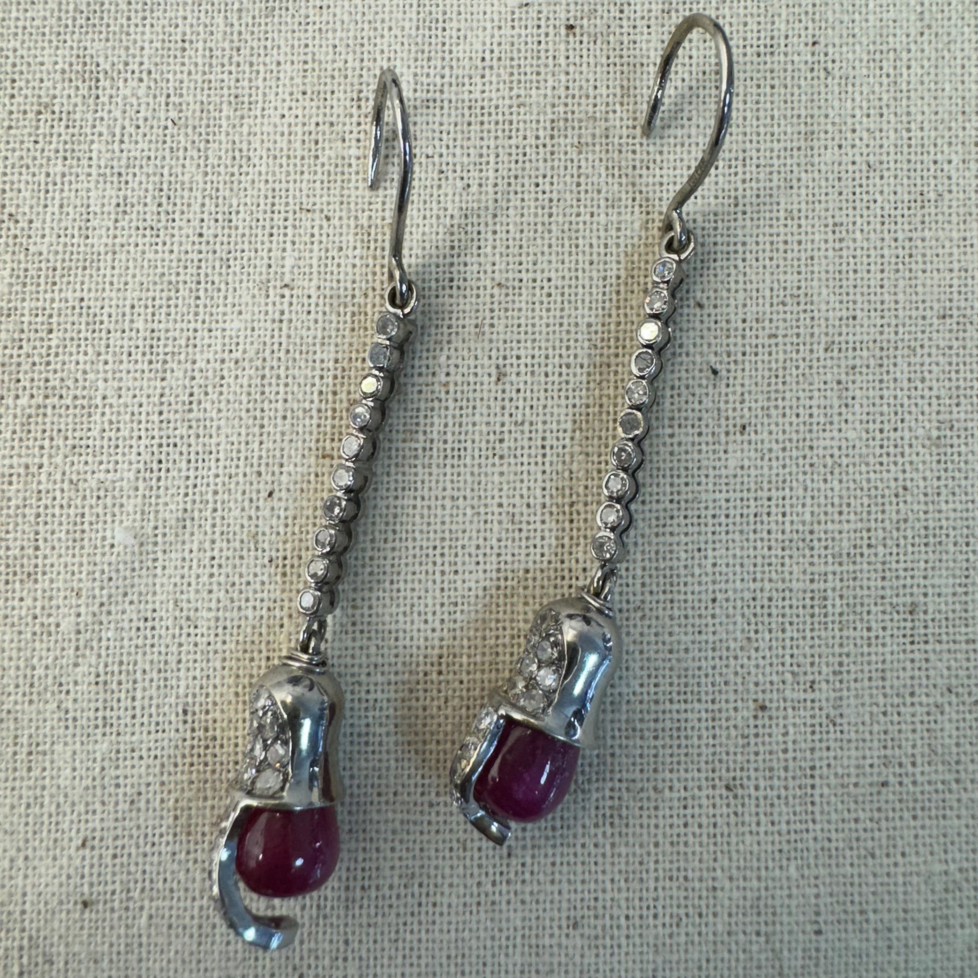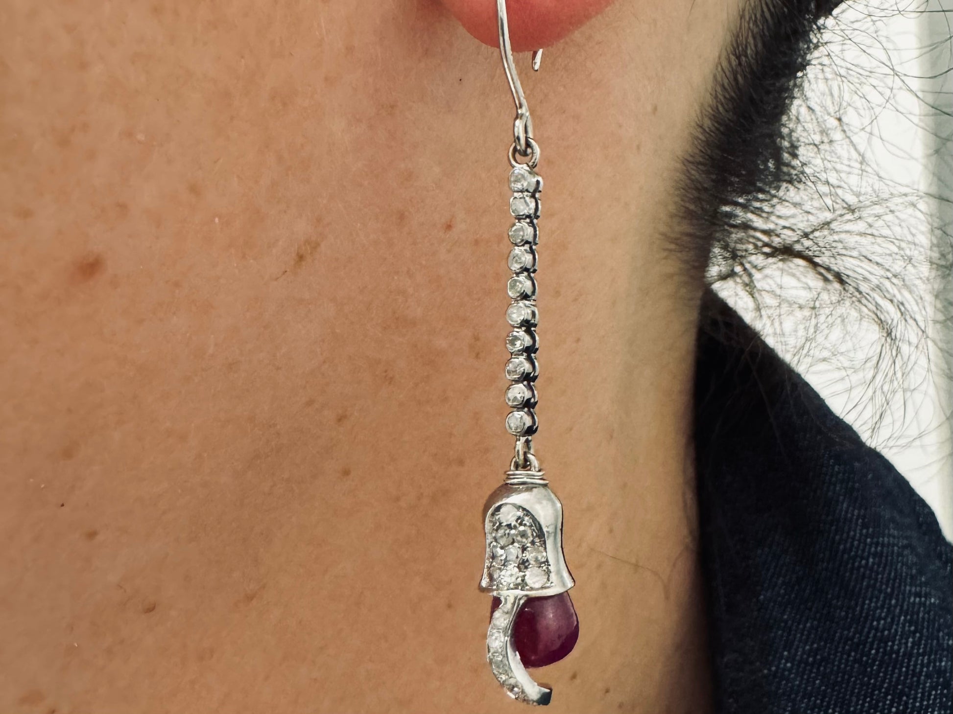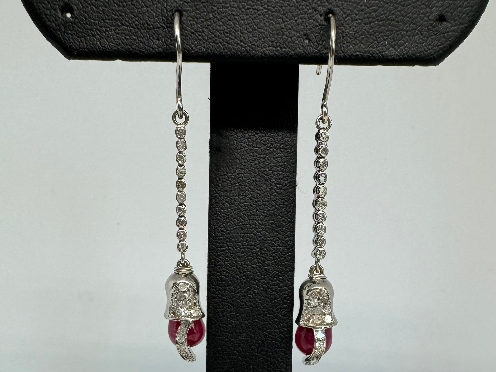 עגילי טיפה זהב לבן 18K משובצים רובי ויהלומים
