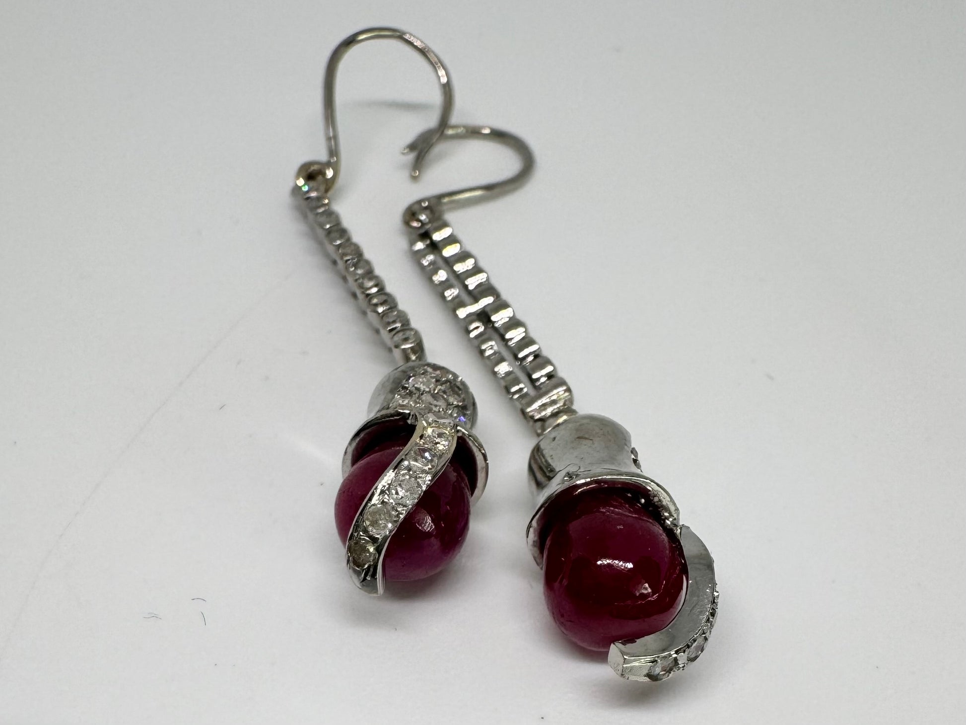 עגילי זהב לבן 18 קראט, נופלים ארוכים, משובצים אבן רובי ויהלומים.